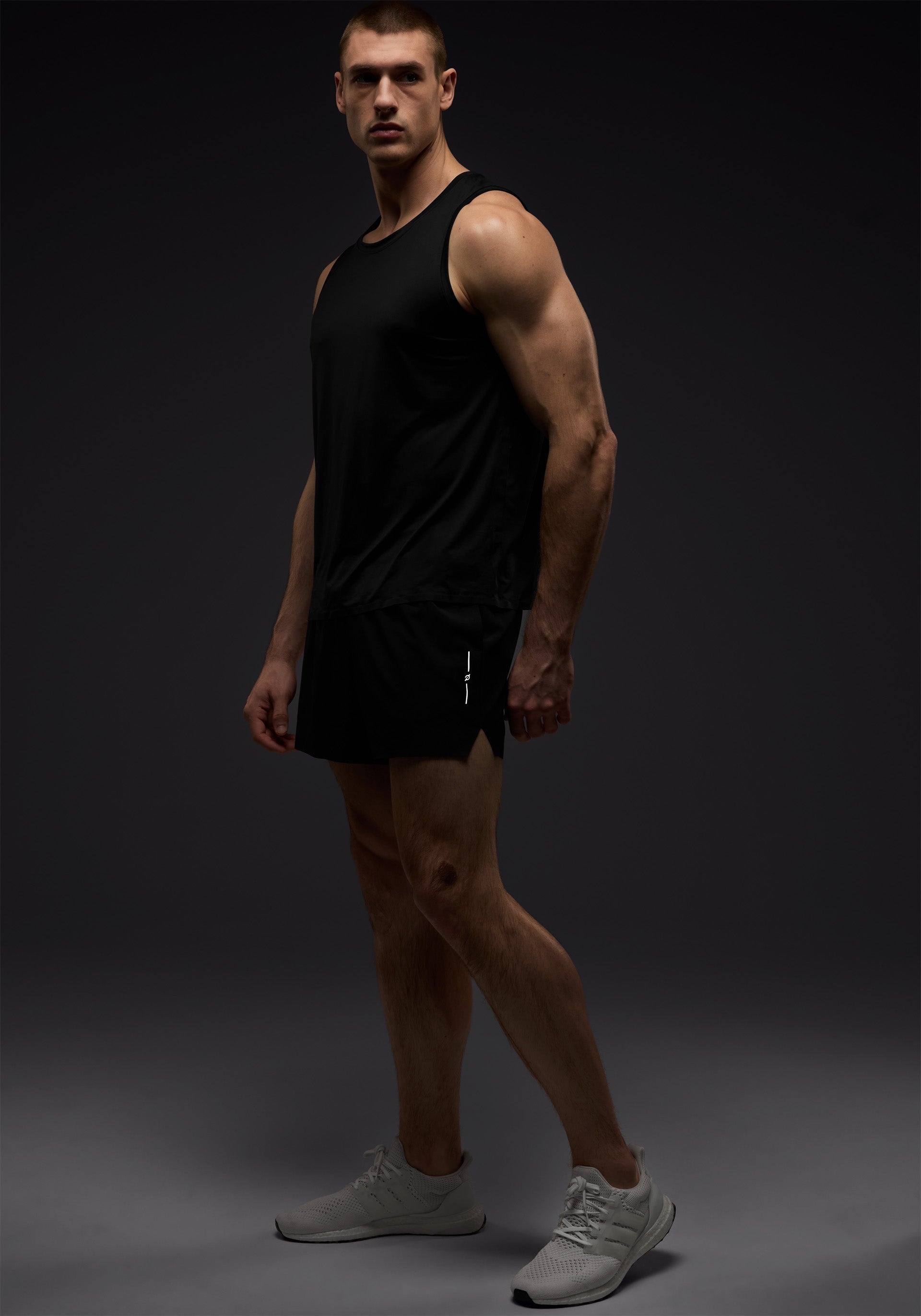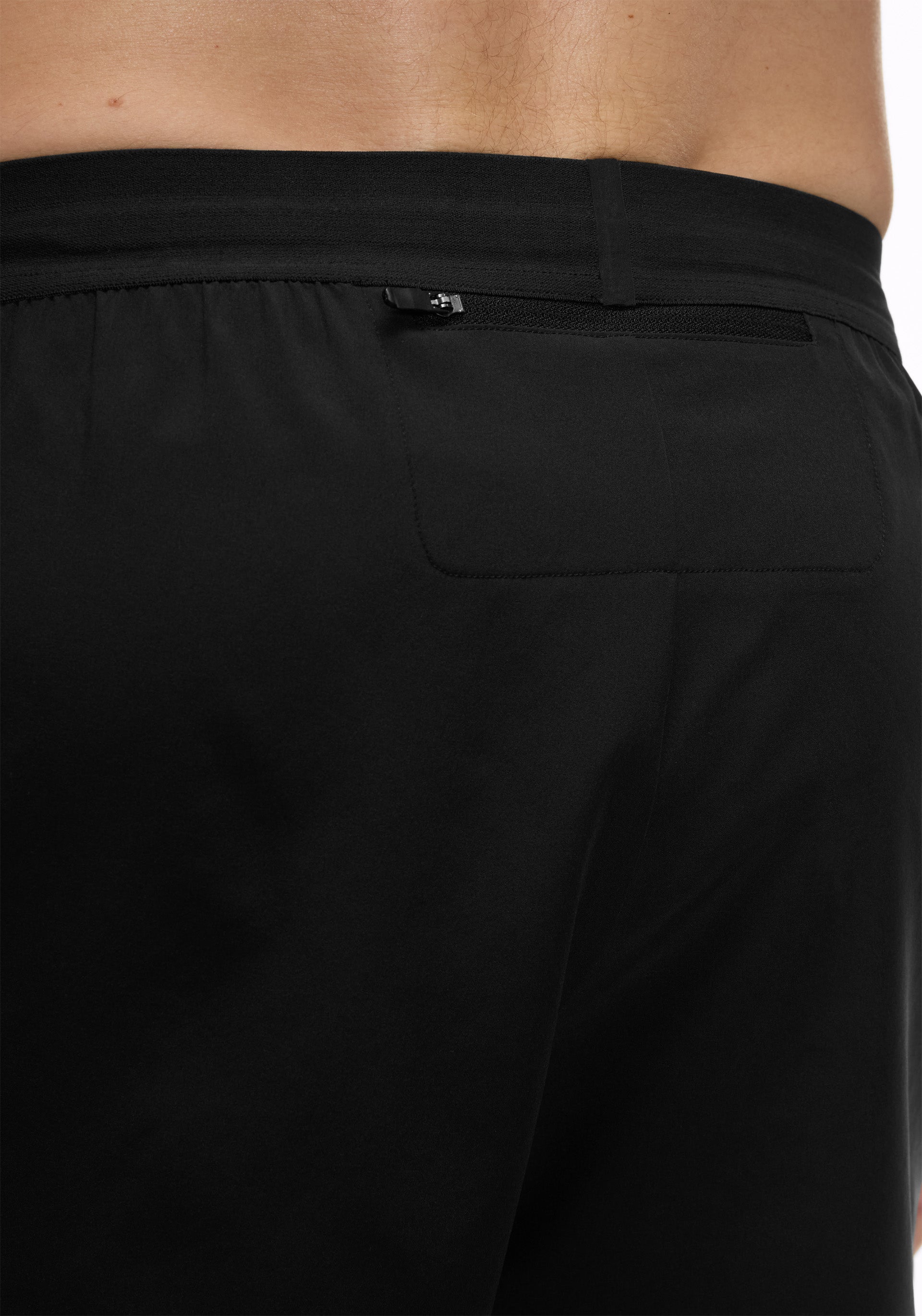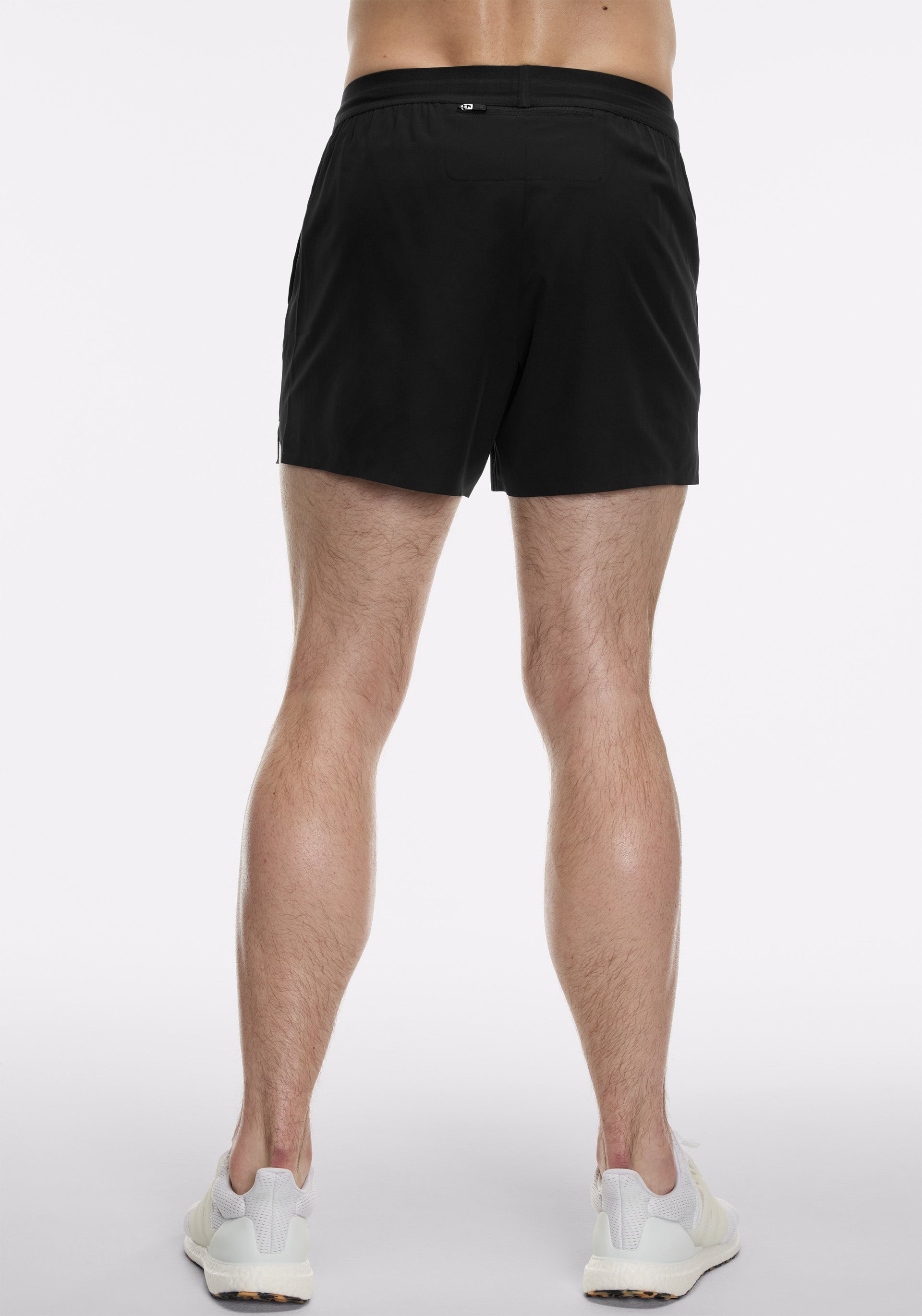 • 5" inseam brief-lined short with elastic waistband, interior drawcord, functional gusset, side hand pockets, and center back zip pocket