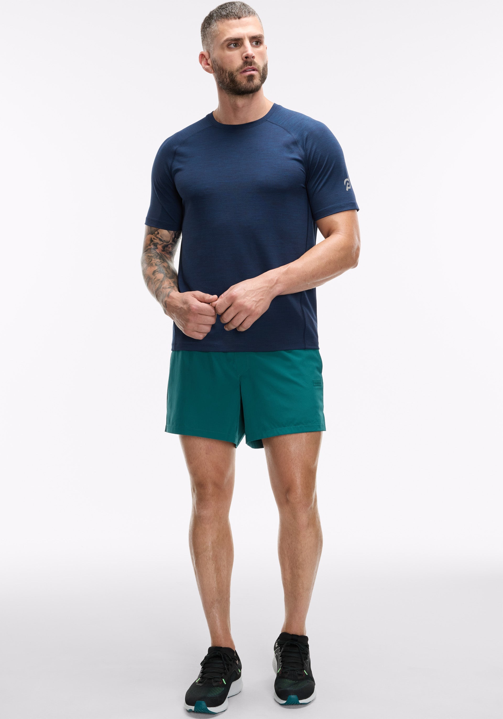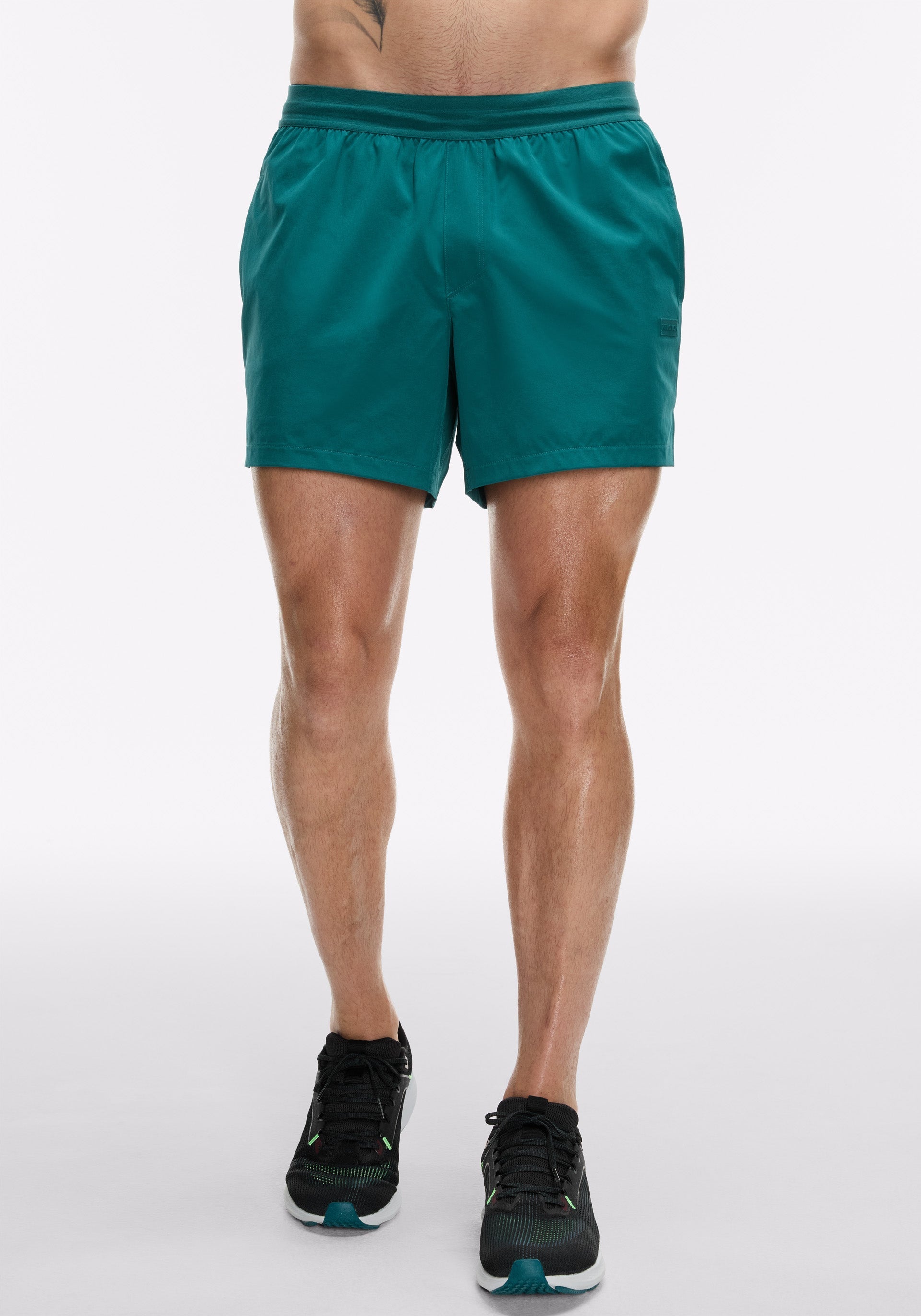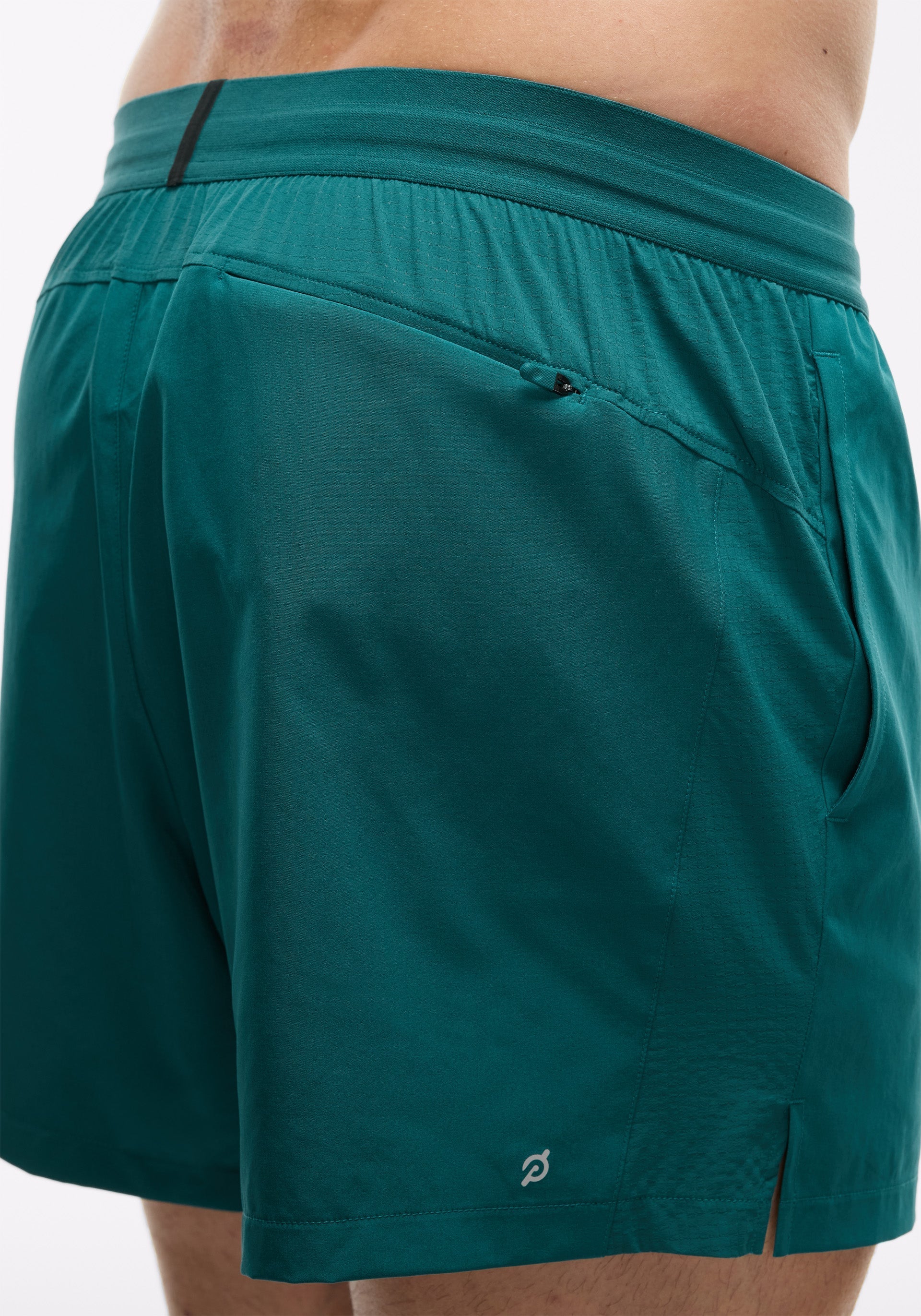 • 5” inseam, boxer-brief lined short with exposed elastic waistband, interior drawcord, side hand pockets, grid jacquard mesh at side seam, and back zip pocket