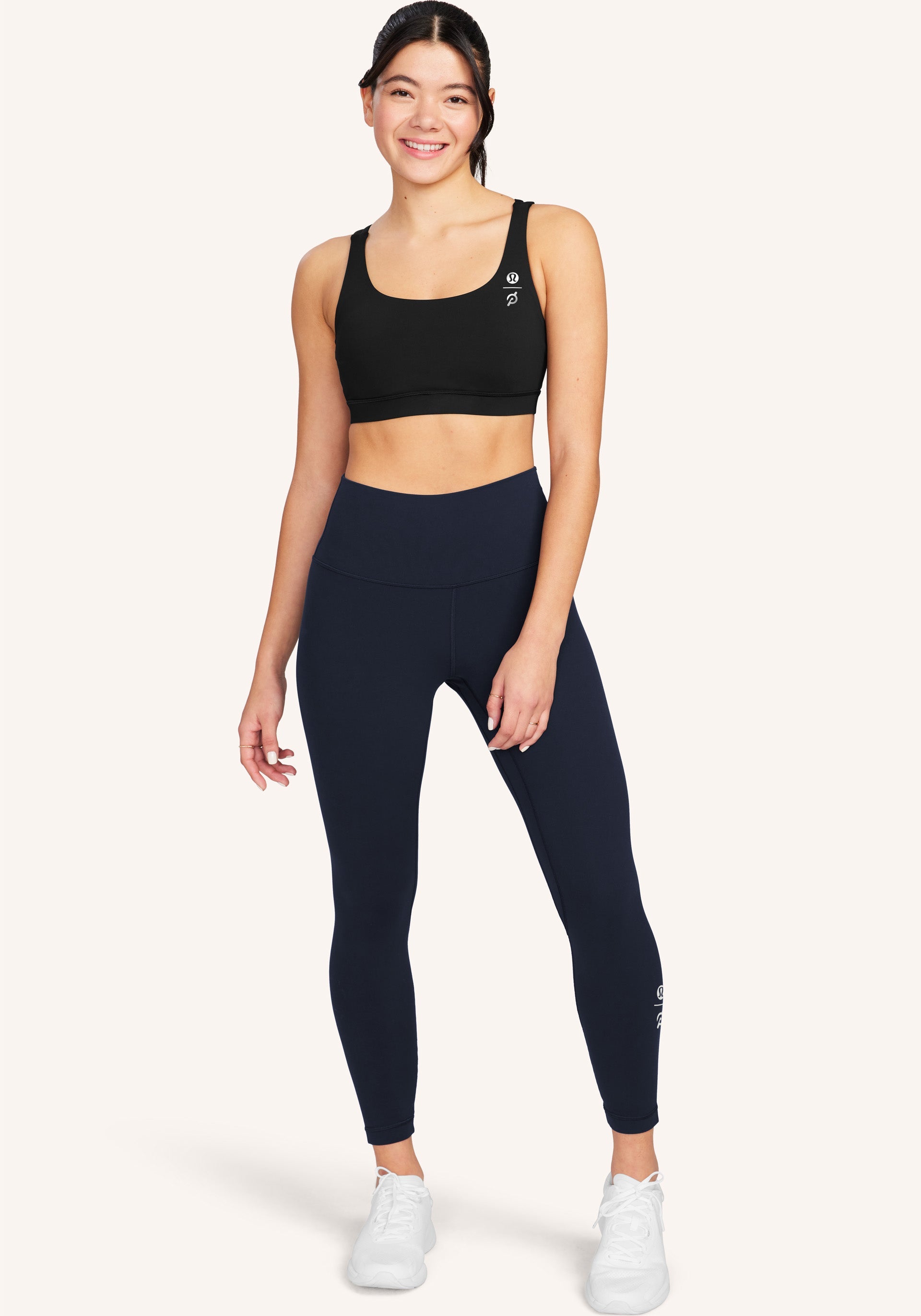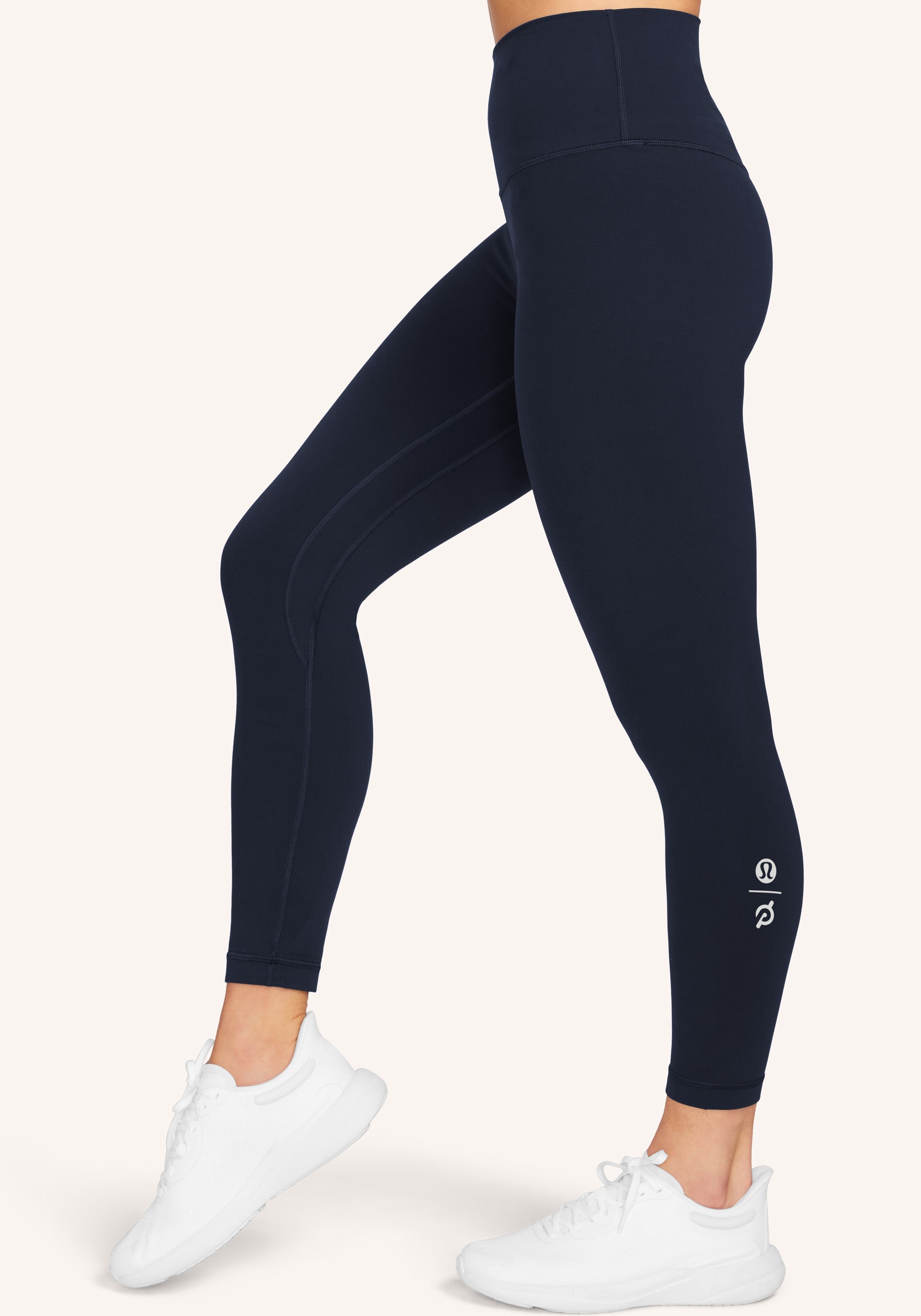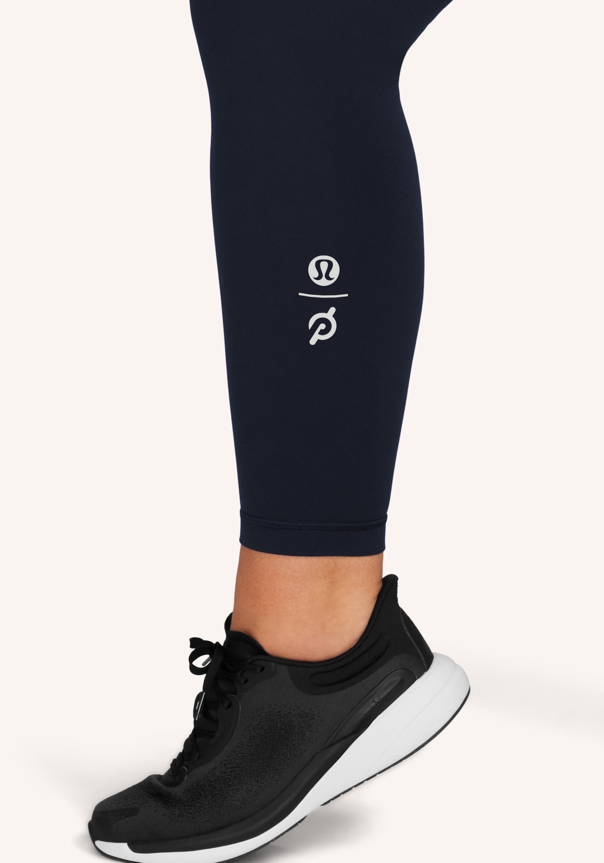 lululemon x Peloton logo lockup at left calf