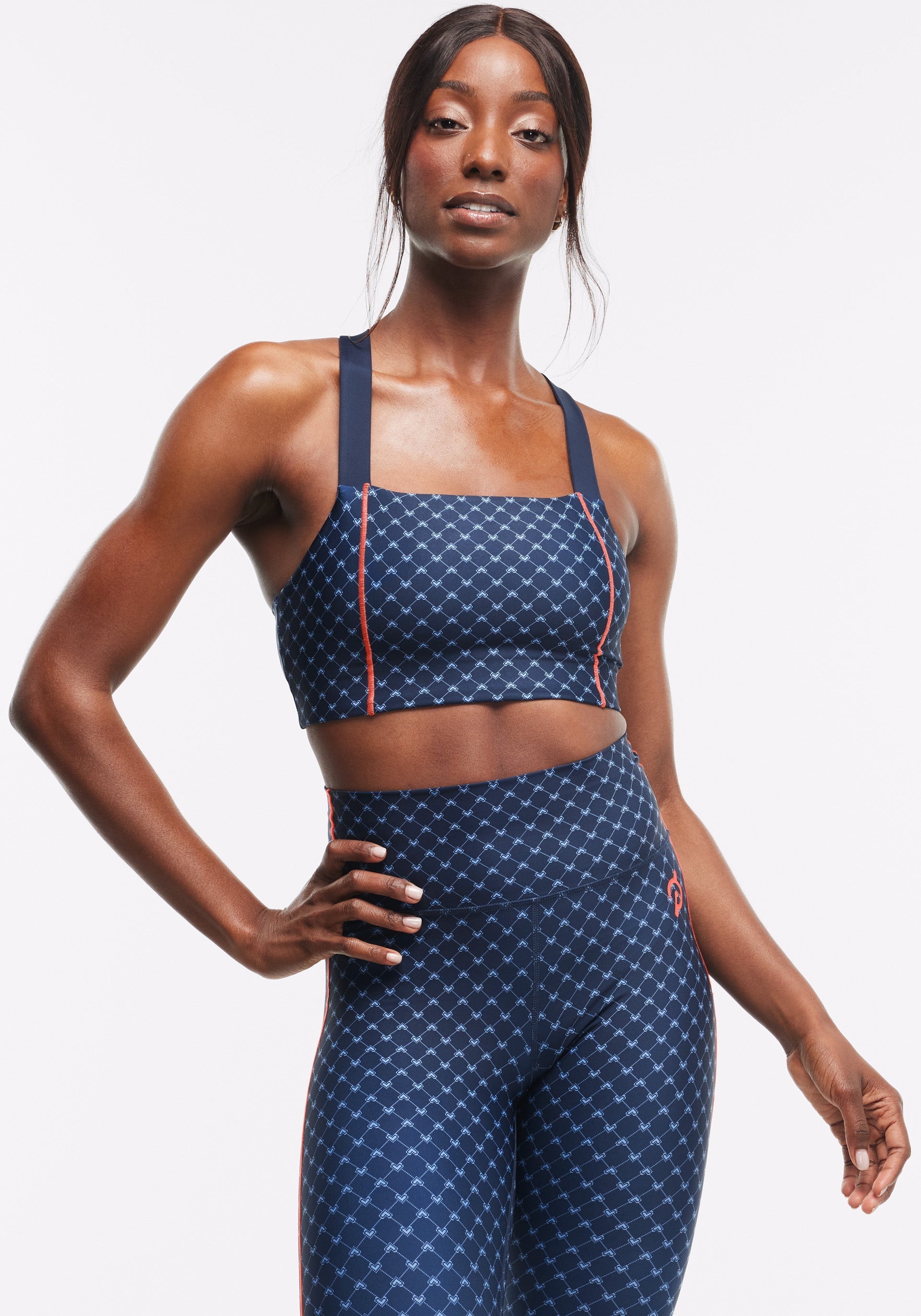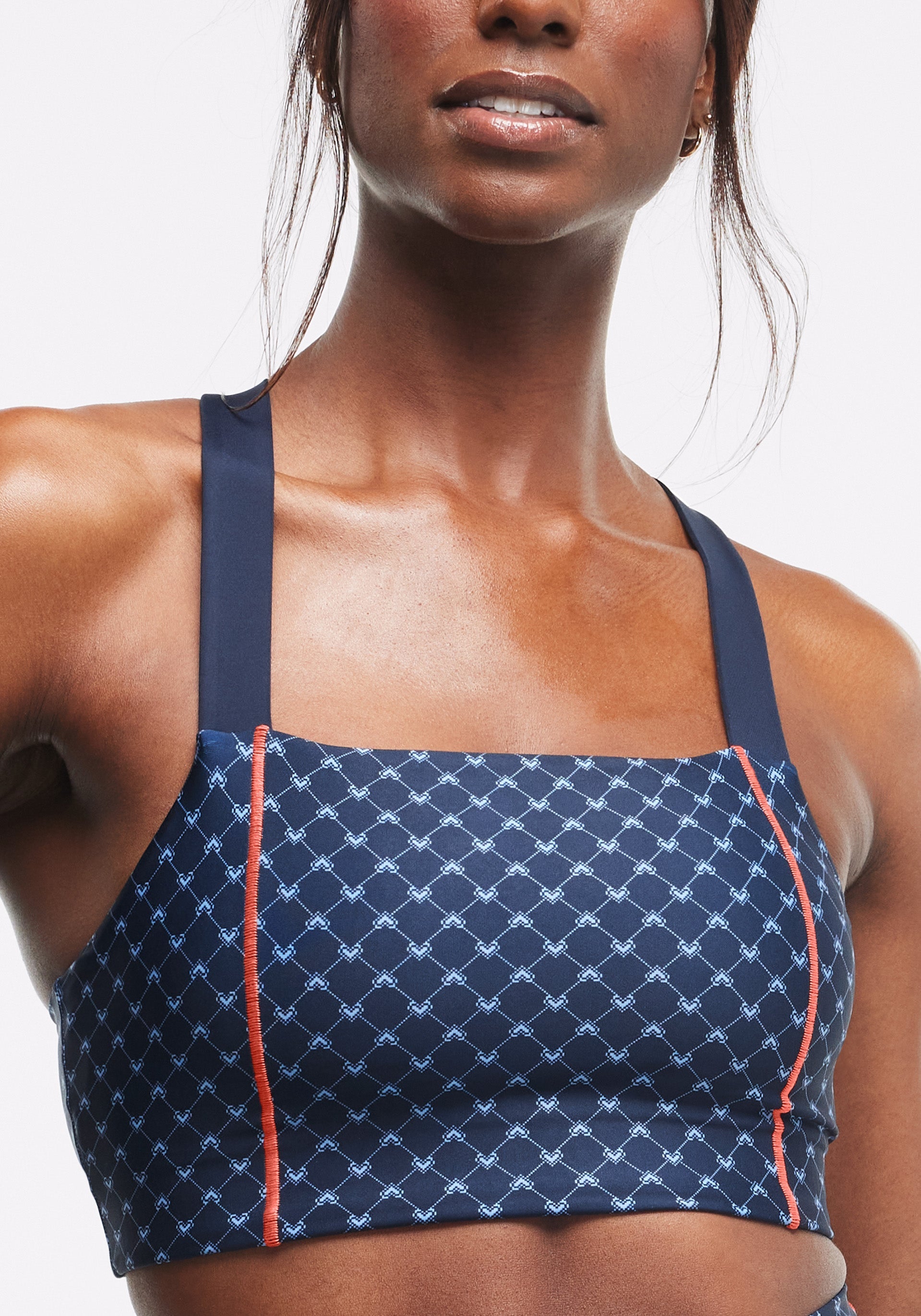• Low-Medium support square neck bra with contrast stitch, elastic straps, interior sweat channel encased elastic band, and removable cup pads