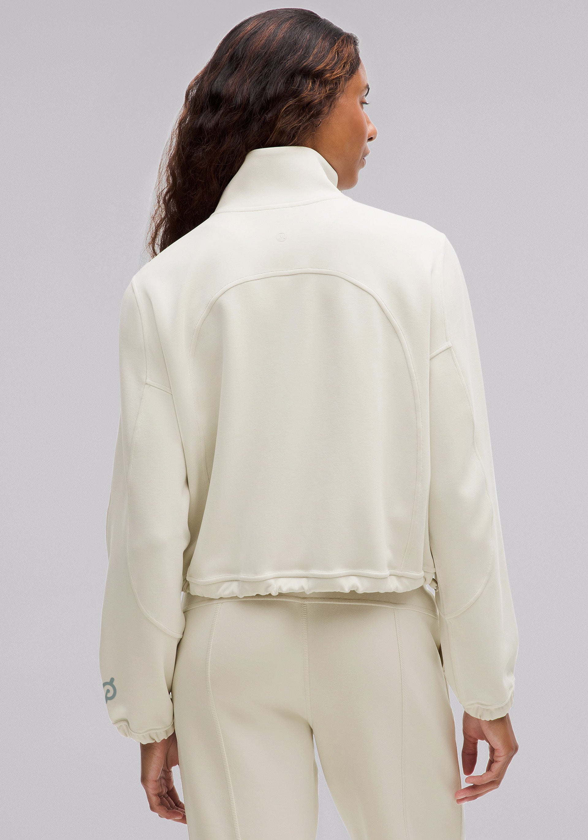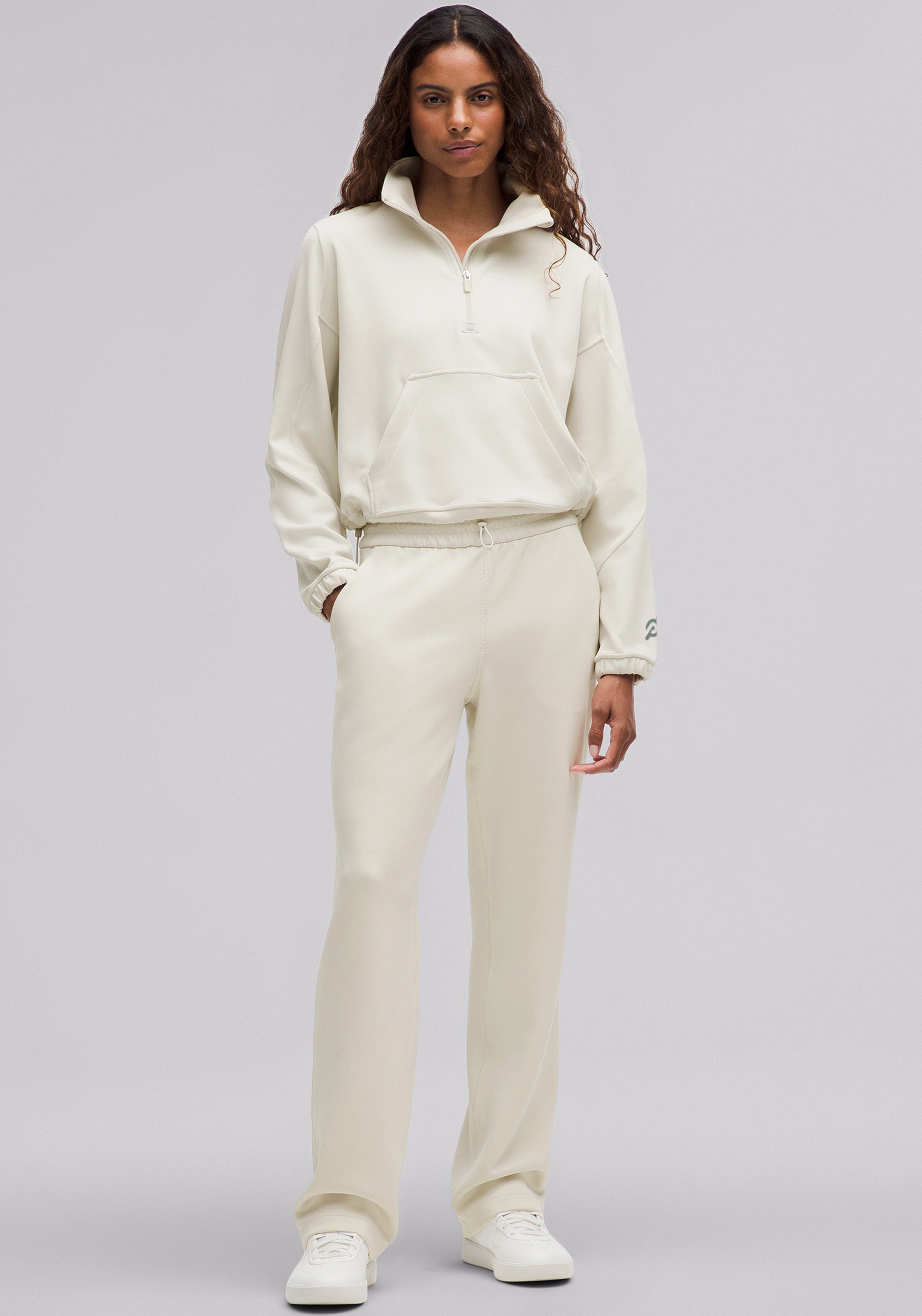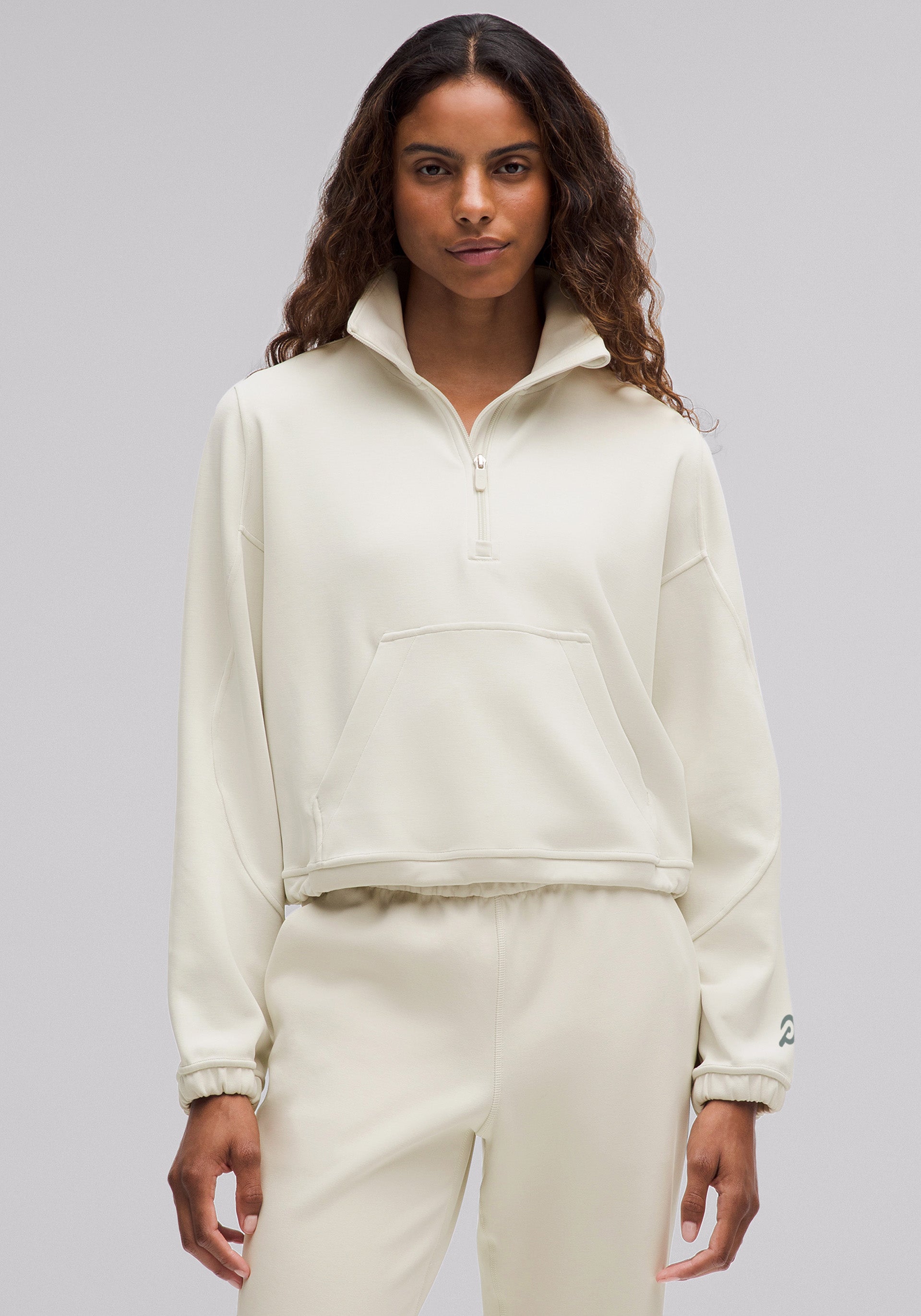 Relaxed half zip with kangaroo pocket, hidden card sleeve, zipper garage and placket, and a cinchable hem for a custom fit