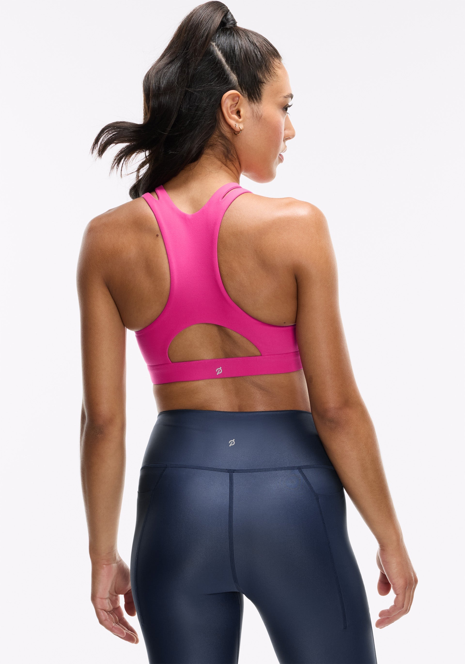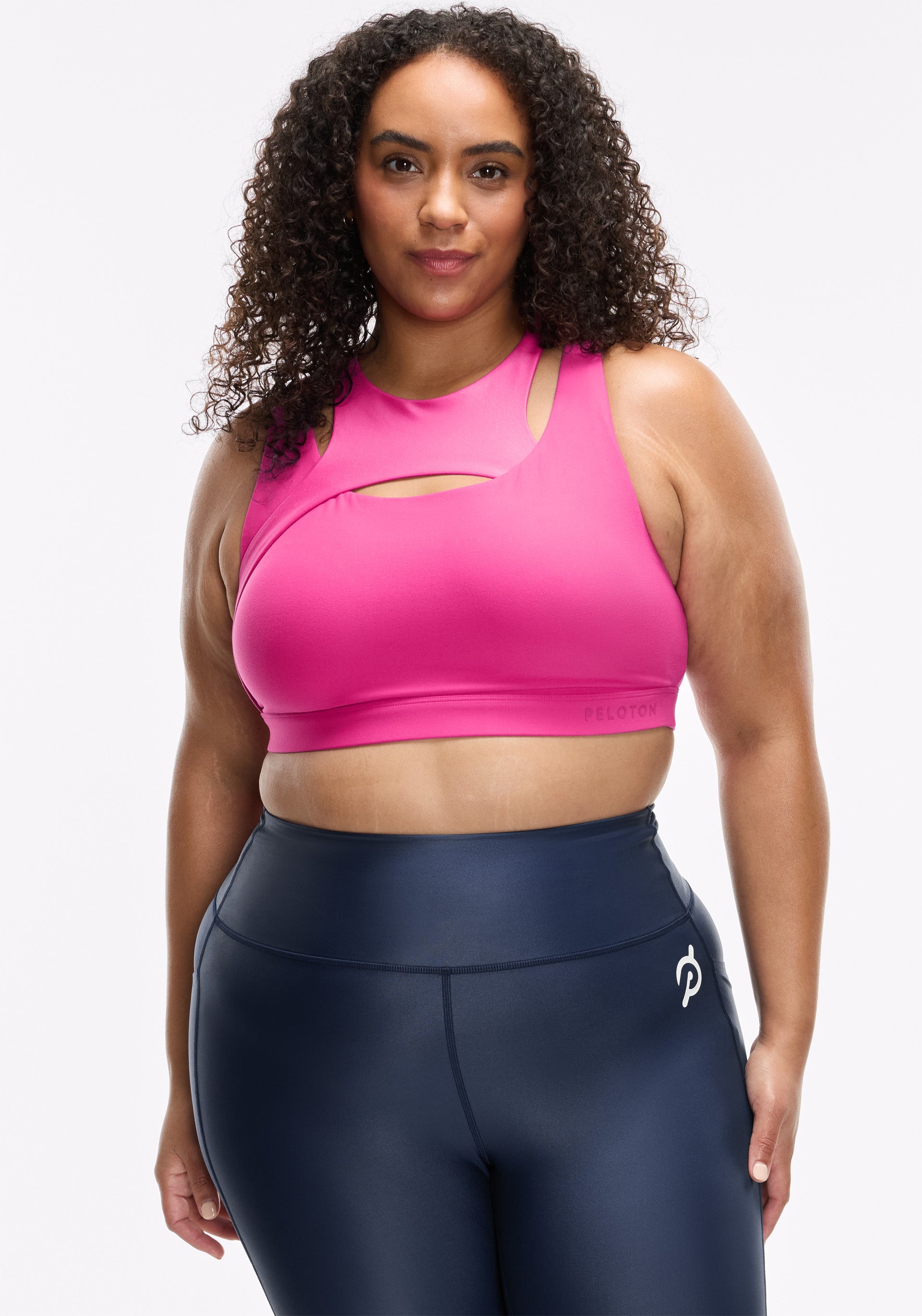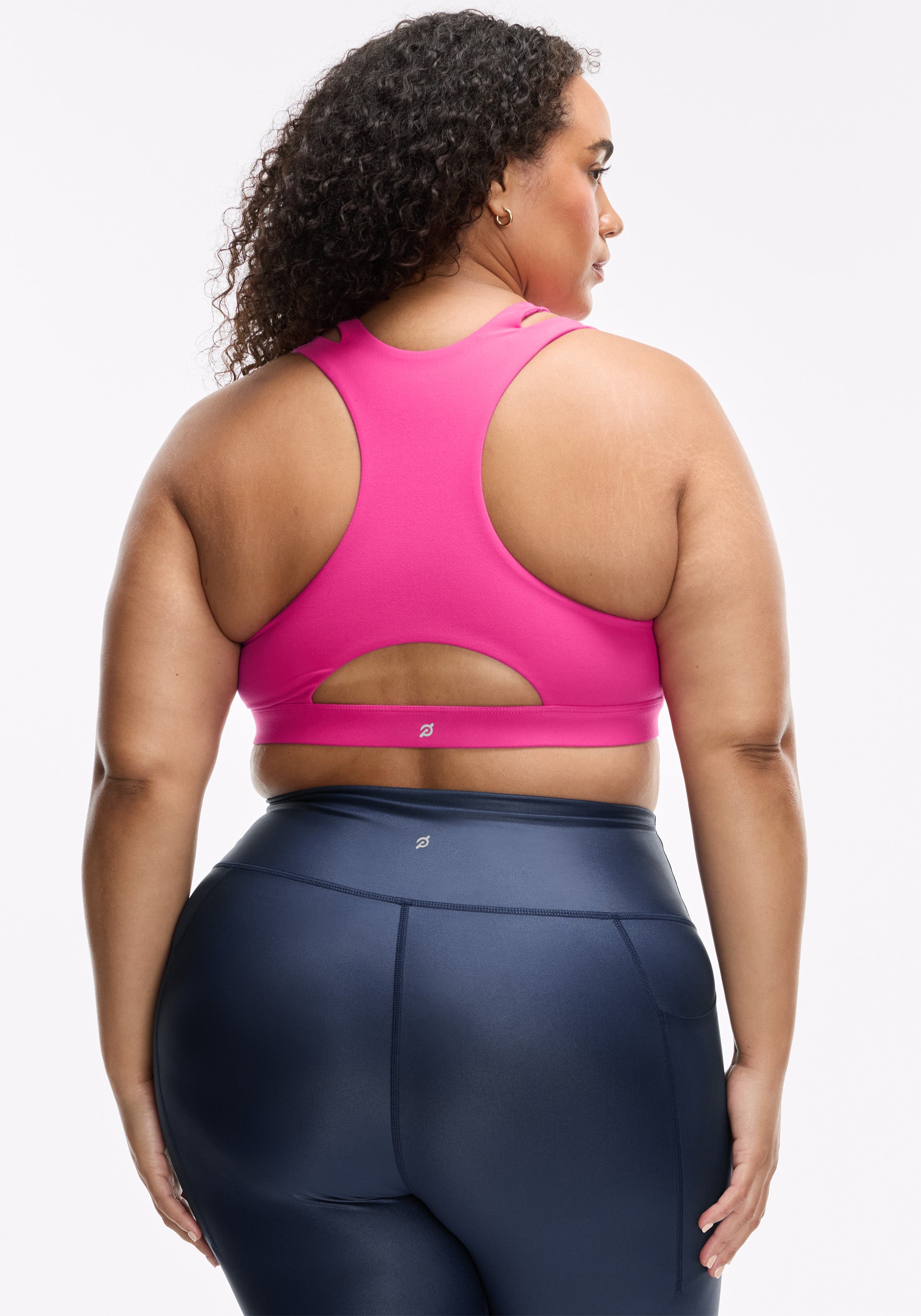 • Racerback bra with asymmetrical, shimmer glaze cut out, back keyhole and removable cup pads