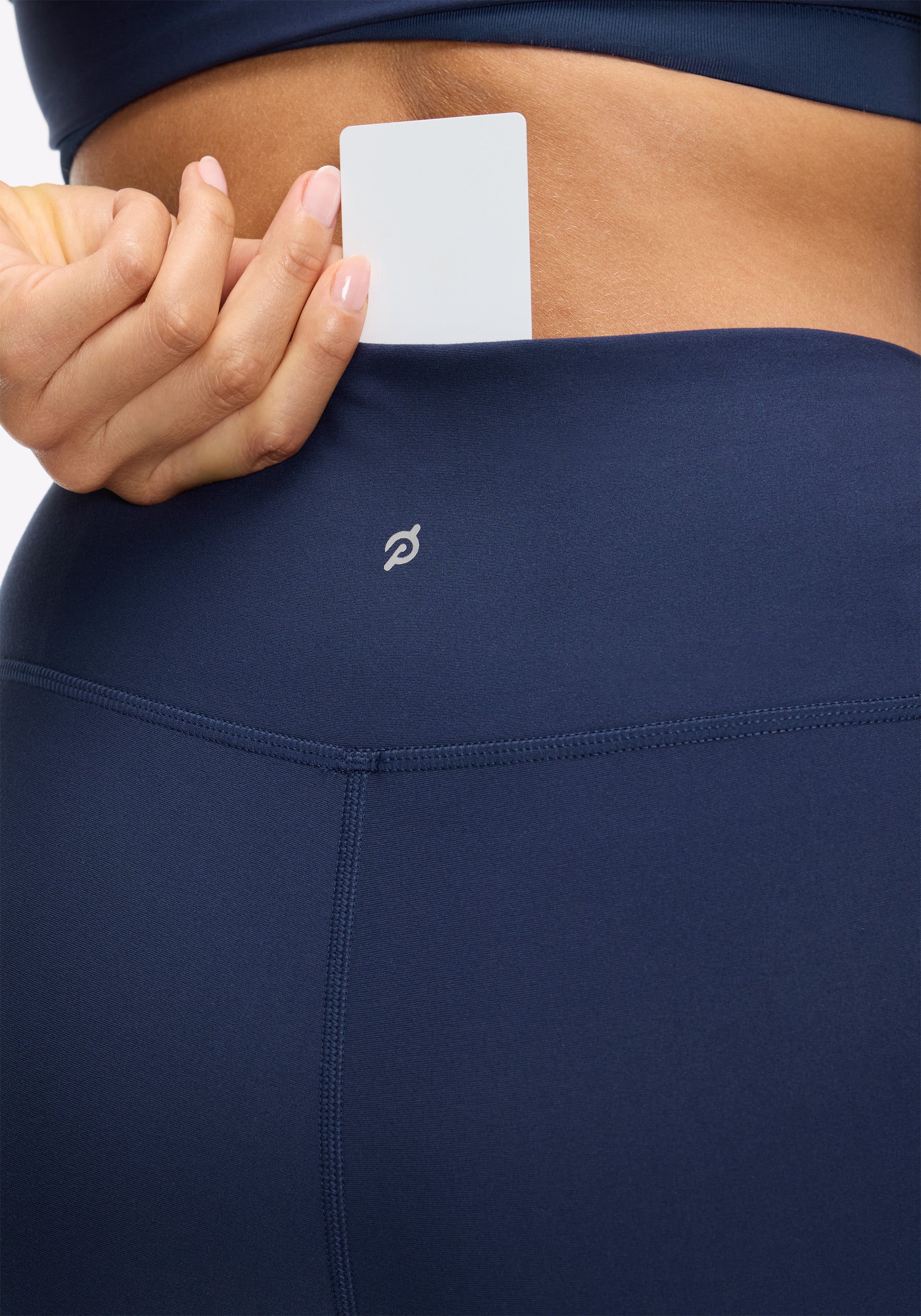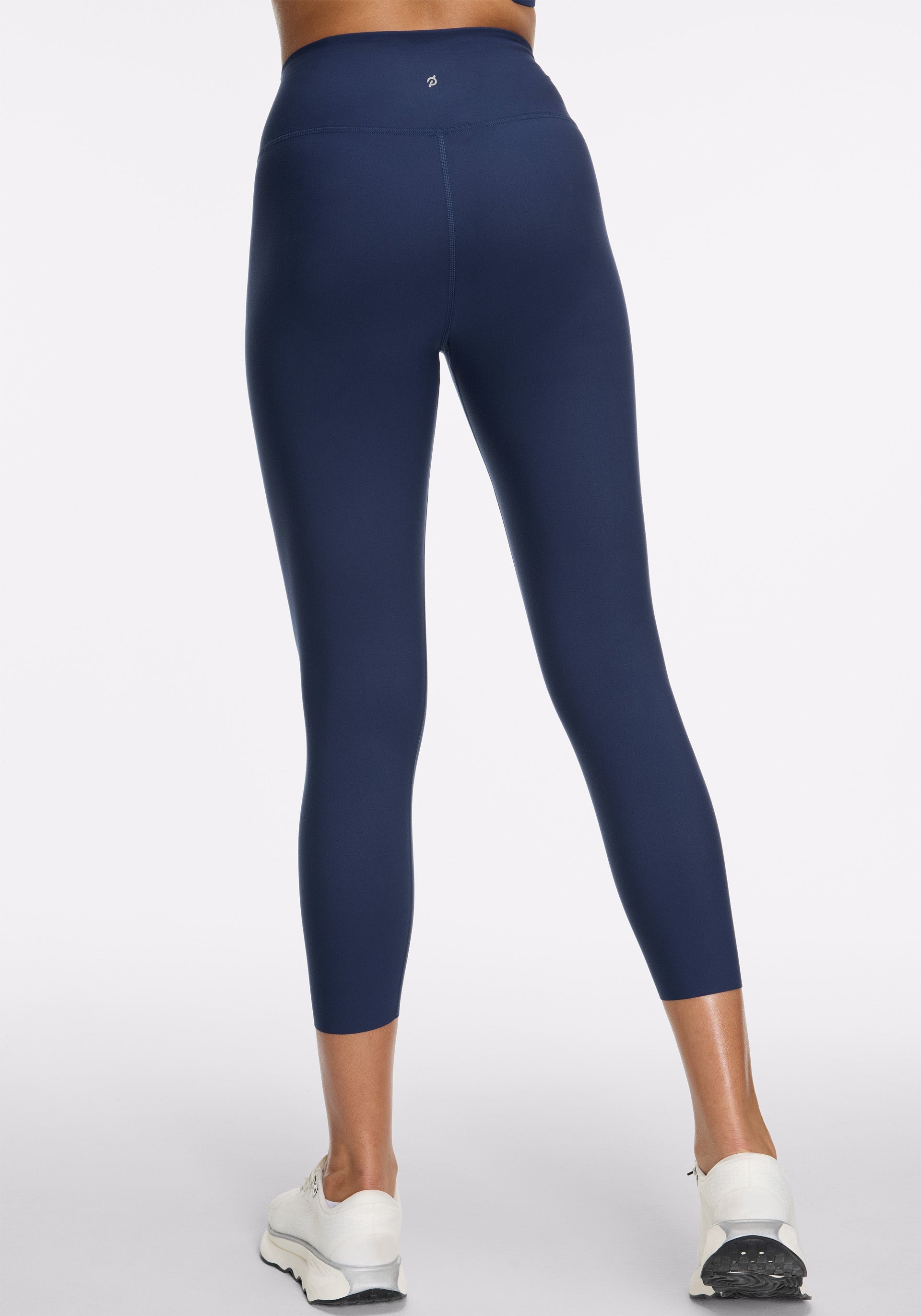 • High rise, 21” inseam capri with medium compression, back stash pocket, and elongated gusset