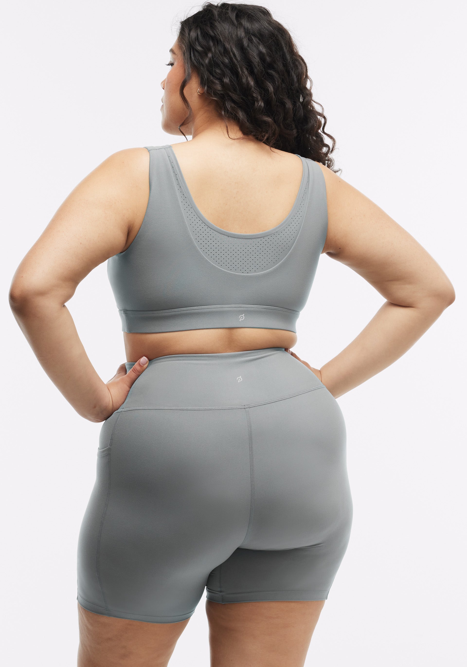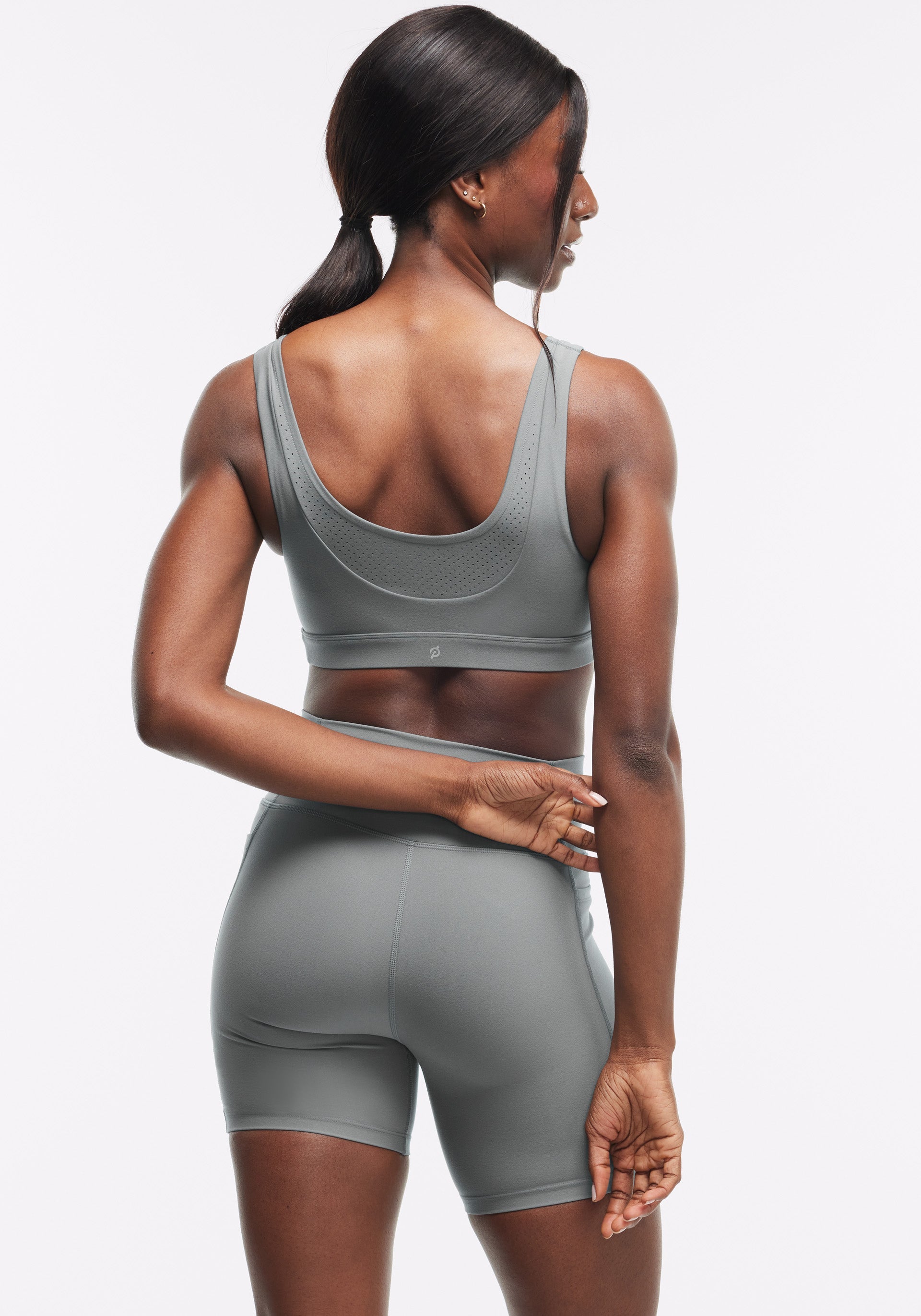 •  Low-Medium support bra with laser perforated ventilation at front and back, projection seams for cup capacity, and removable cup pads