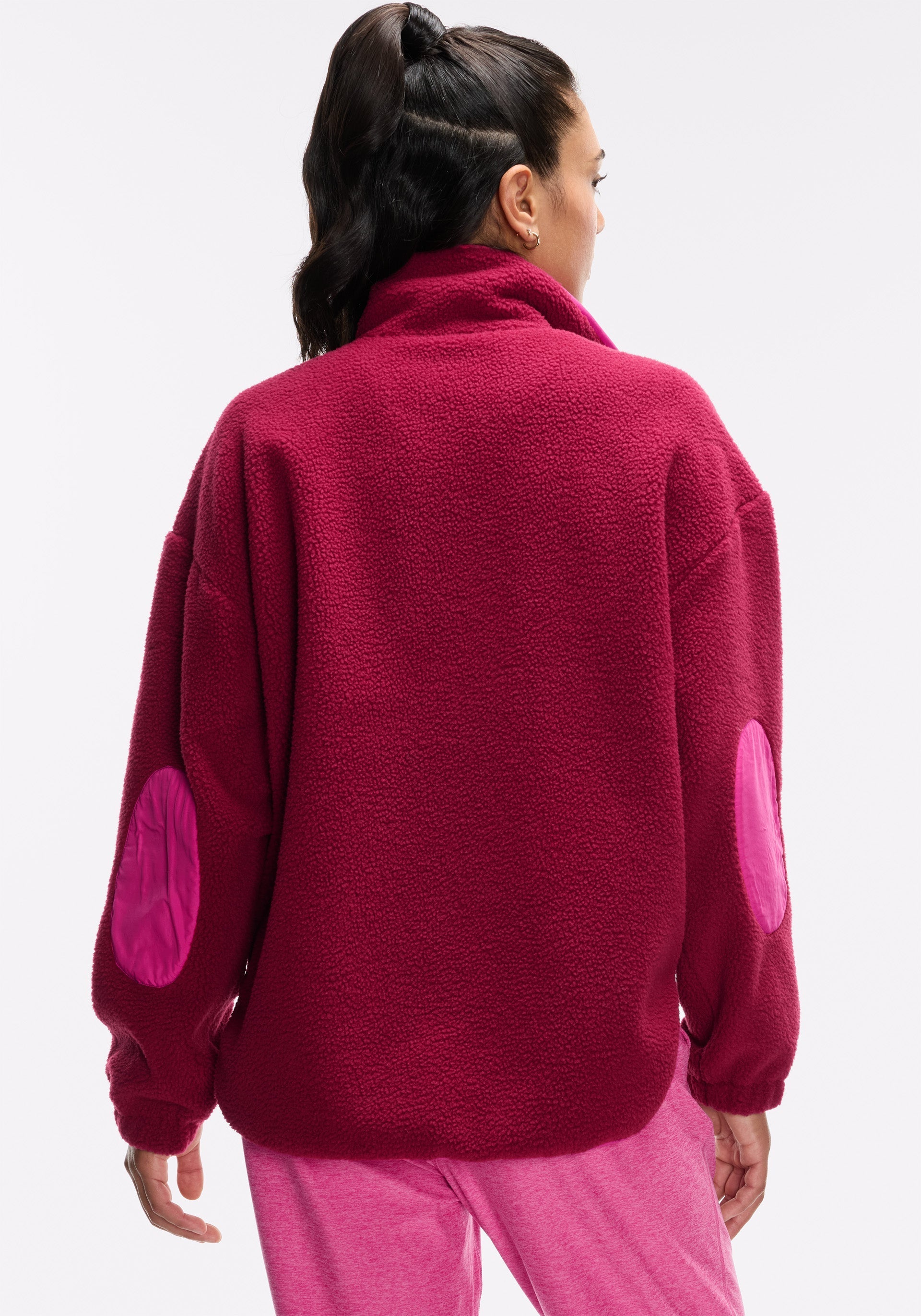 • Fully lined, cozy fleece jacket with snap placket, contrast tipping, high-low curved hem, elbow patches, hand pockets, and zip chest pocket