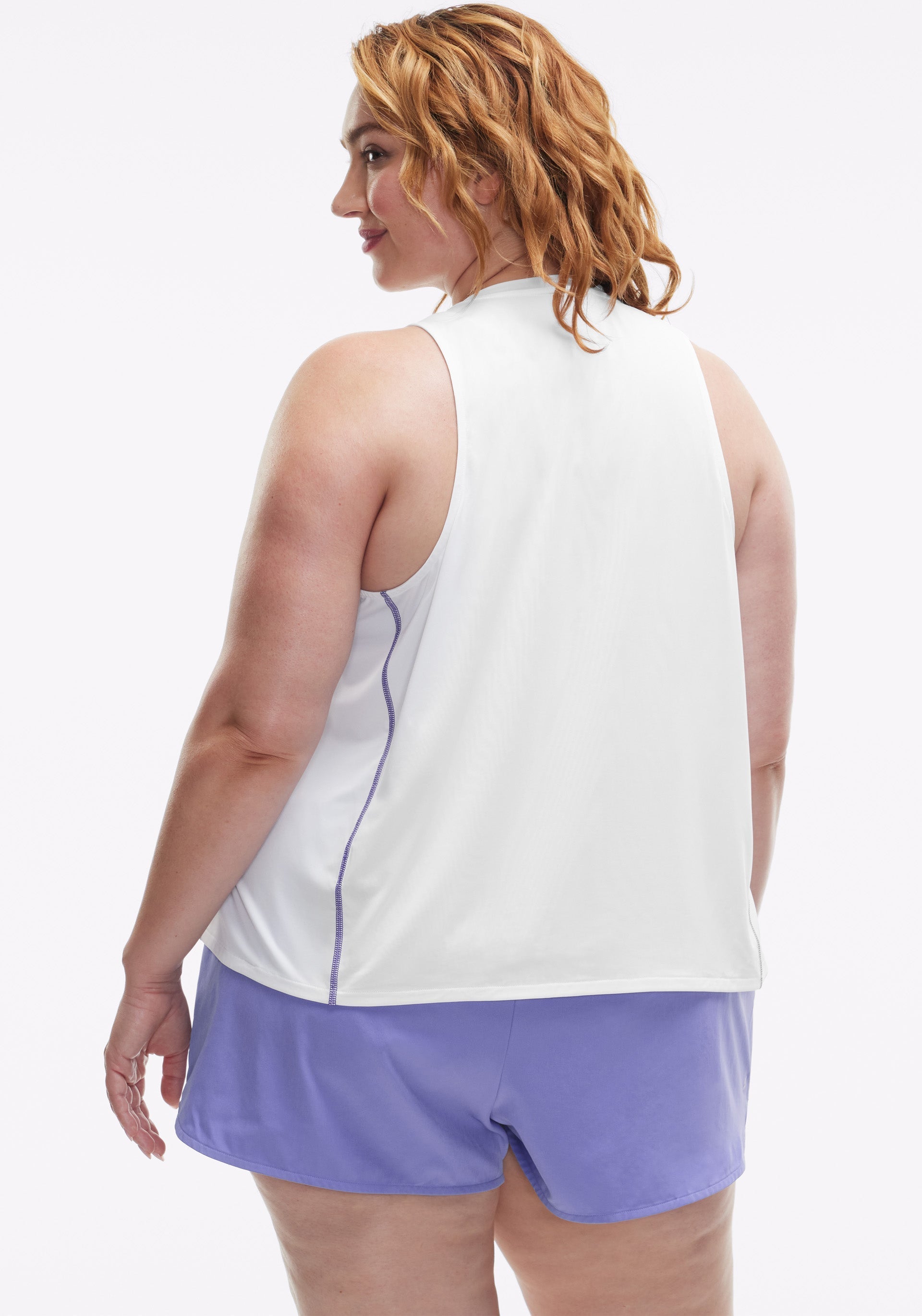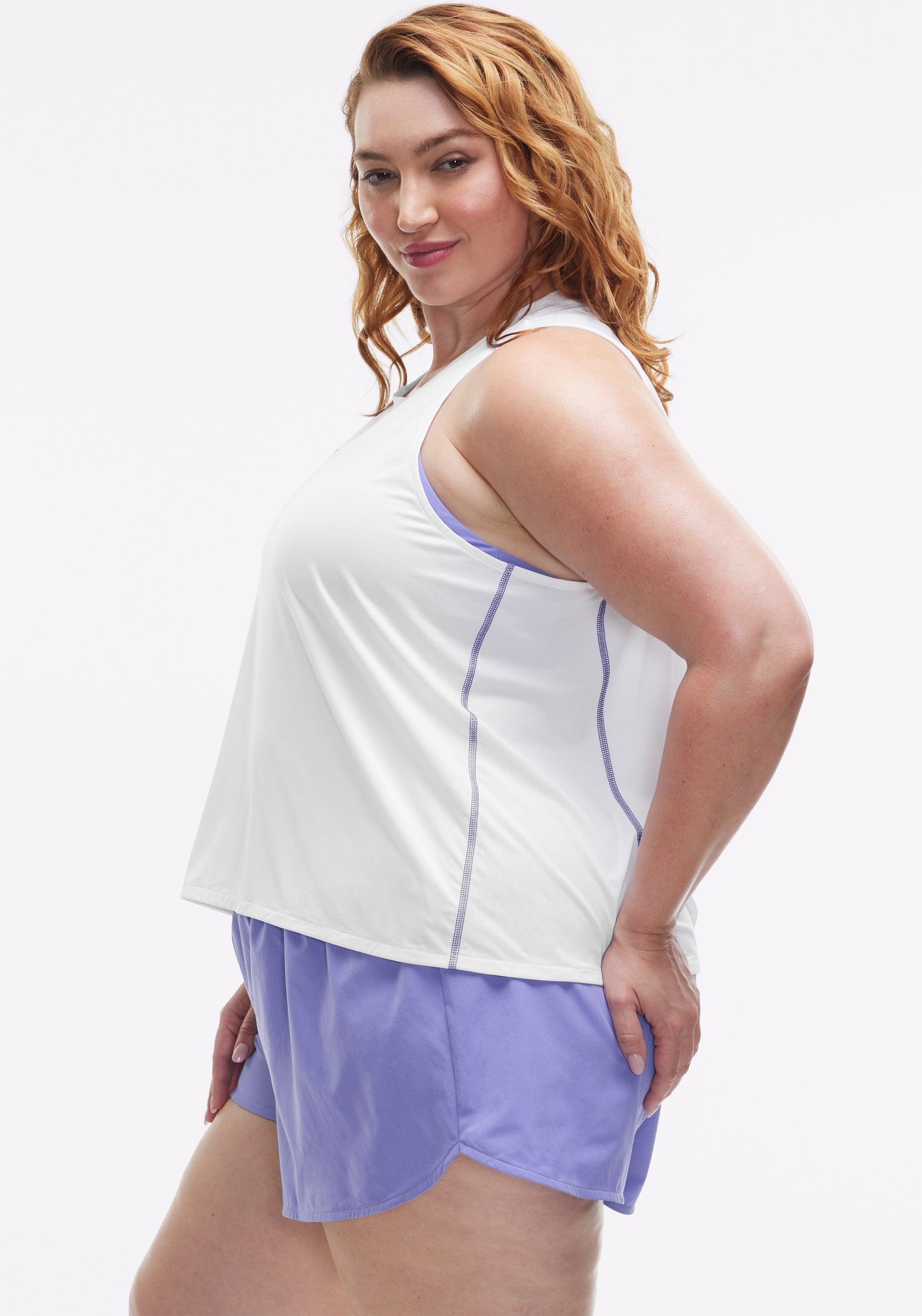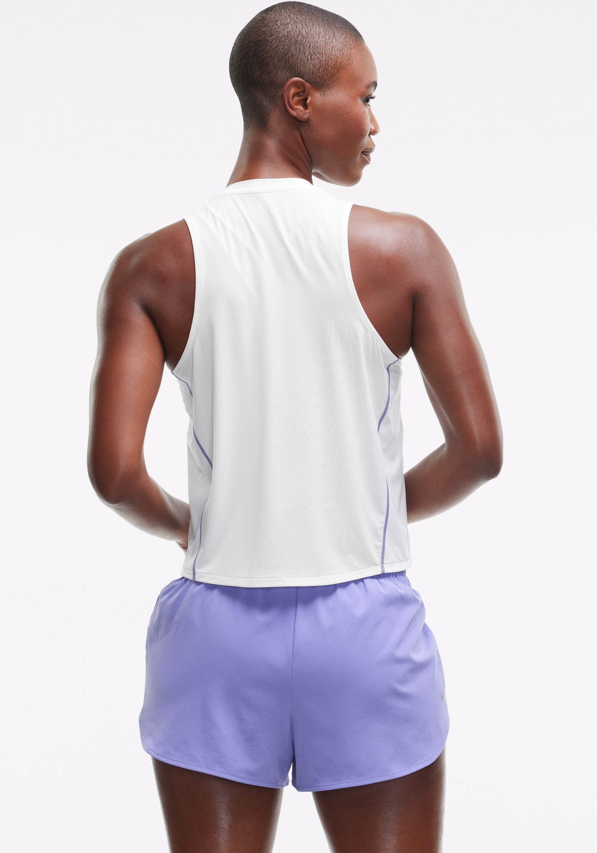 • High-low, crew neck tank with pop stitch detail at side panel seams