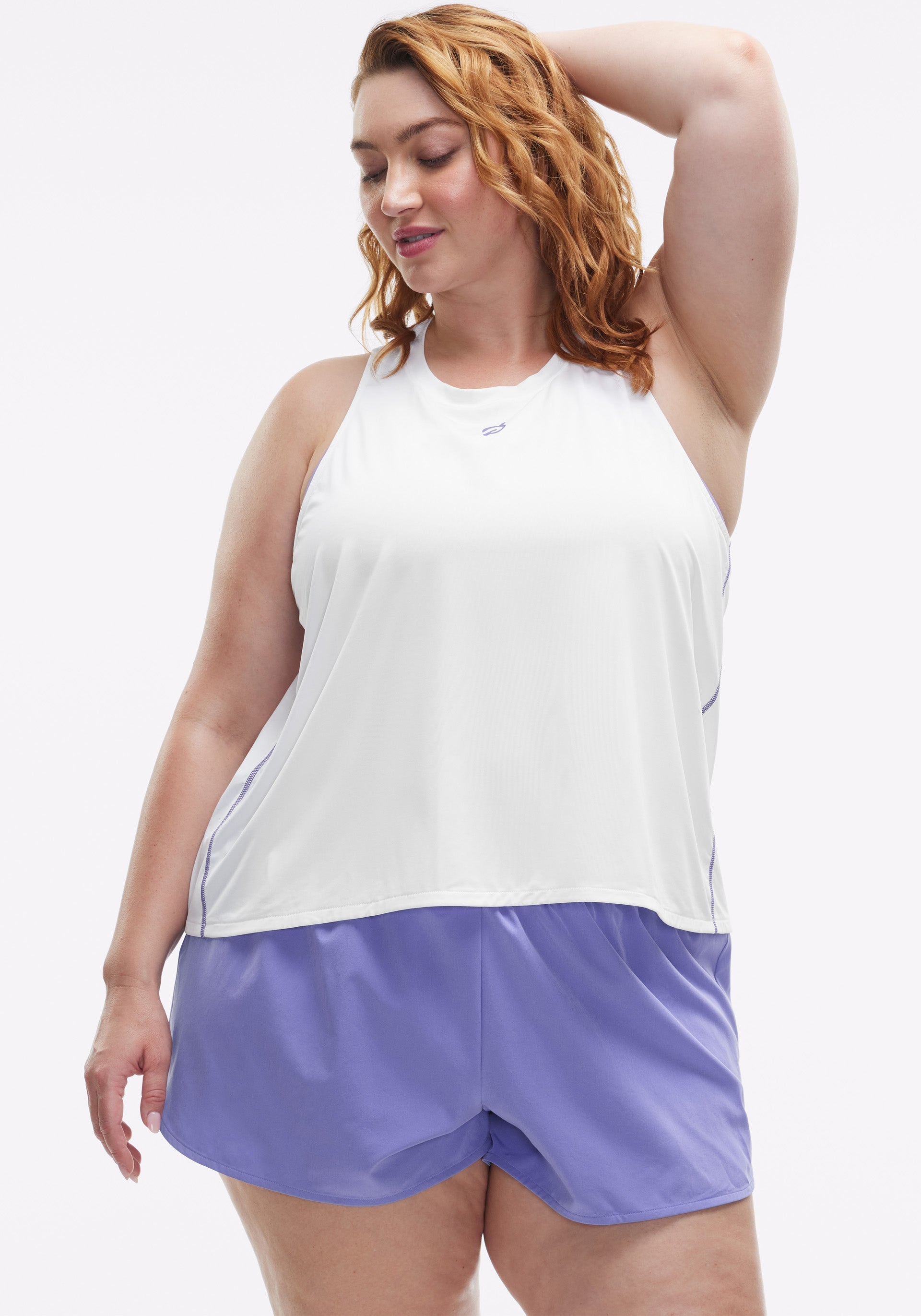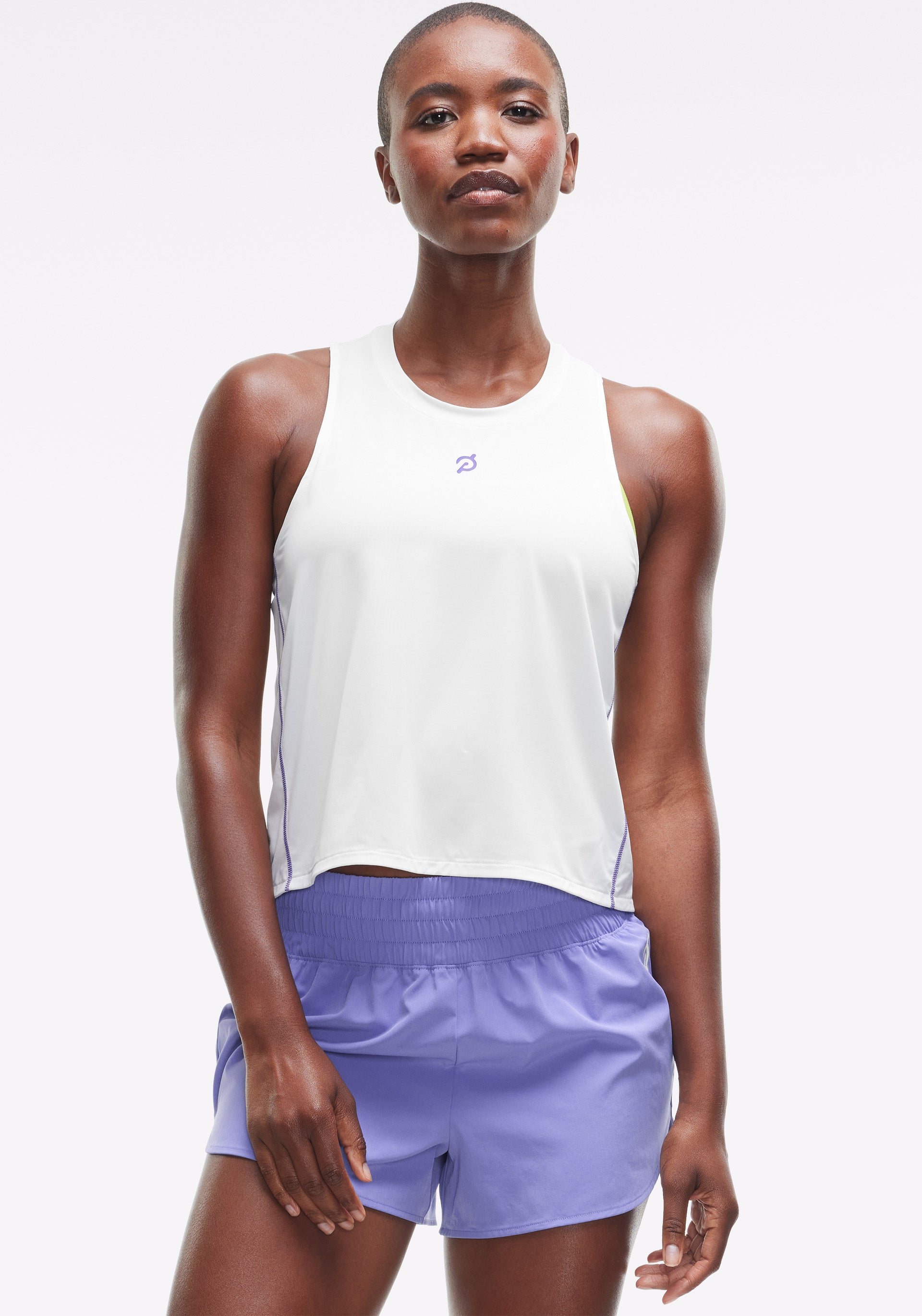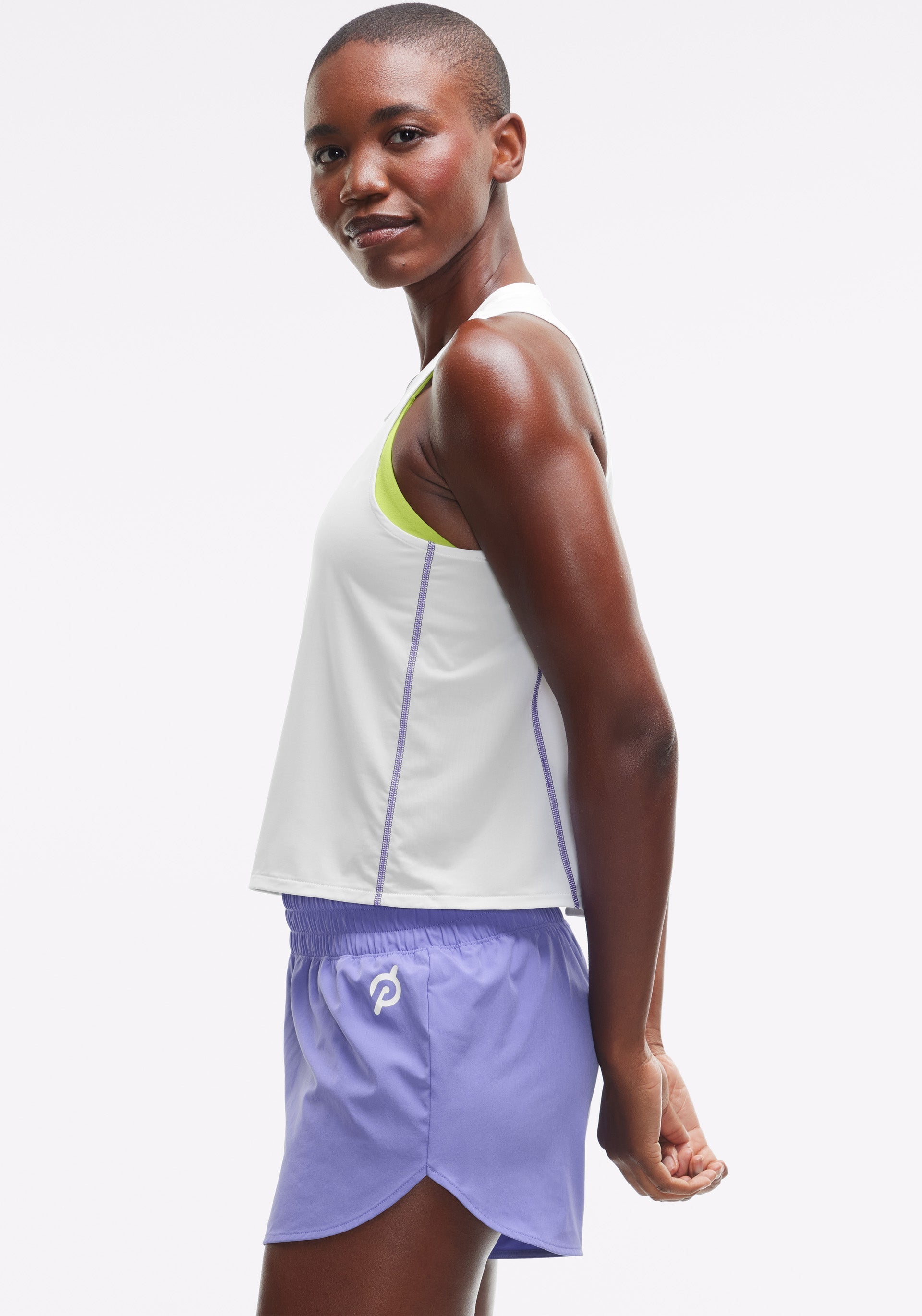 • High-low, crew neck tank with pop stitch detail at side panel seams
