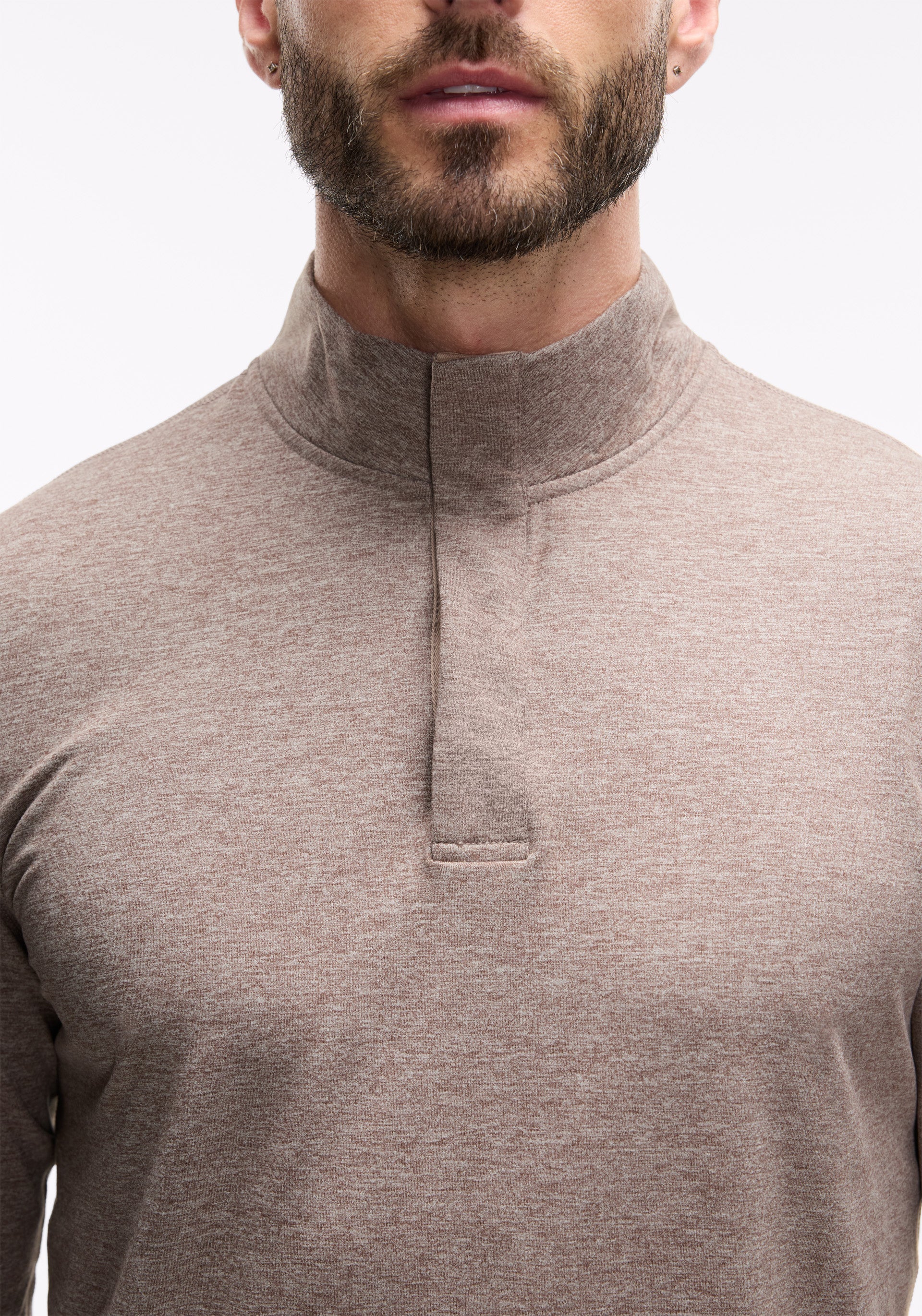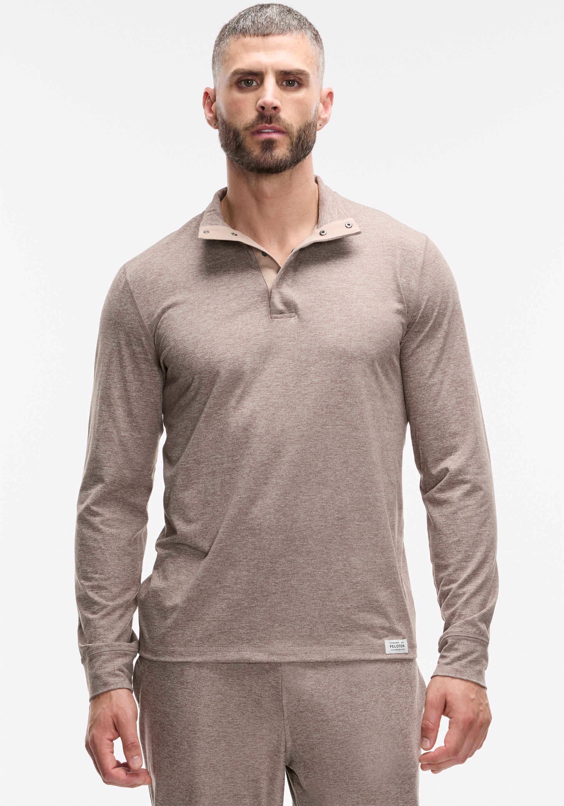 • Pullover sweatshirt with self fabric cuffs and bottom hem, set-in sleeve,and woven, snap placket at front