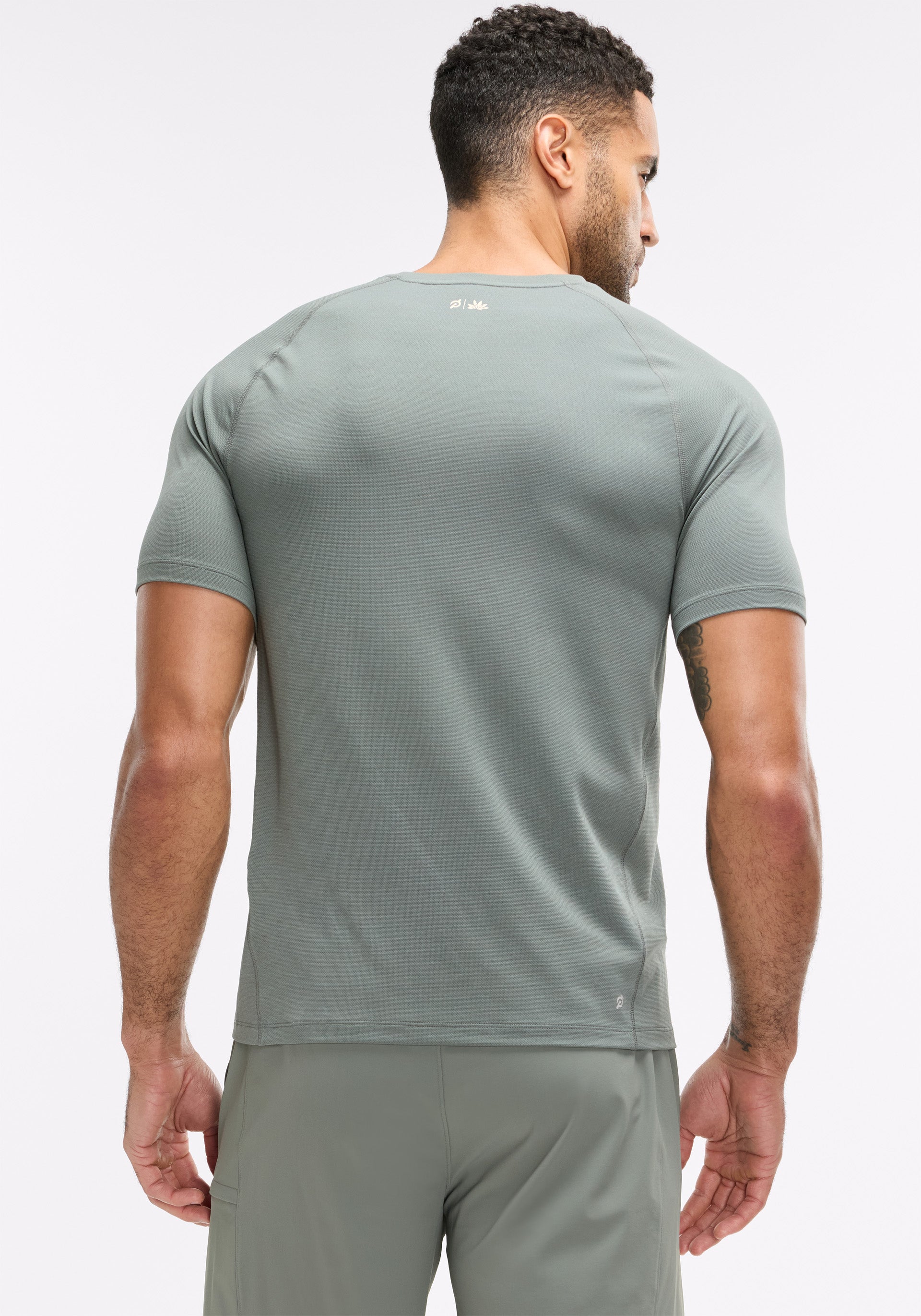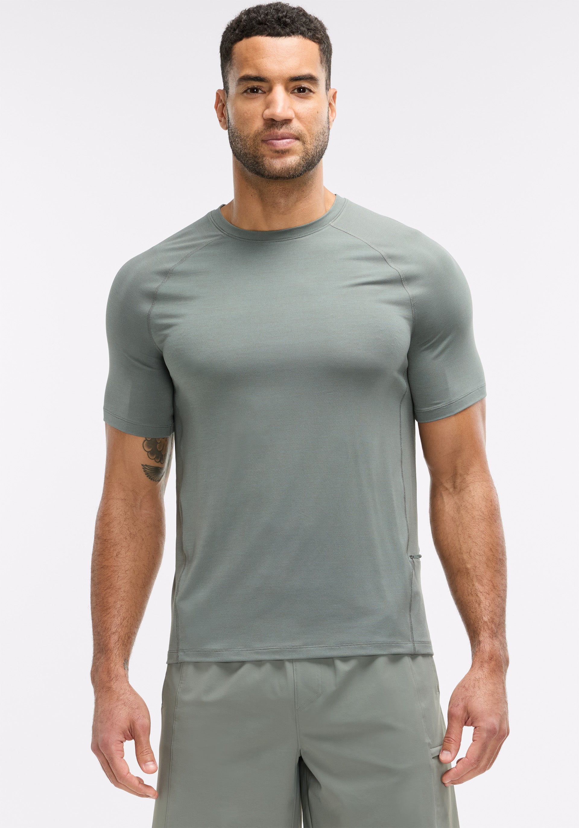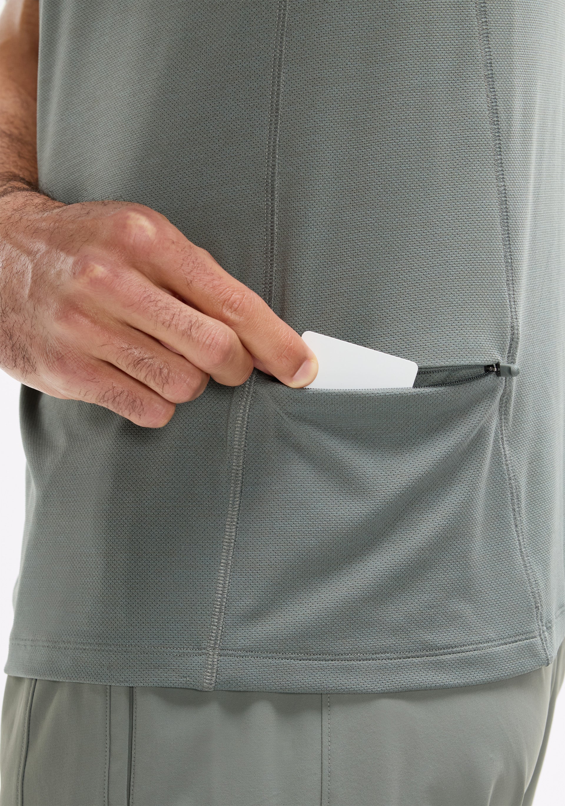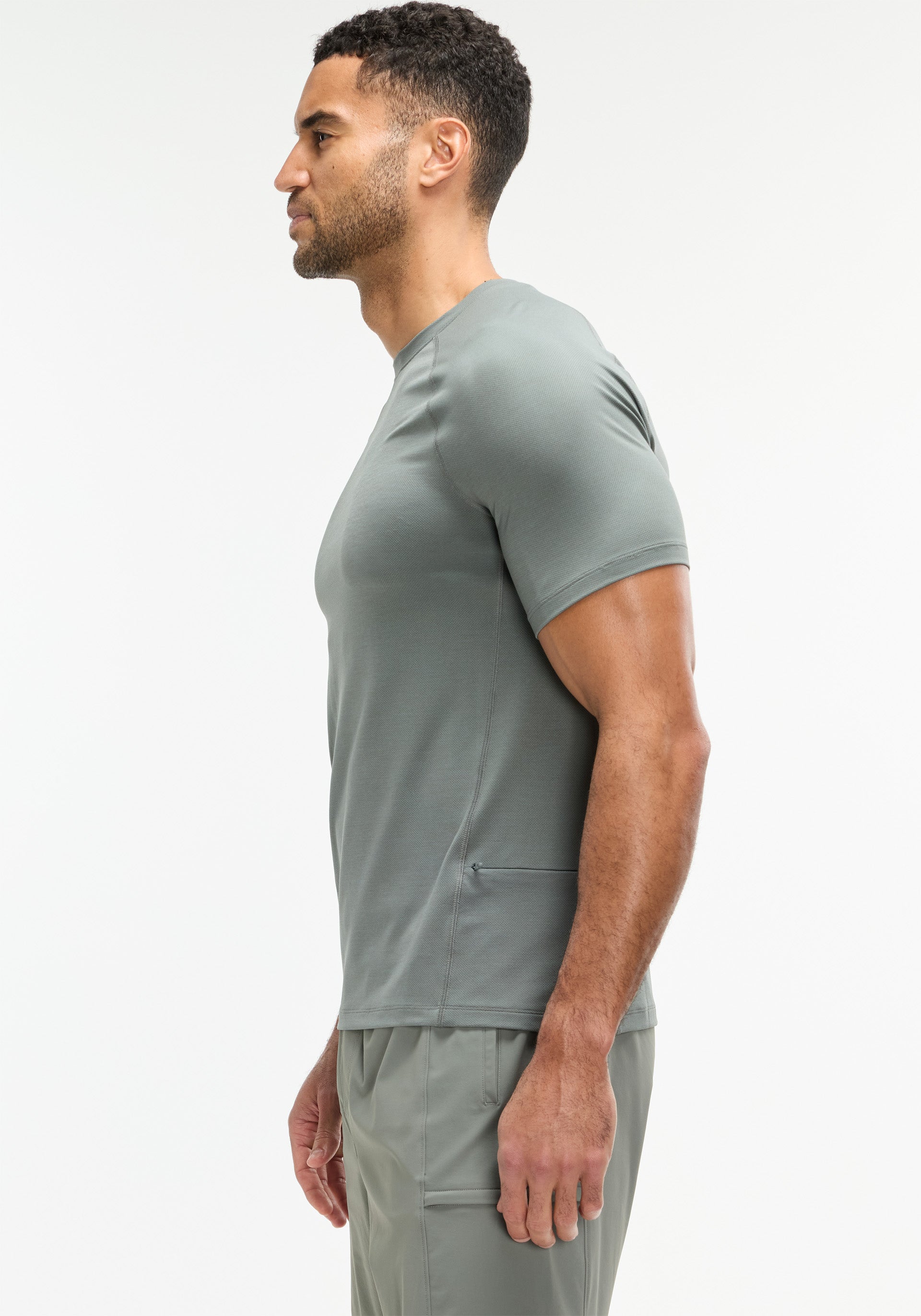 • Crewneck, raglan short sleeve with forward side seams and zipper stash pocket at left side