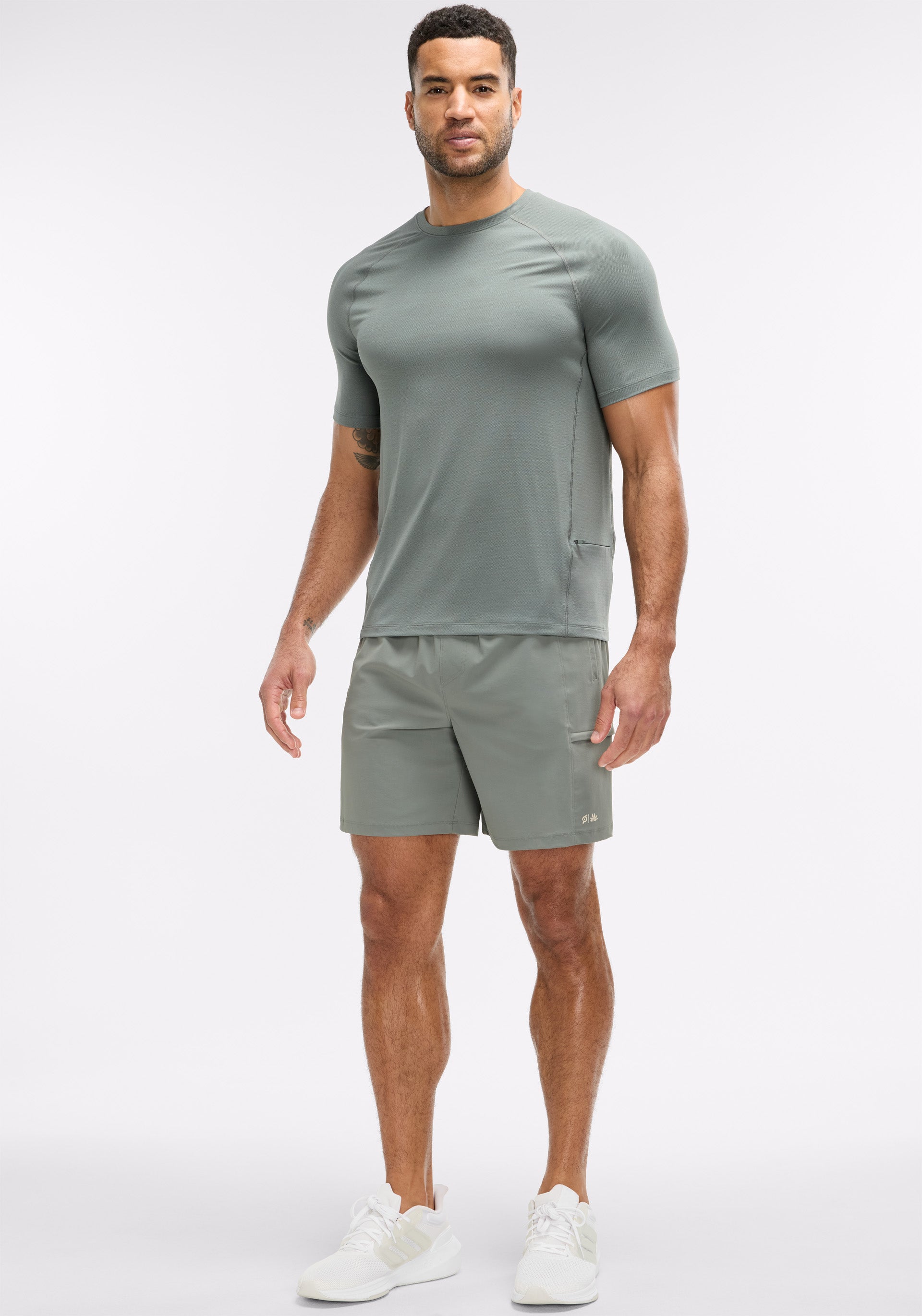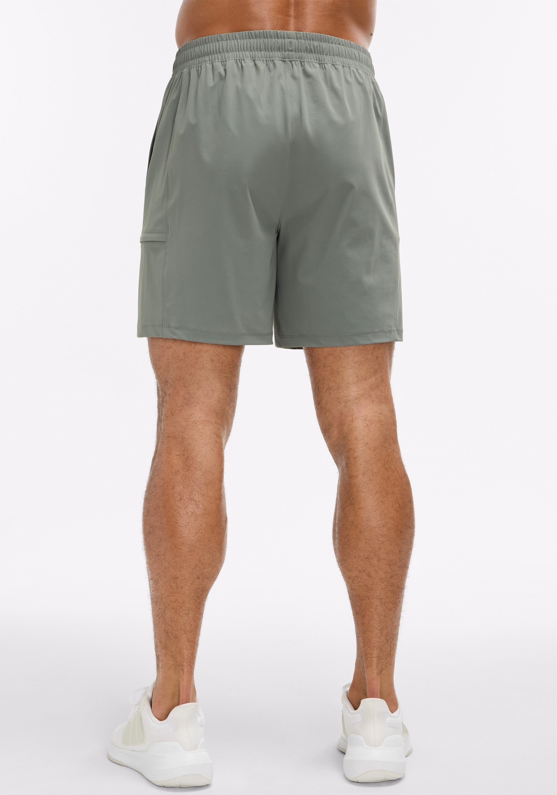 • 7" inseam unlined short with encased elastic waistband, interior drawcord, hand pockets, and zipped cargo pocket at left side