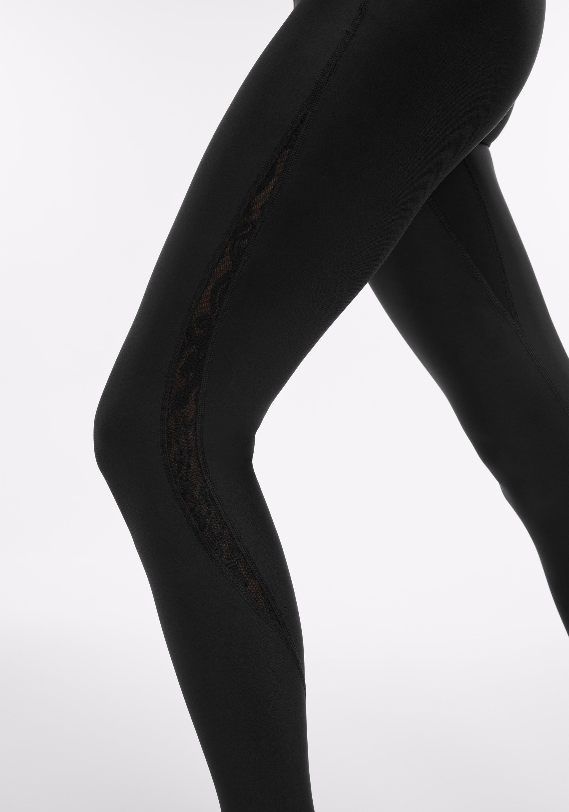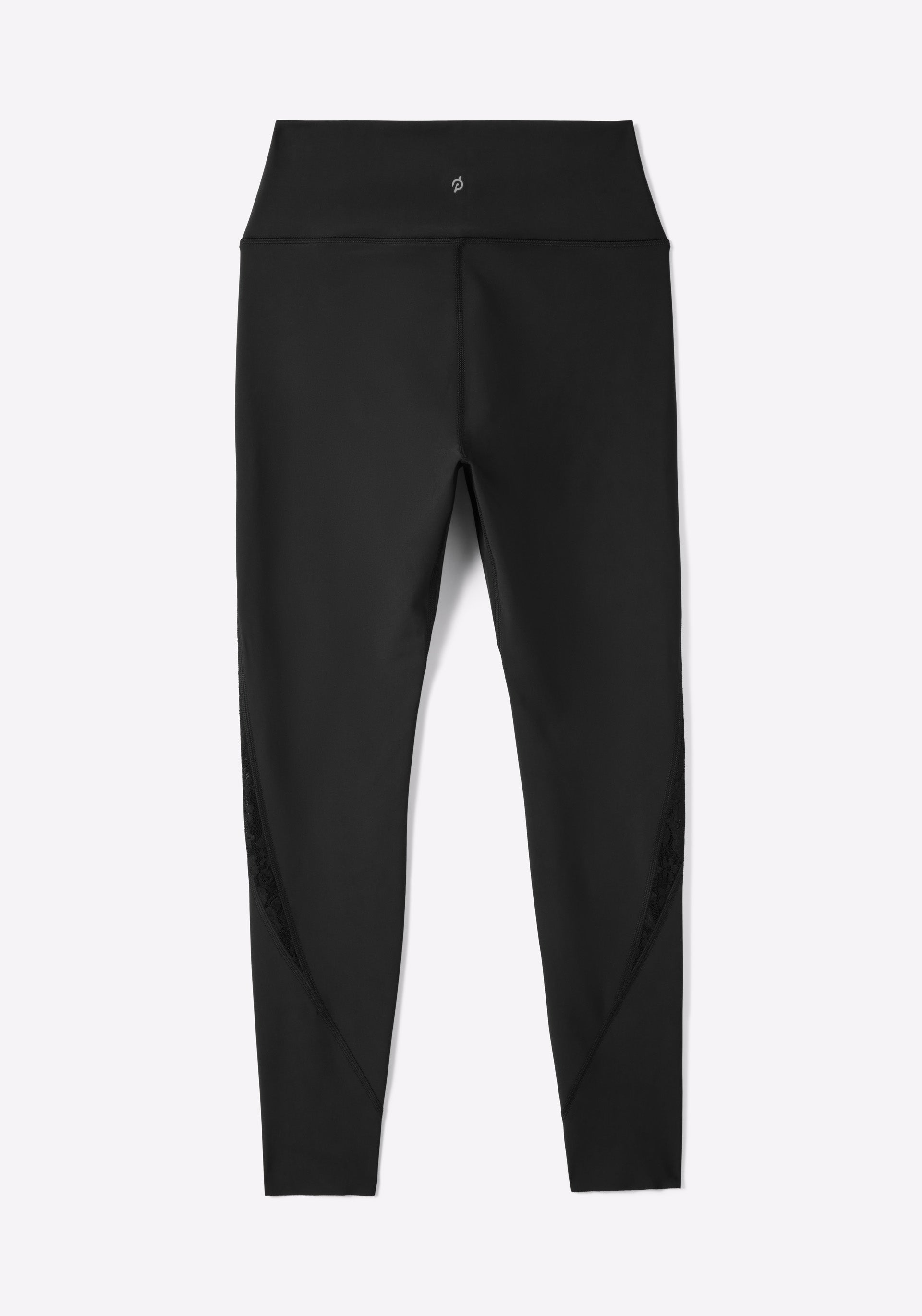 • High rise, 25" inseam legging with lace inset at side panel, back stash pocket, and elongated gusset