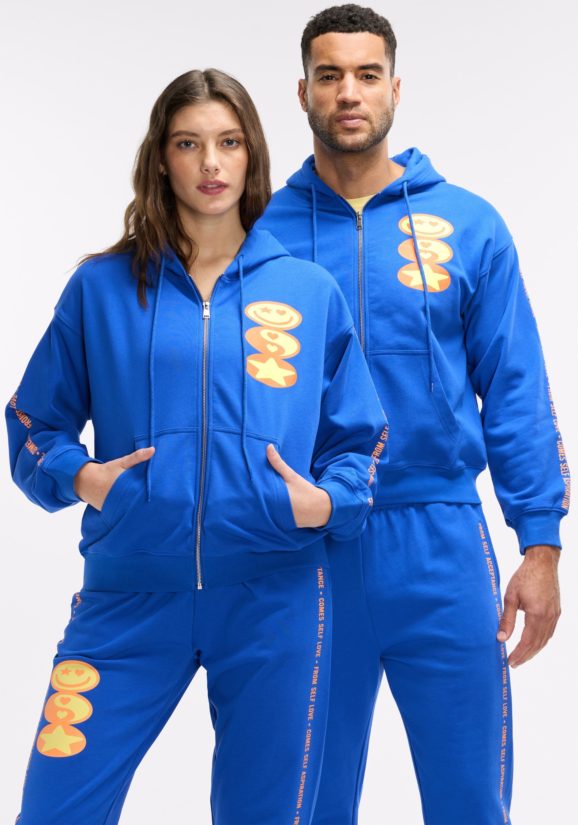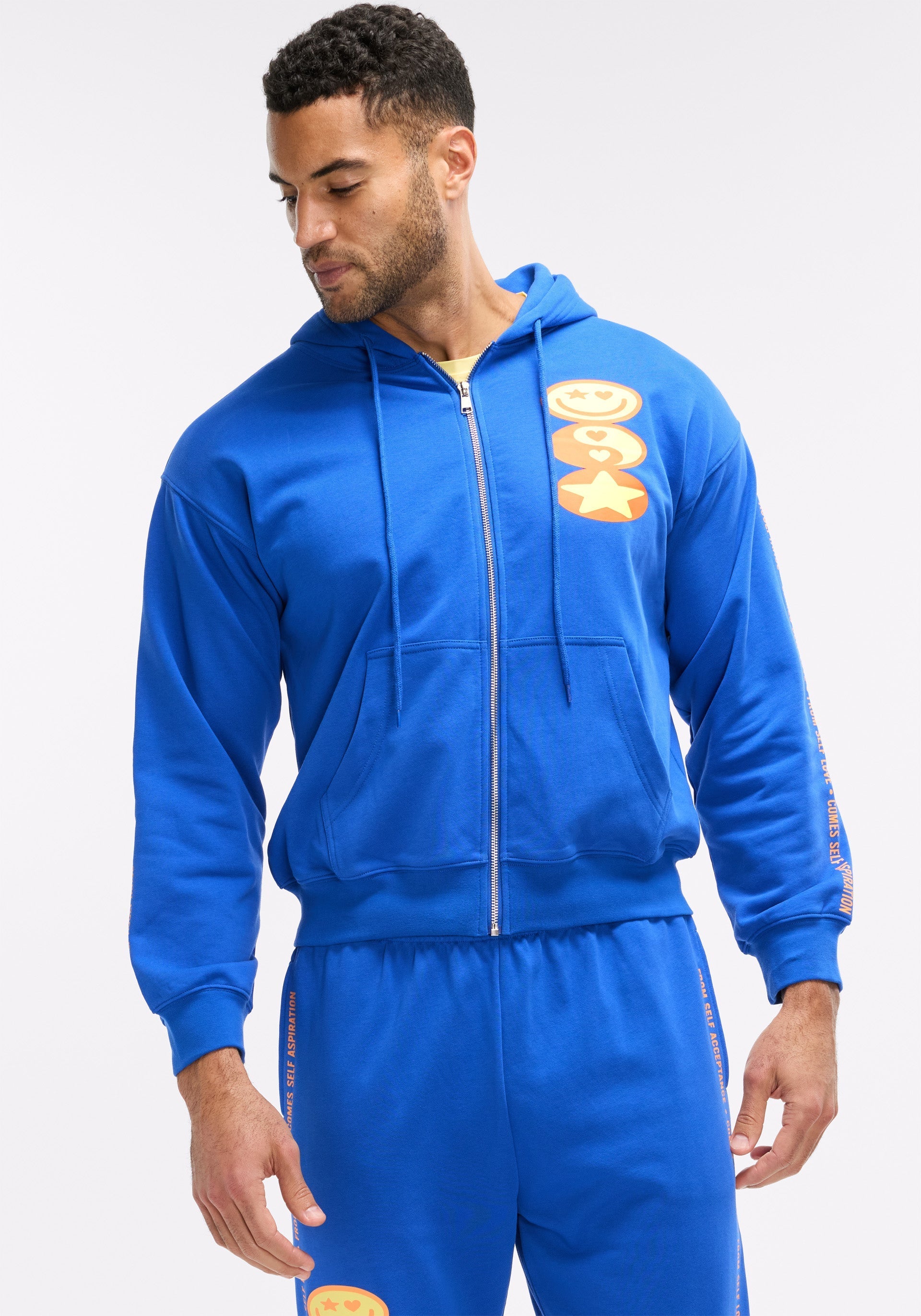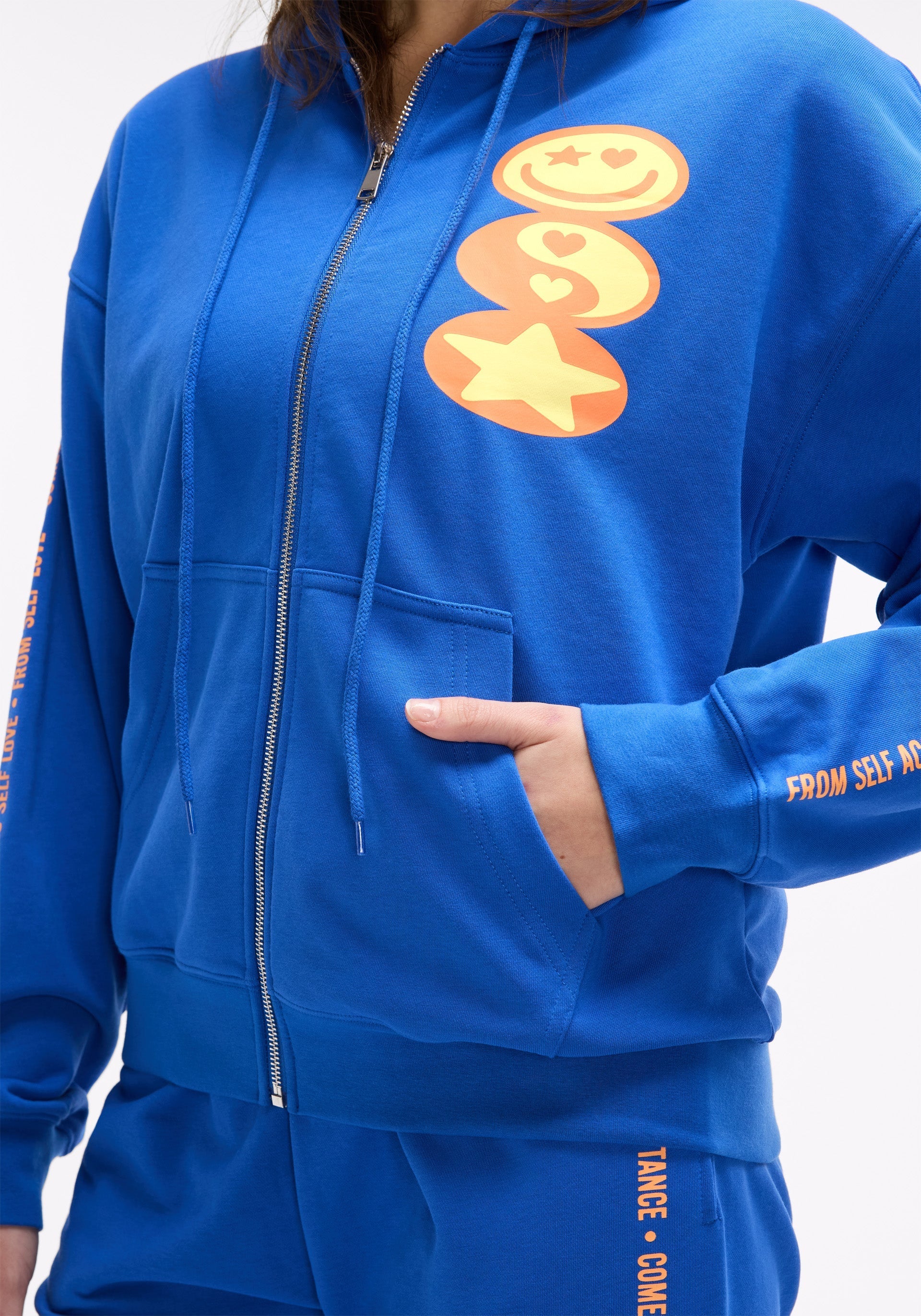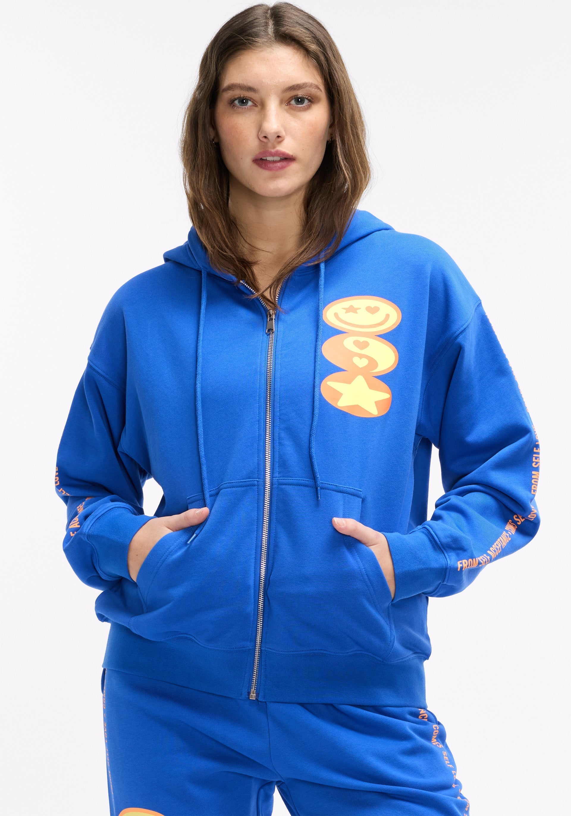 • Cotton fleece zip-up with adjustable drawcord at hood and hand pockets