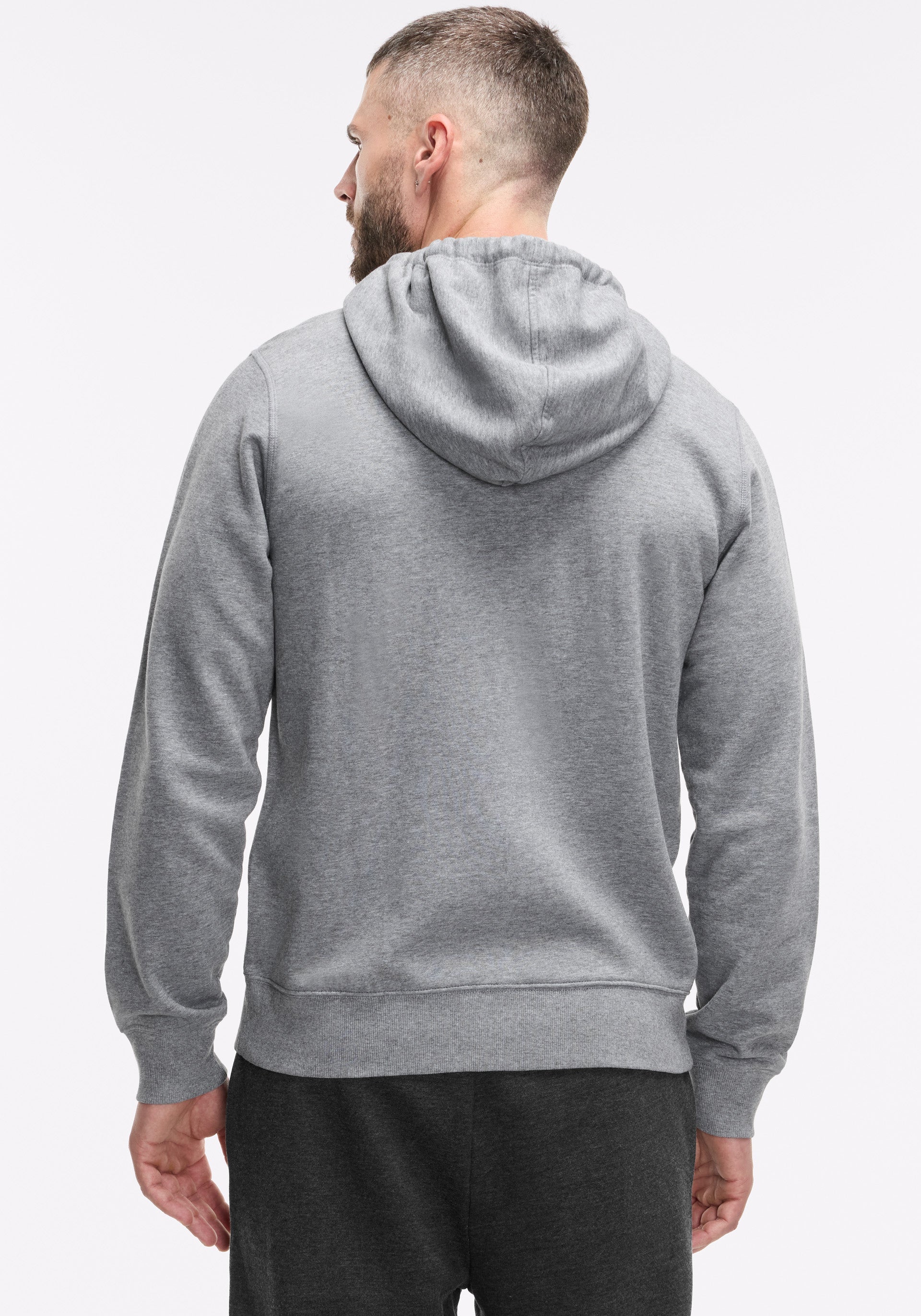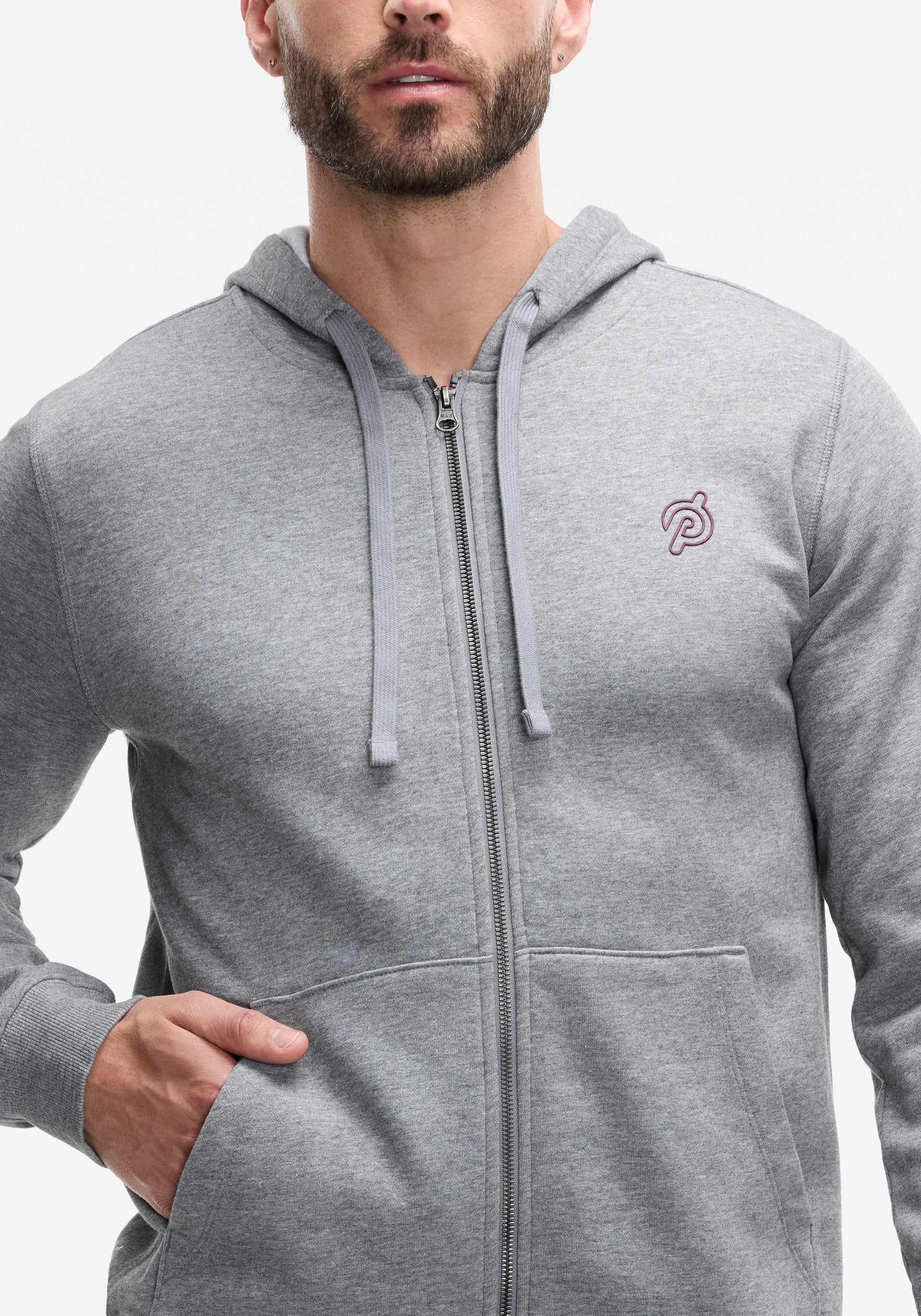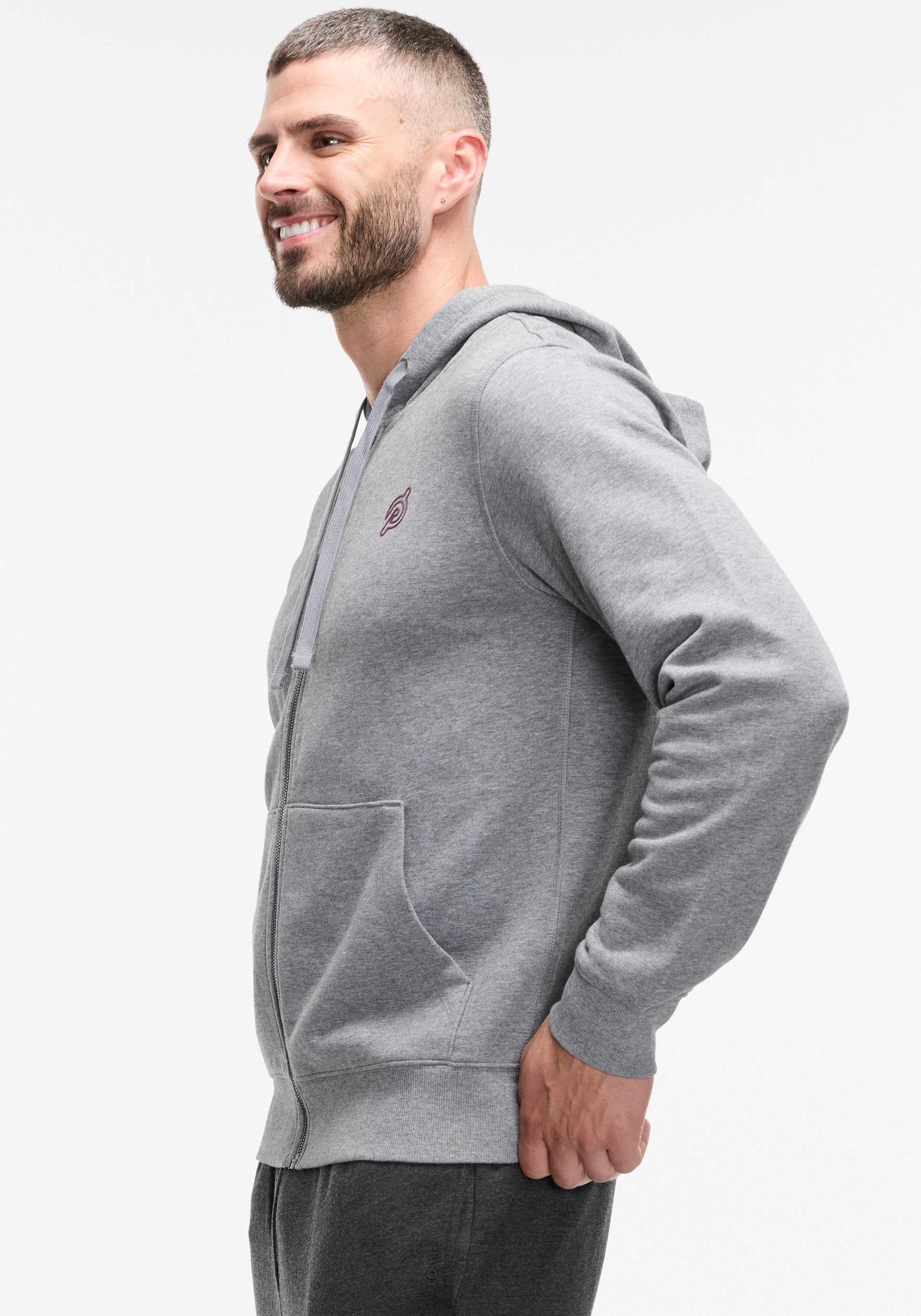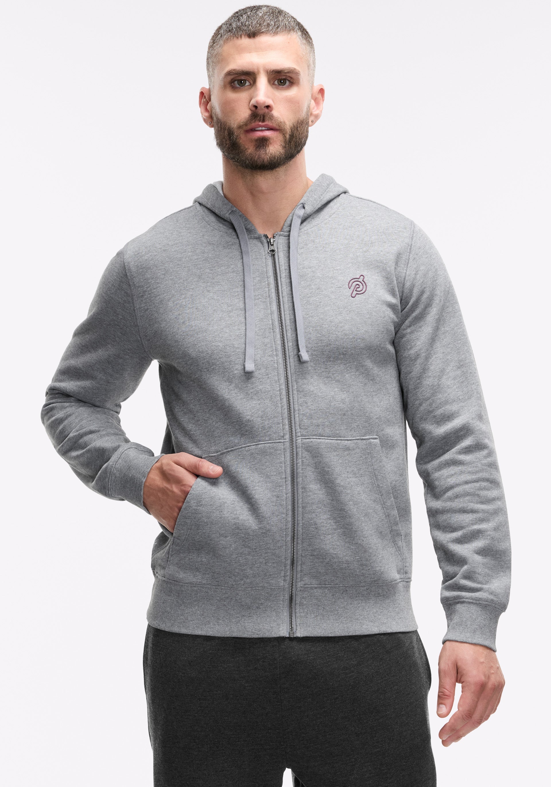 • Cotton fleece full zip with front hand packers and  rib detail at cuffs and bottom band