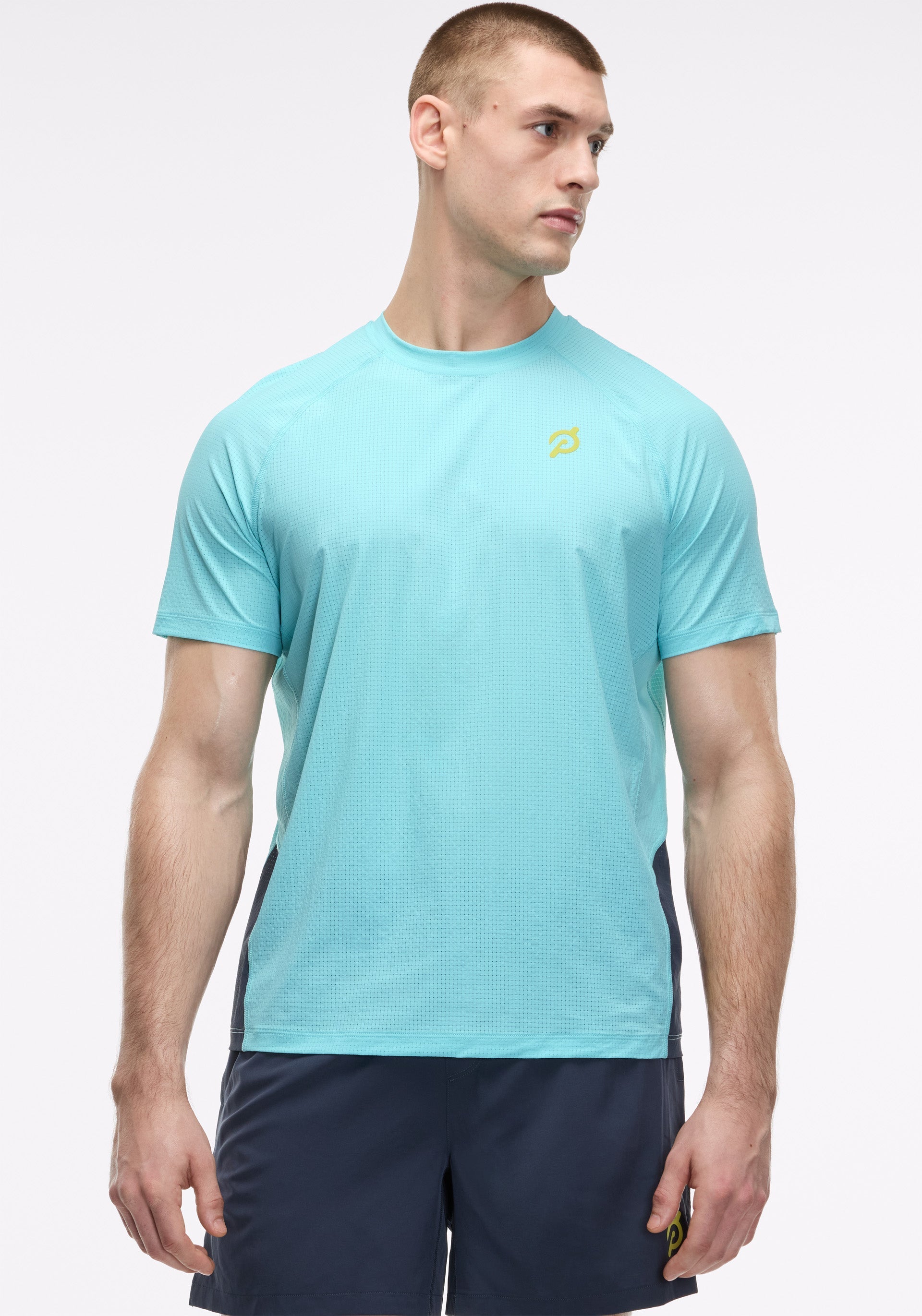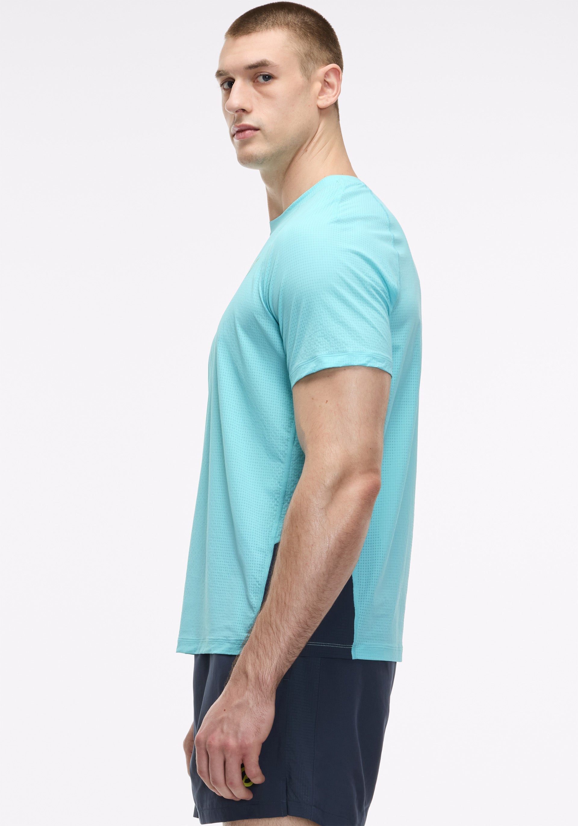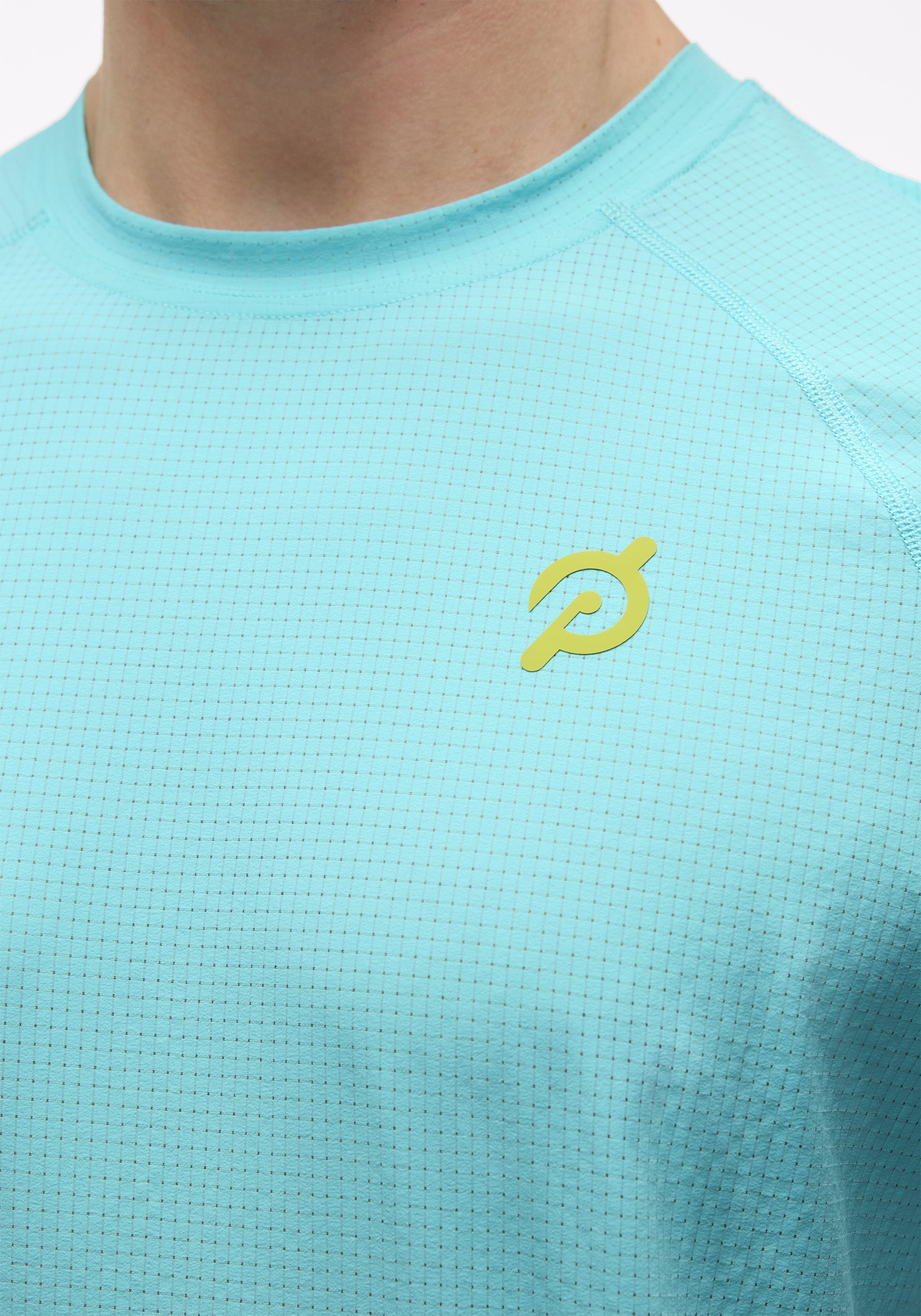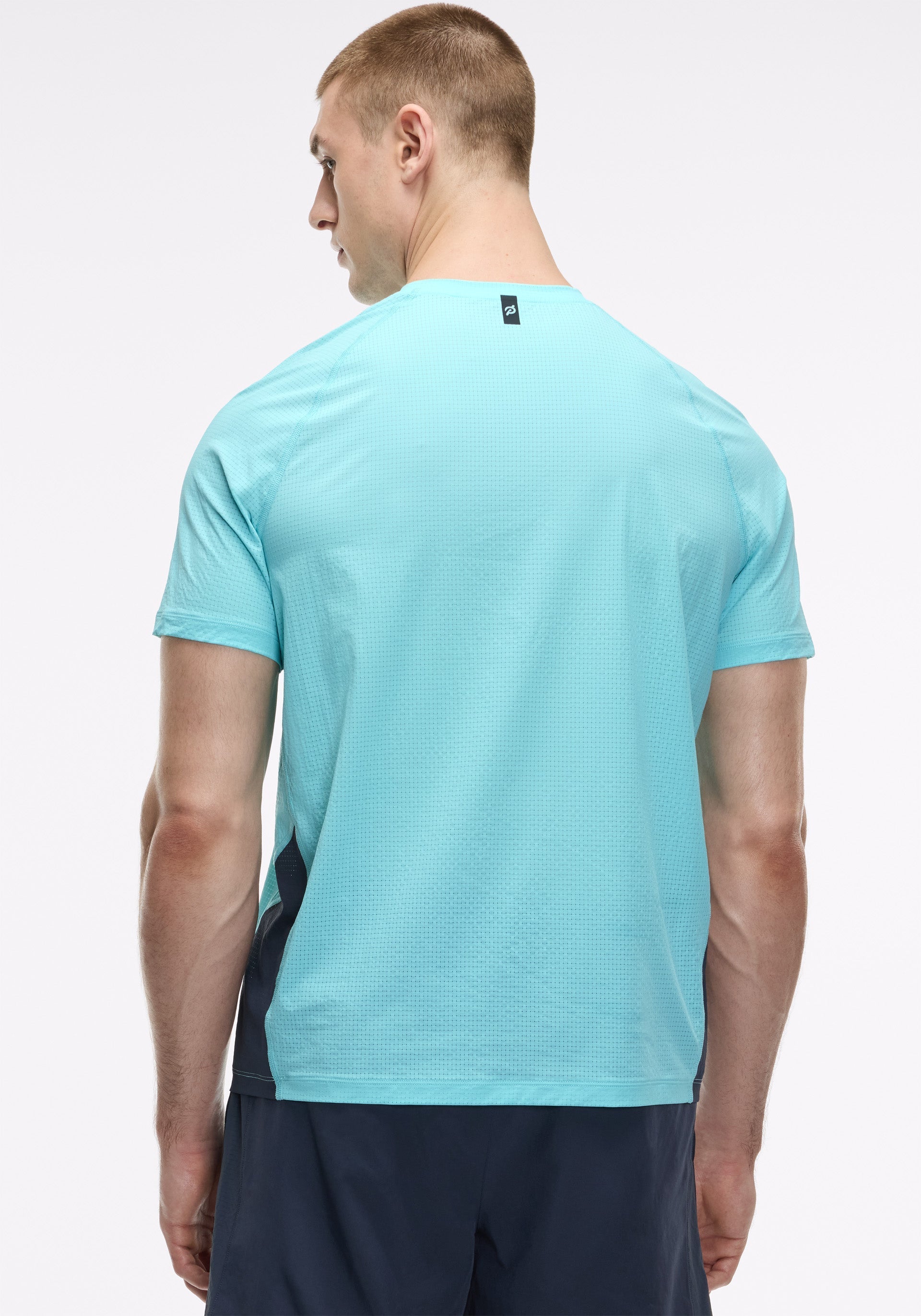 • Raglan short sleeve in grid mesh fabrication with contrast colorblock panel at sideseam