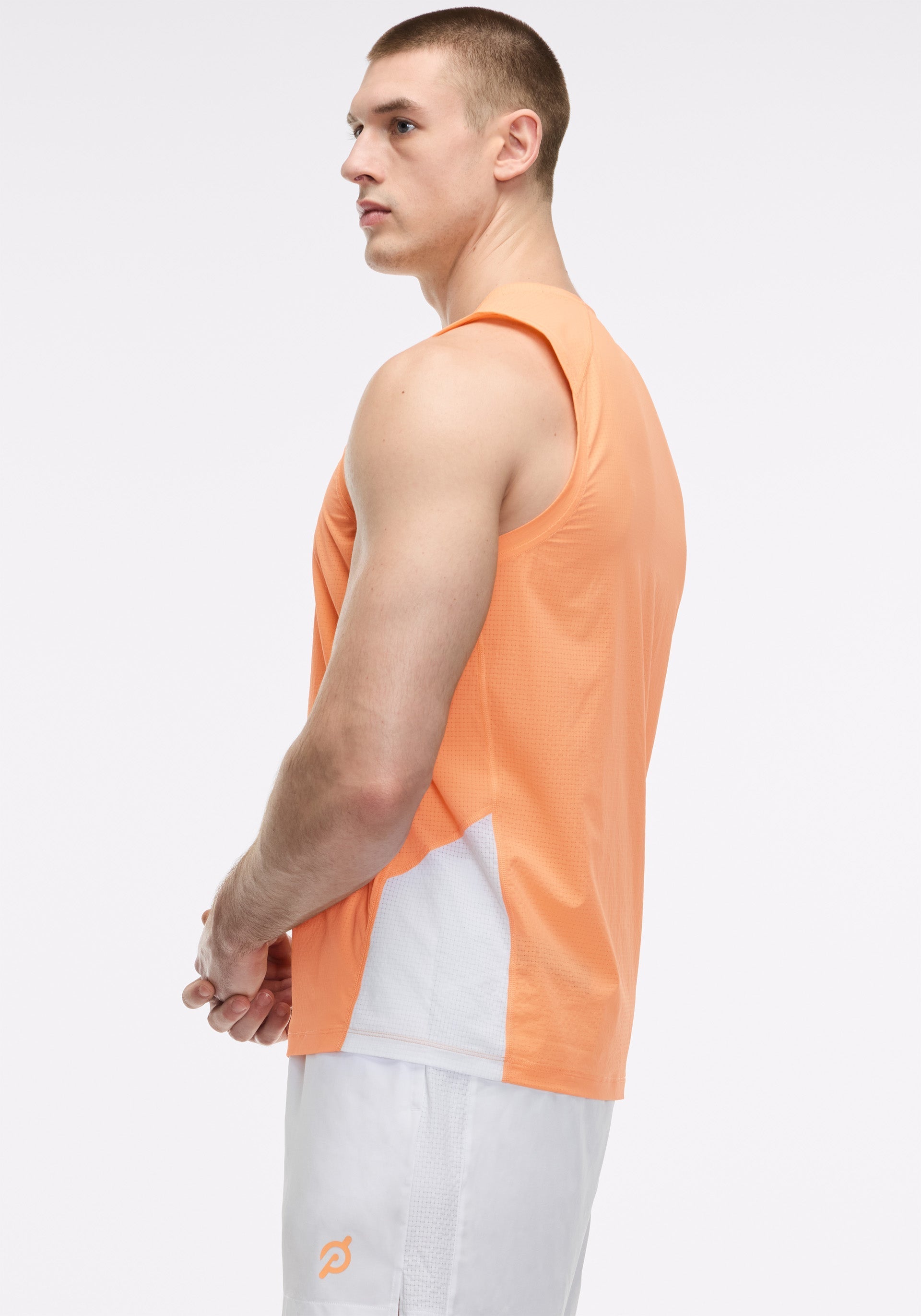 • Crewneck, muscle tank in grid mesh fabrication with contrast colorblock panel at sideseam