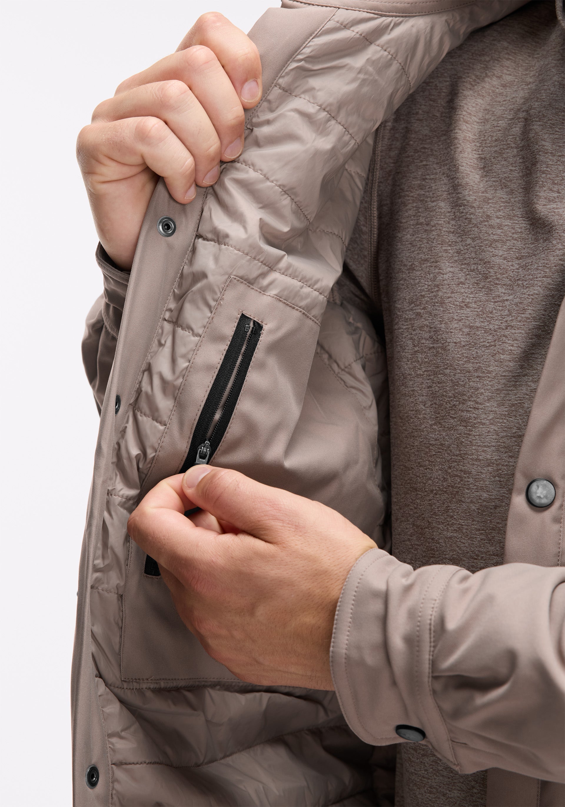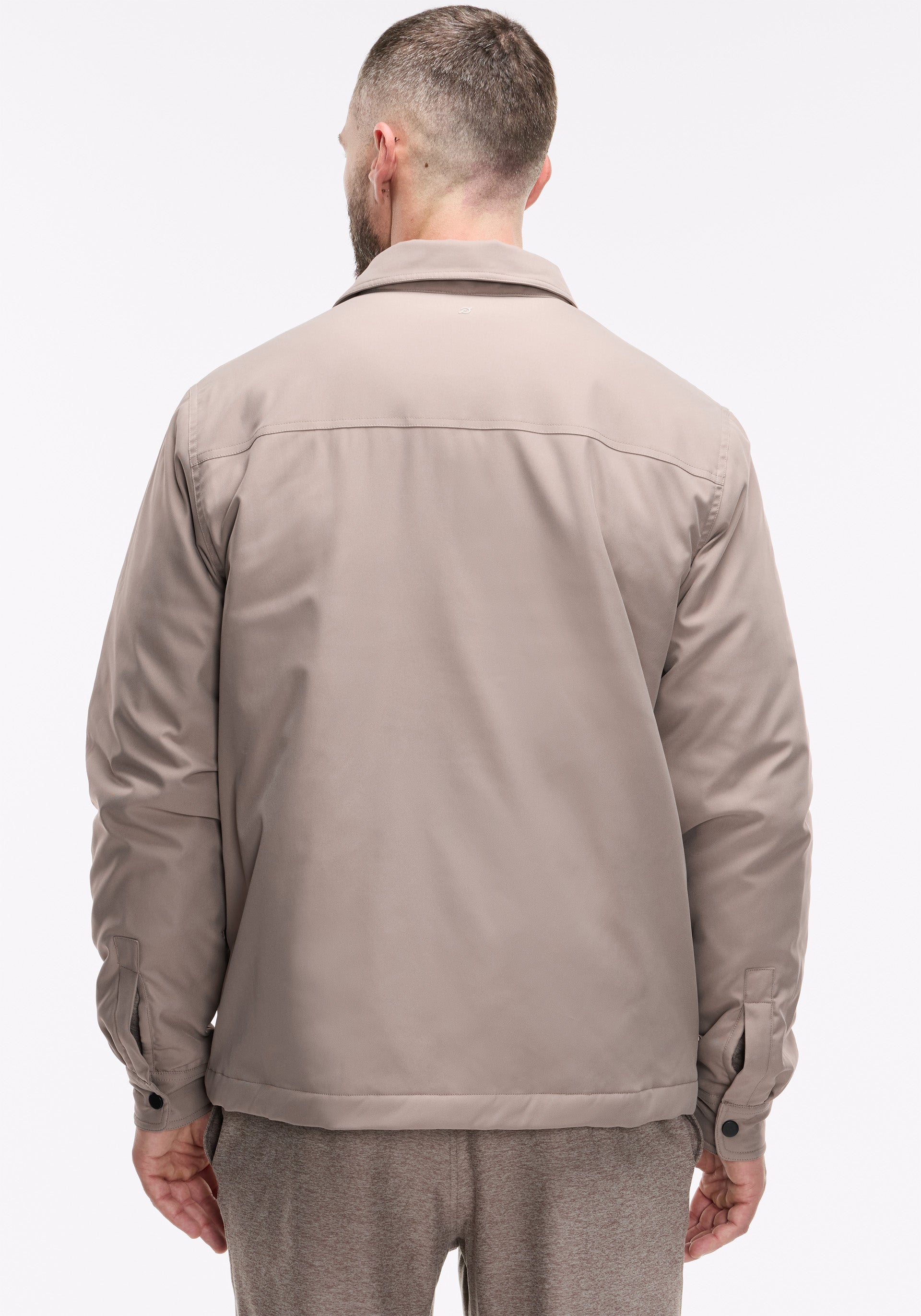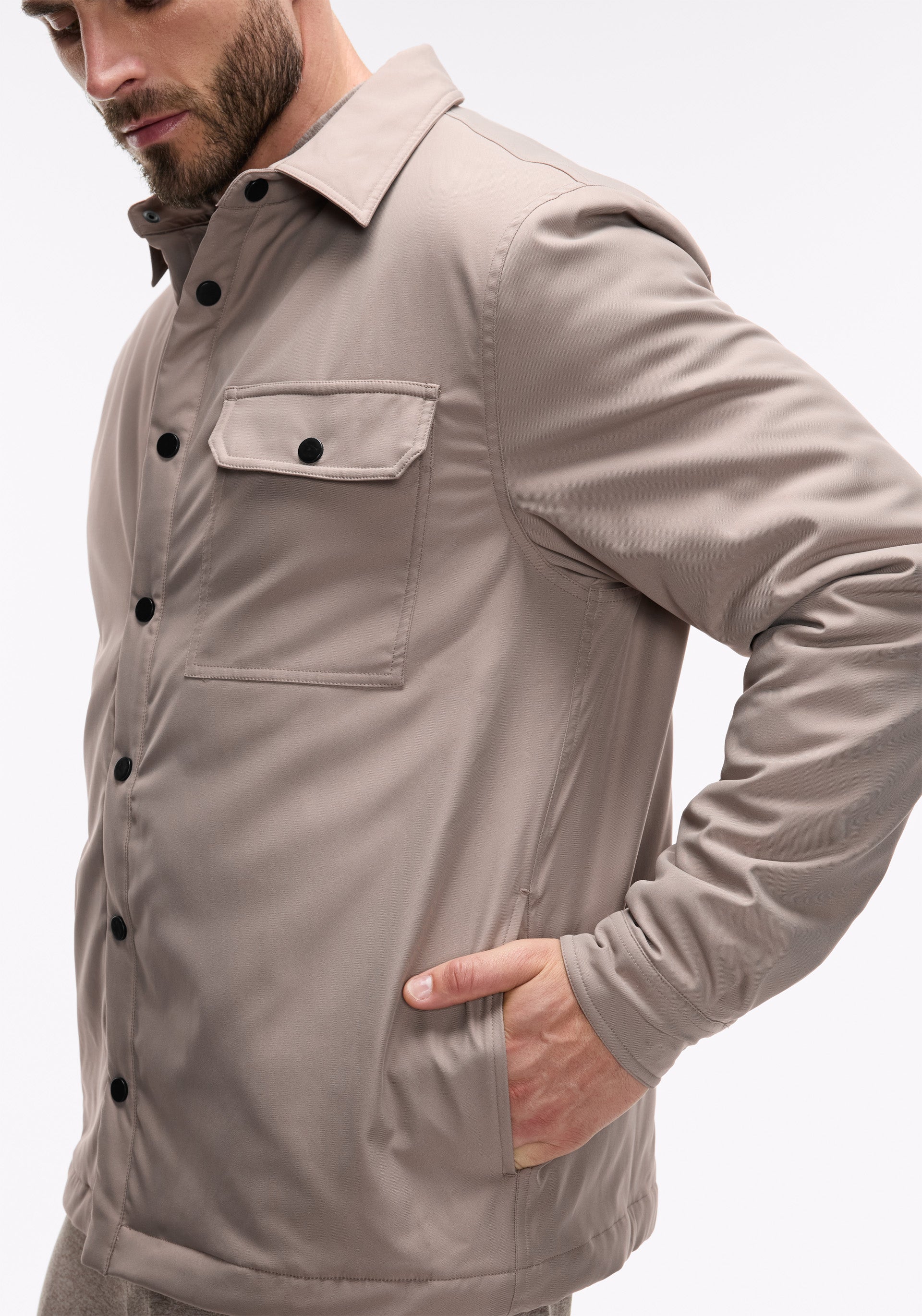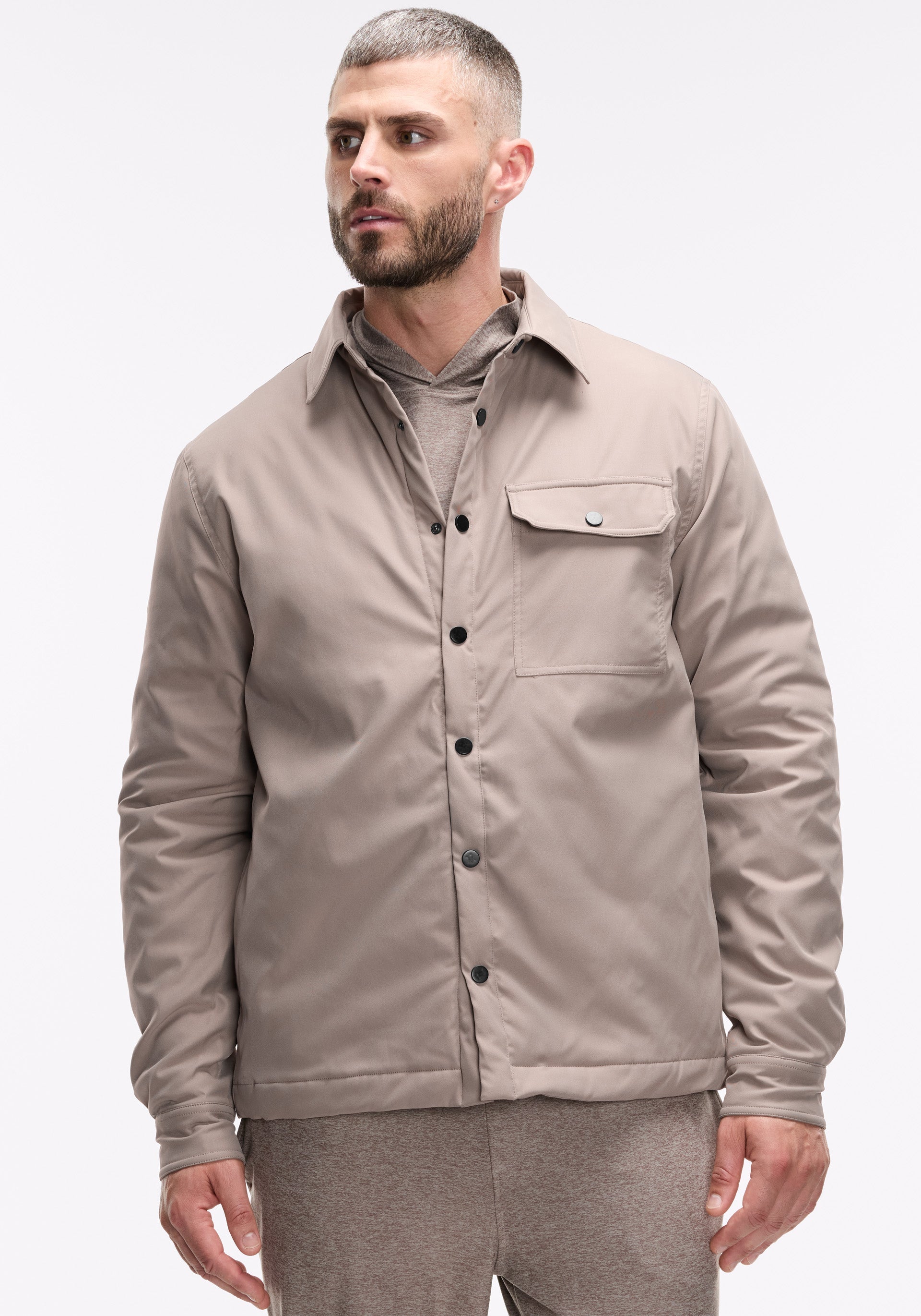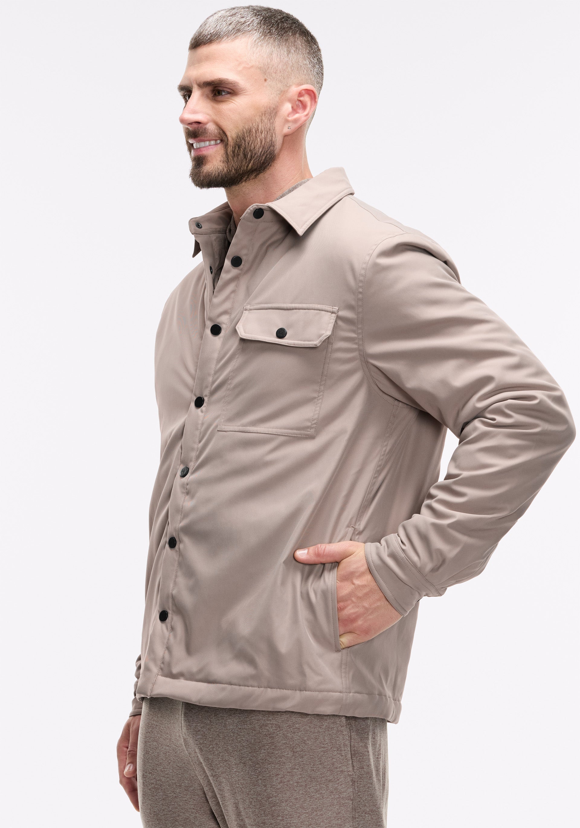 • Snap-front shacket with quilted interior, snaps at cuffs, on seam hand pockets, exterior left chest snap pocket, and interior right chest zip pocket