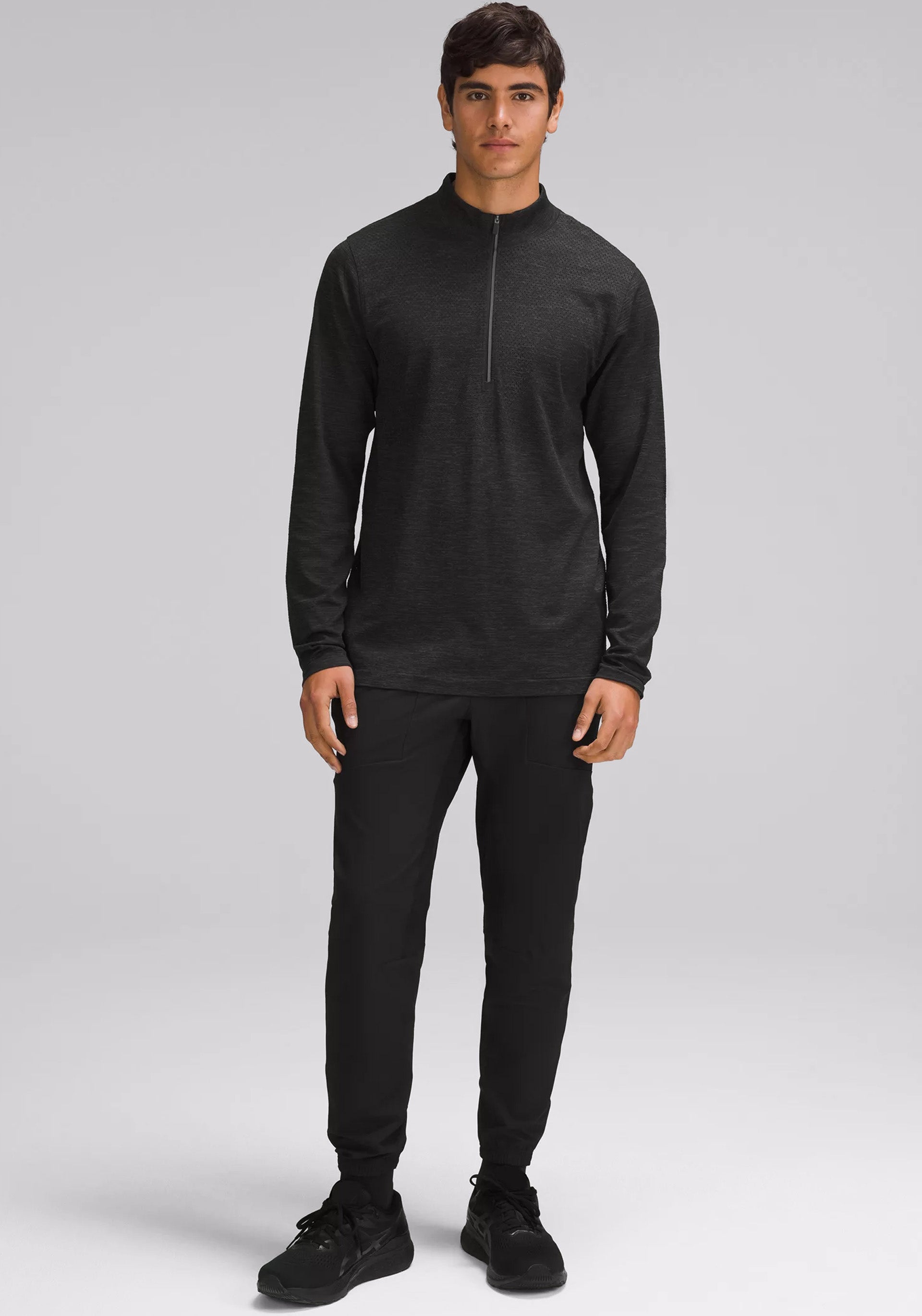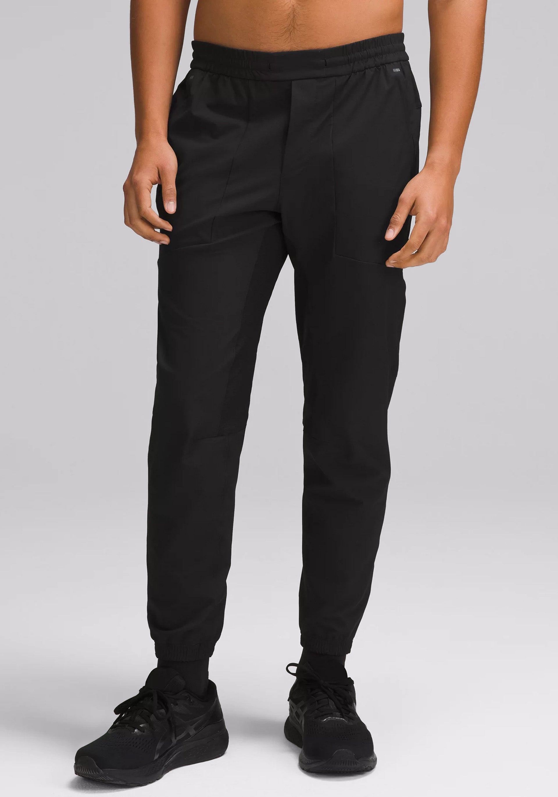 • Tapered jogger with waistband drawcord that can be worn facing out or inside, zippered hand pockets with hidden phone and coin sleeves, and discreet back zippered pocket.