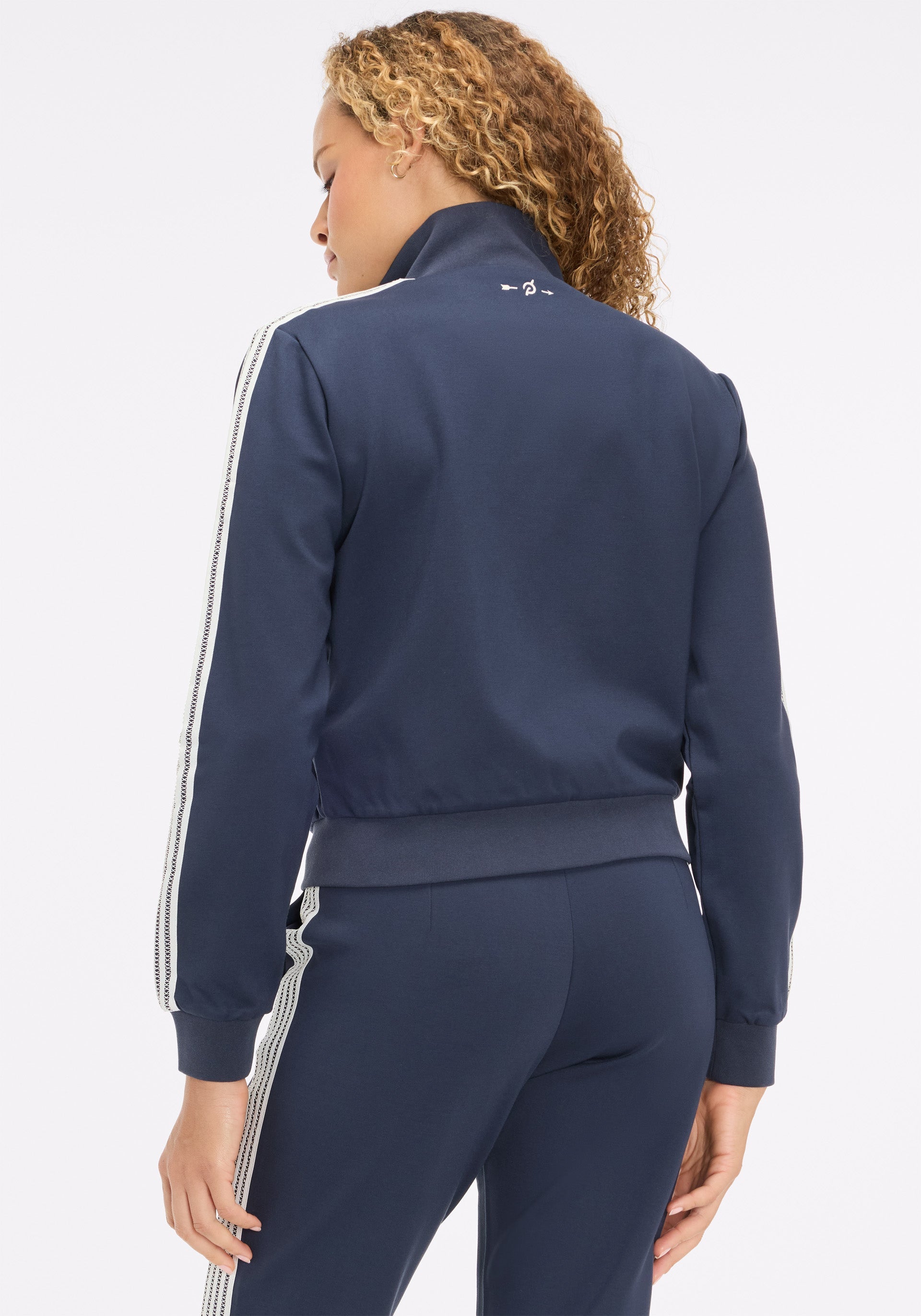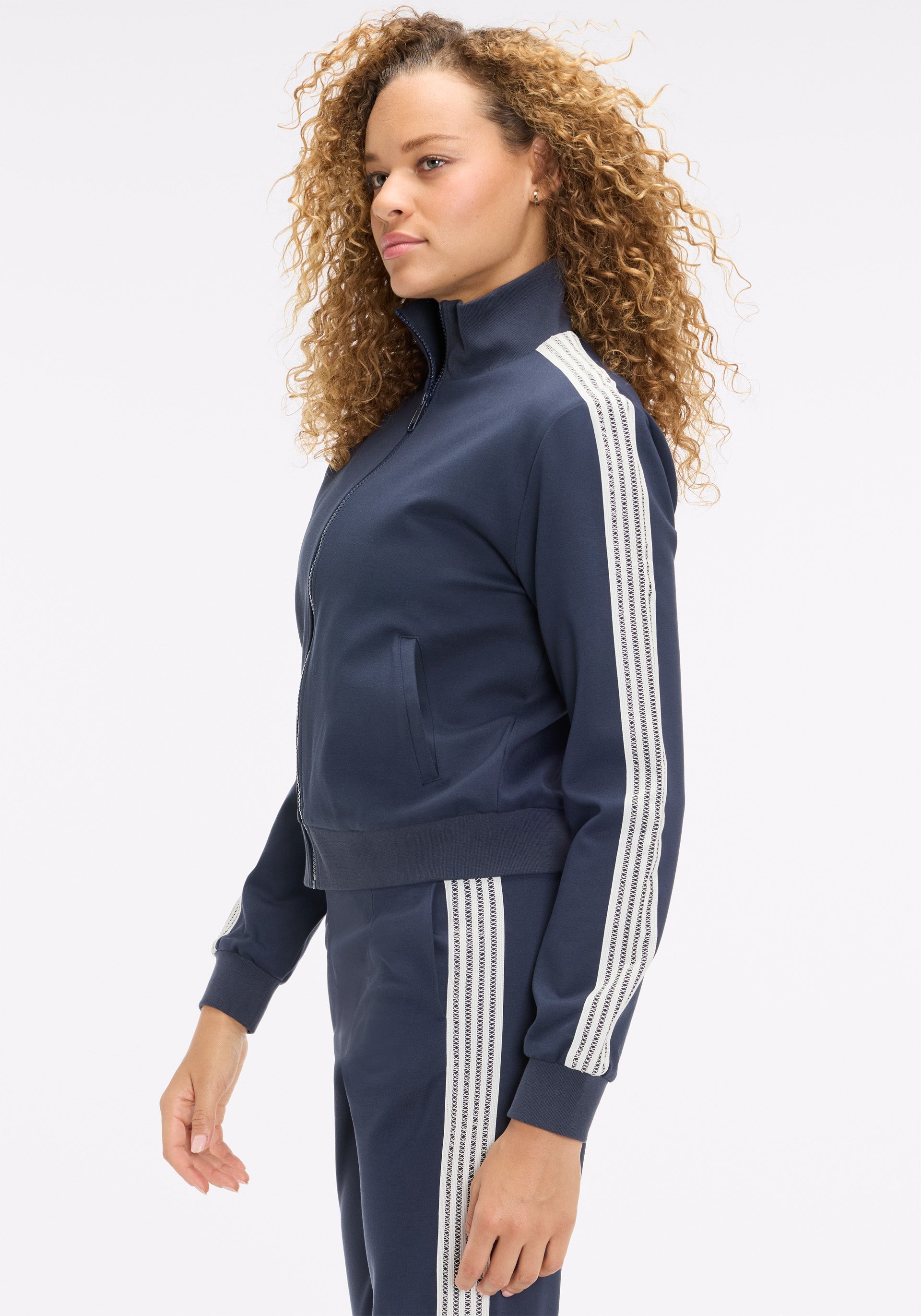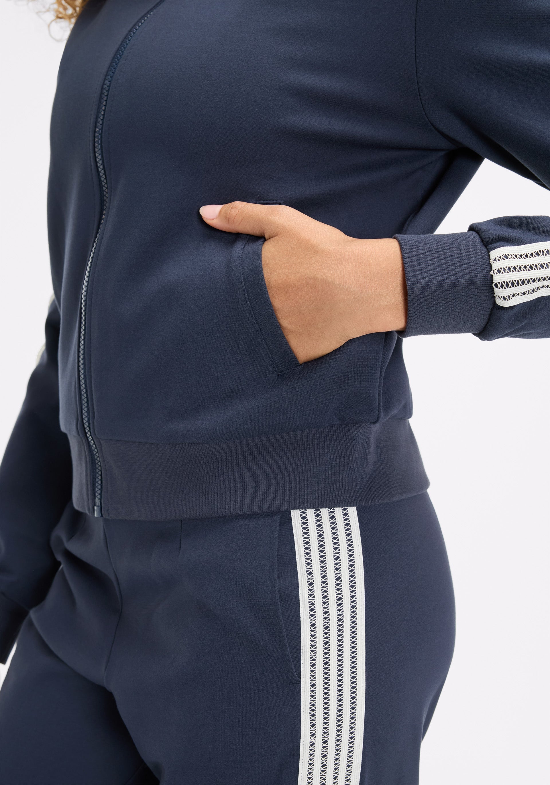• Full-zip jacket with functional welt pockets, lattice tape at sleeves, and rib detail at neckline, hem, and cuffs