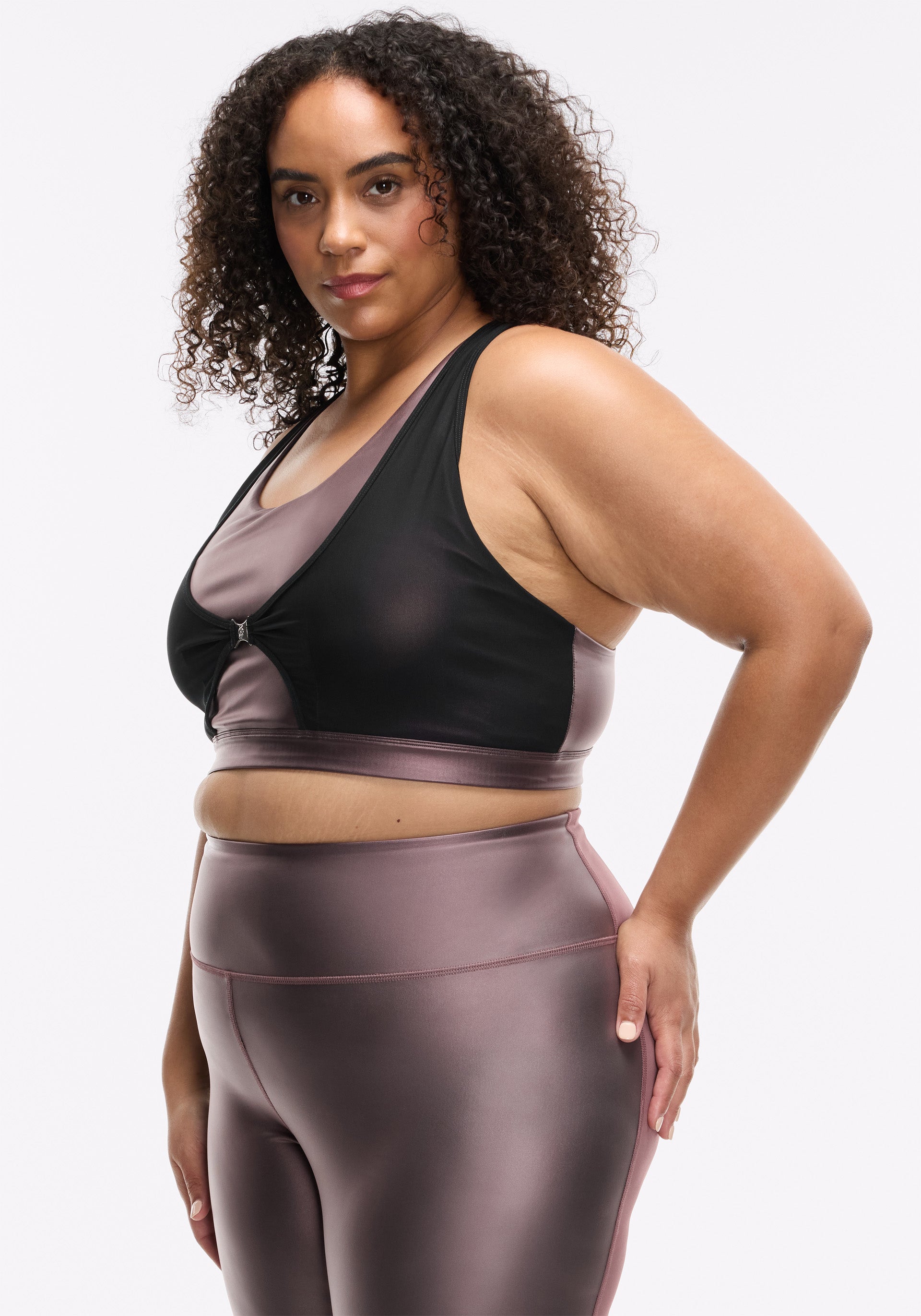 • Scoop neck bra with mesh overlay detail, adjustable straps, back bra clasp, and interior pockets for cup pads