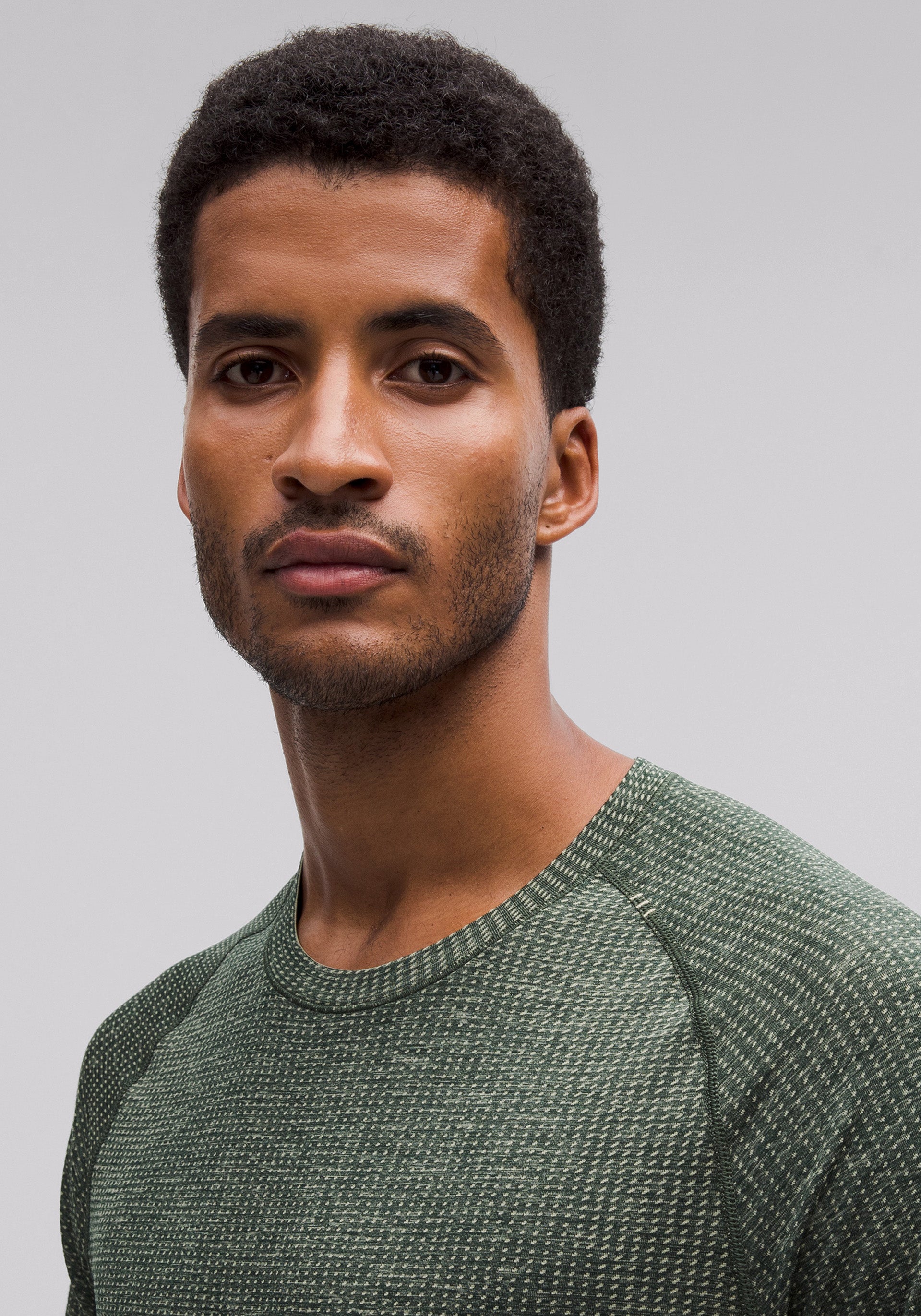 • Crewneck, short sleeve with no side seams so you can skip the chafe and a rebalanced fabric and fit for less cling on sweaty skin
