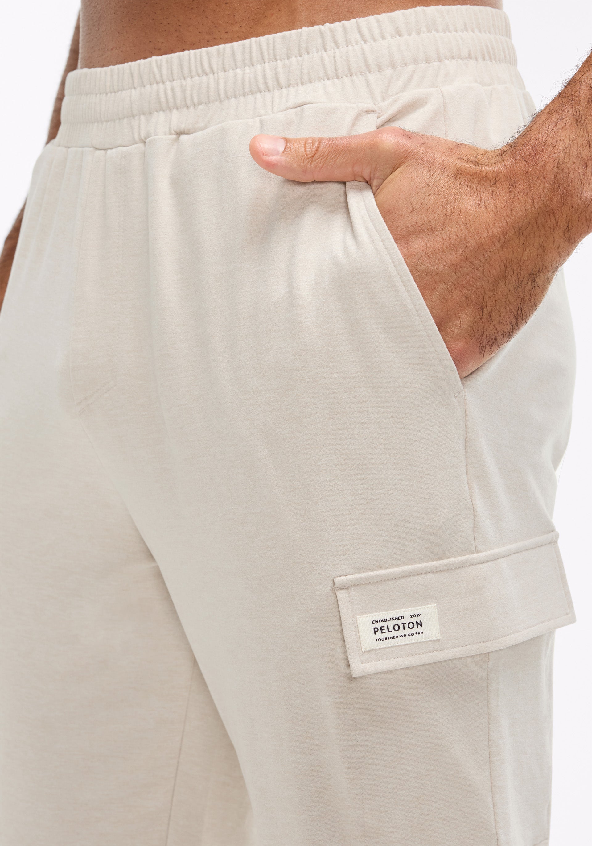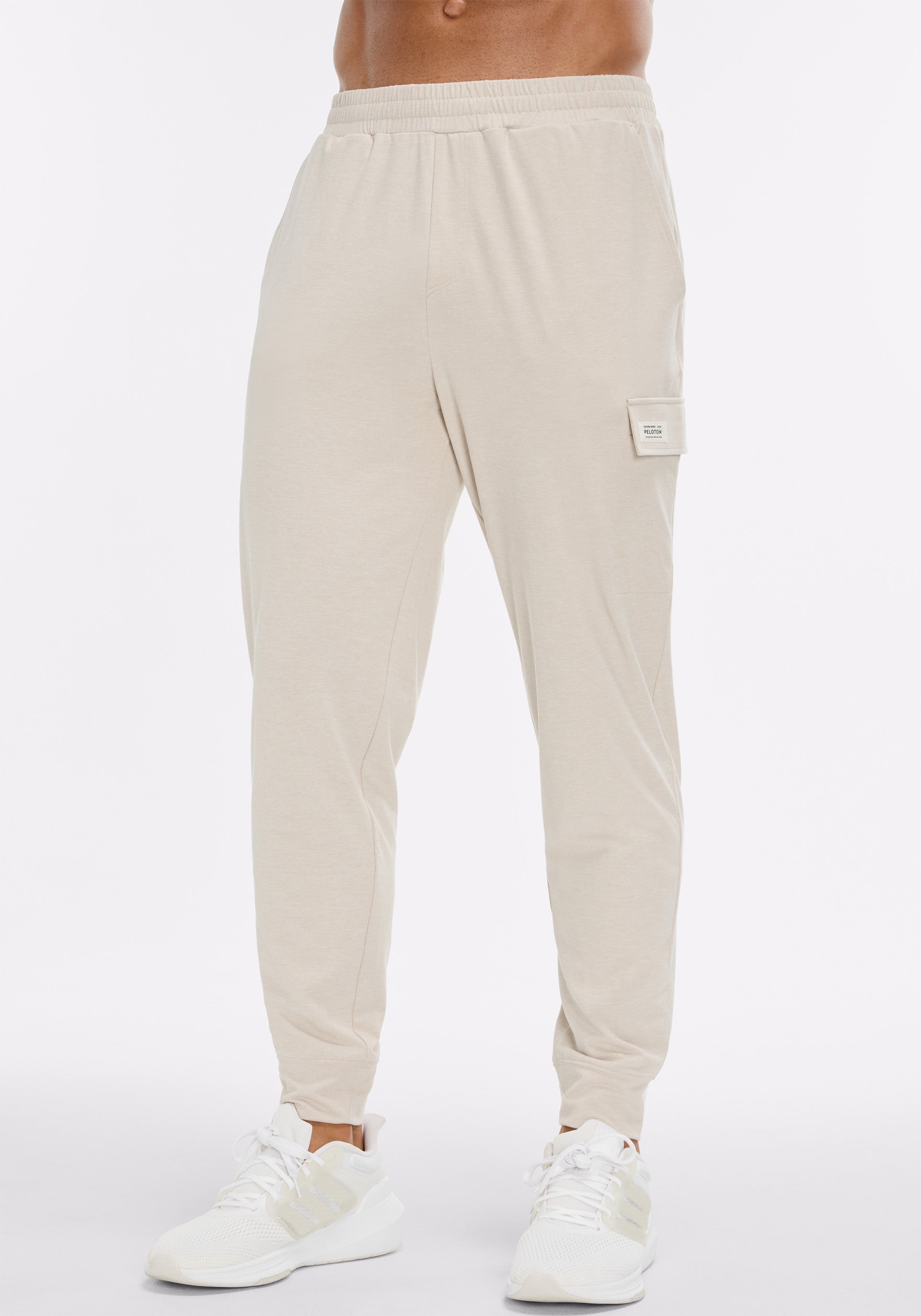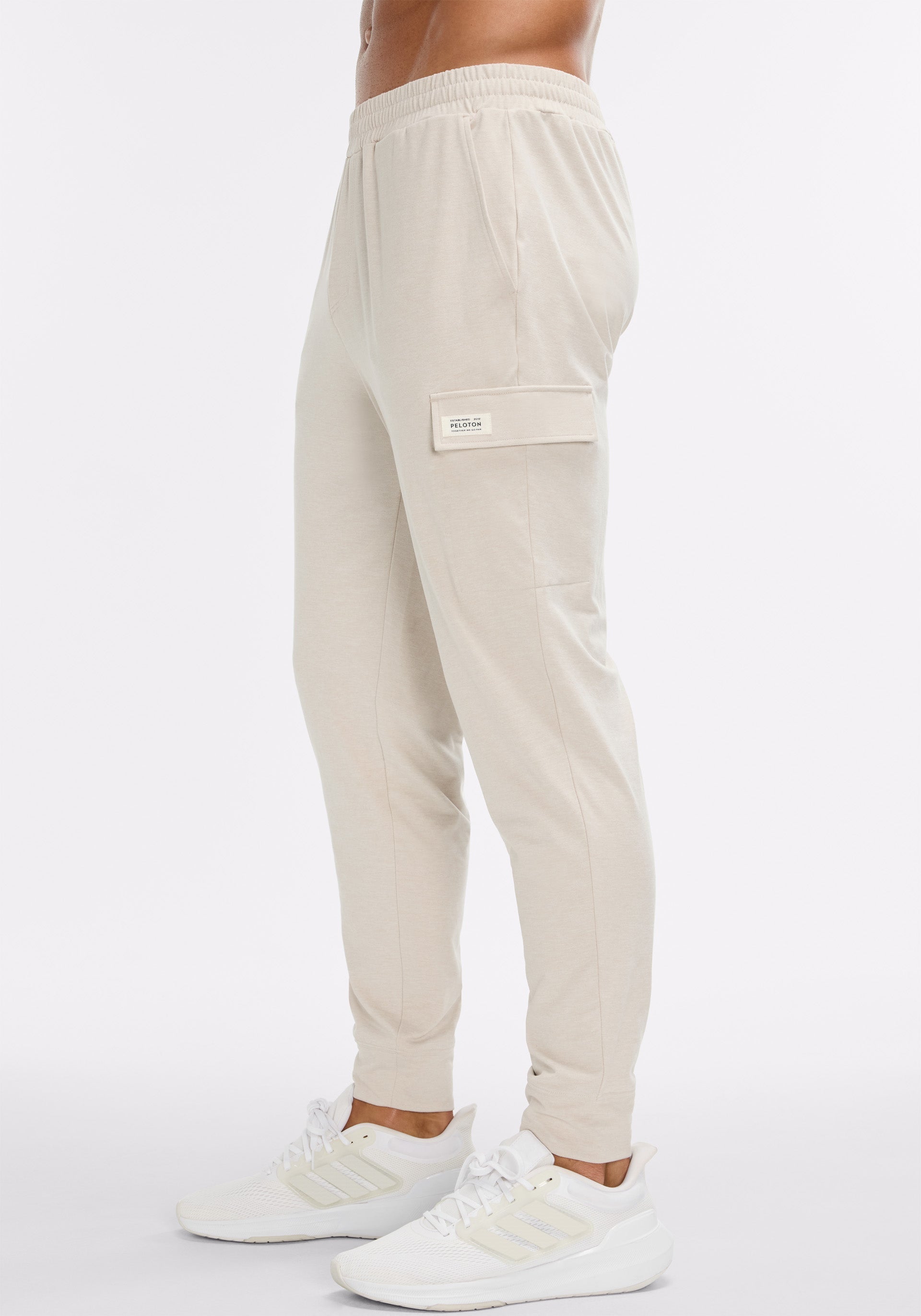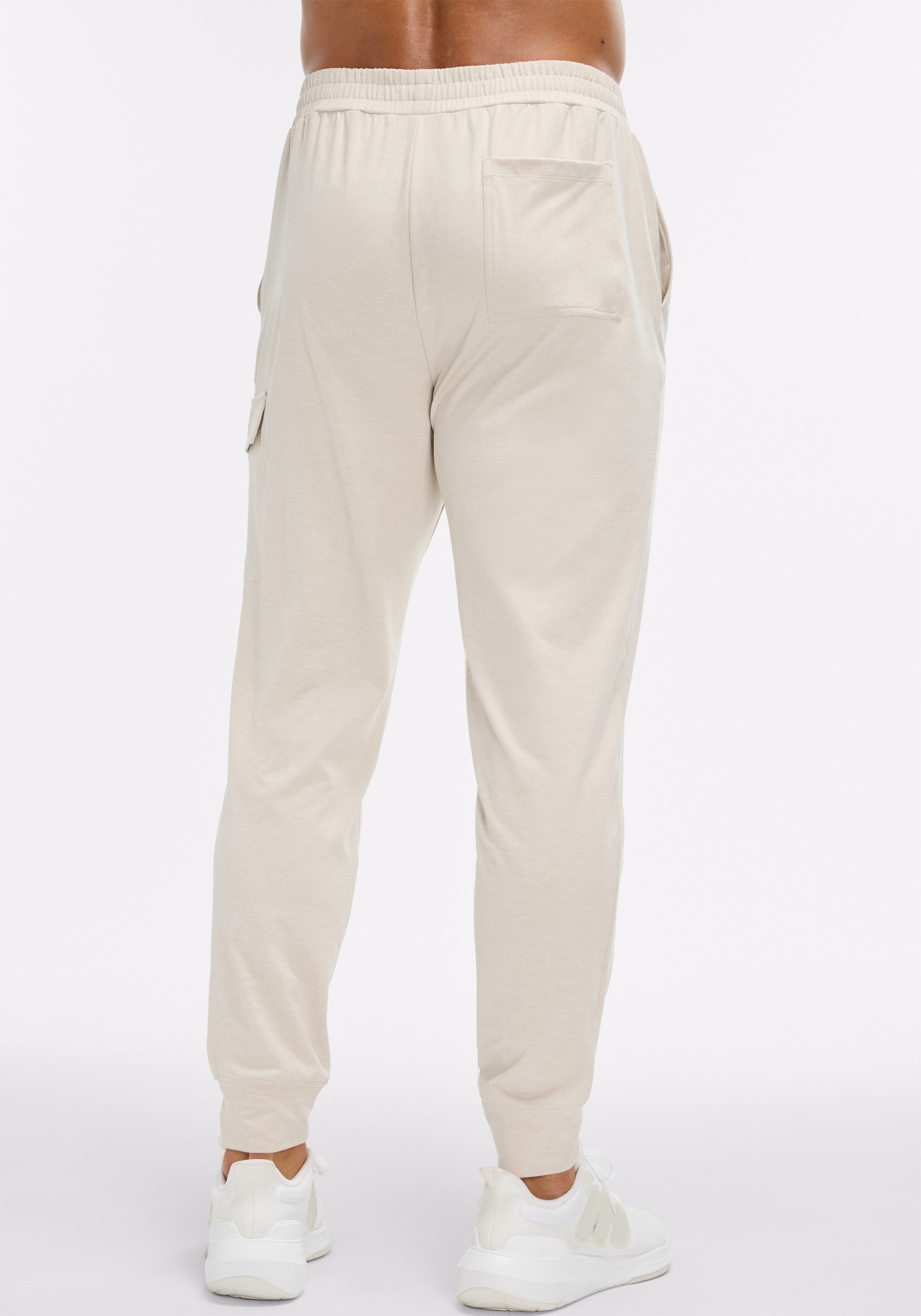 Classic jogger with side hand pockets, one cargo pocket, and elastic waistband with interior drawcord