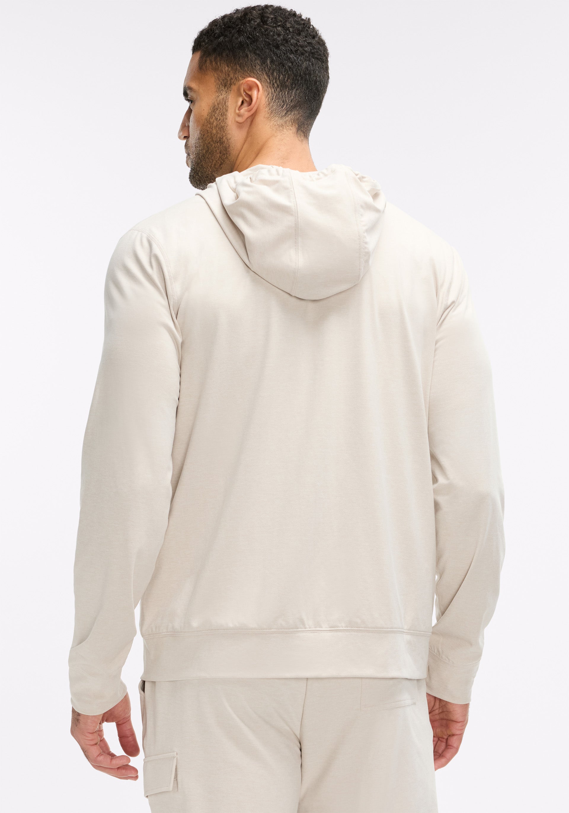 Full zip, hooded sweatshirt with exposed hood drawcord, side pockets, and self fabric cuffs and bottom hem