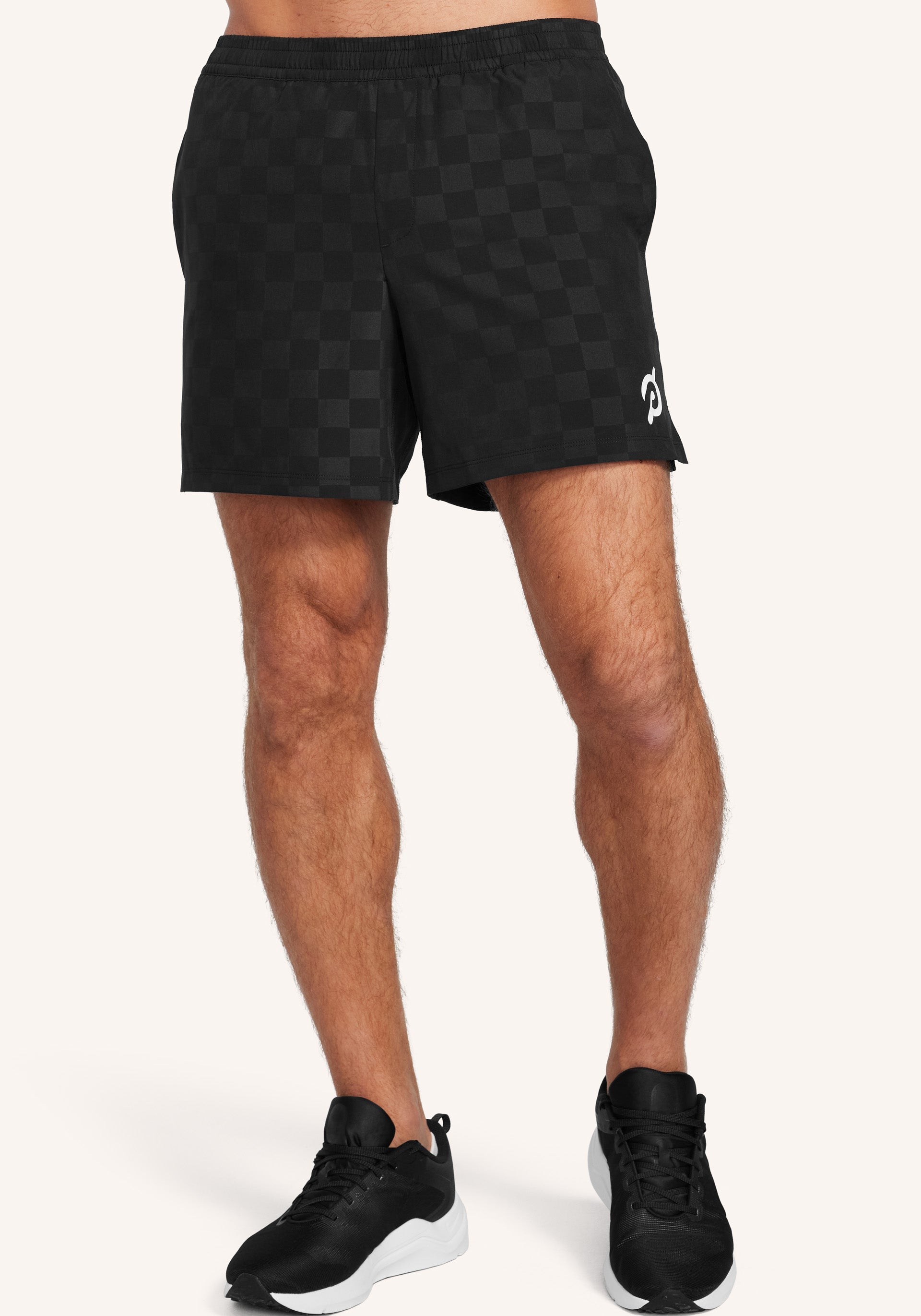 • 6” inseam, lined short with encased functional gusset, elastic waistband with adjustable drawcord, back yoke detailing, on seam front pockets, and zippered security pocket at right side seam