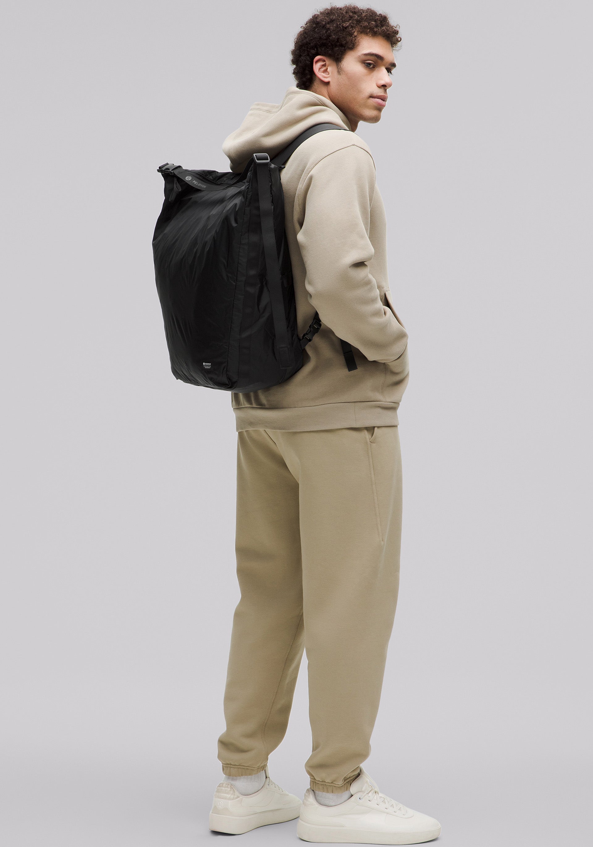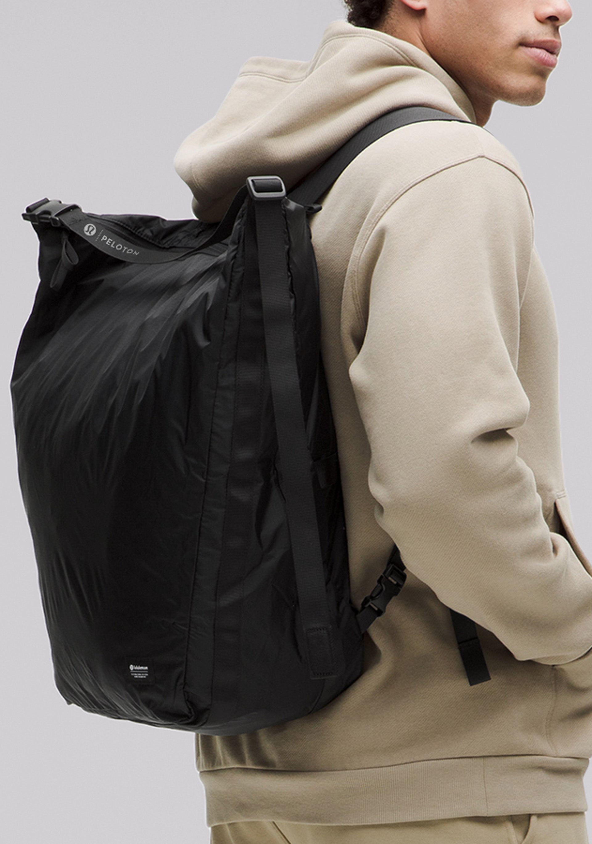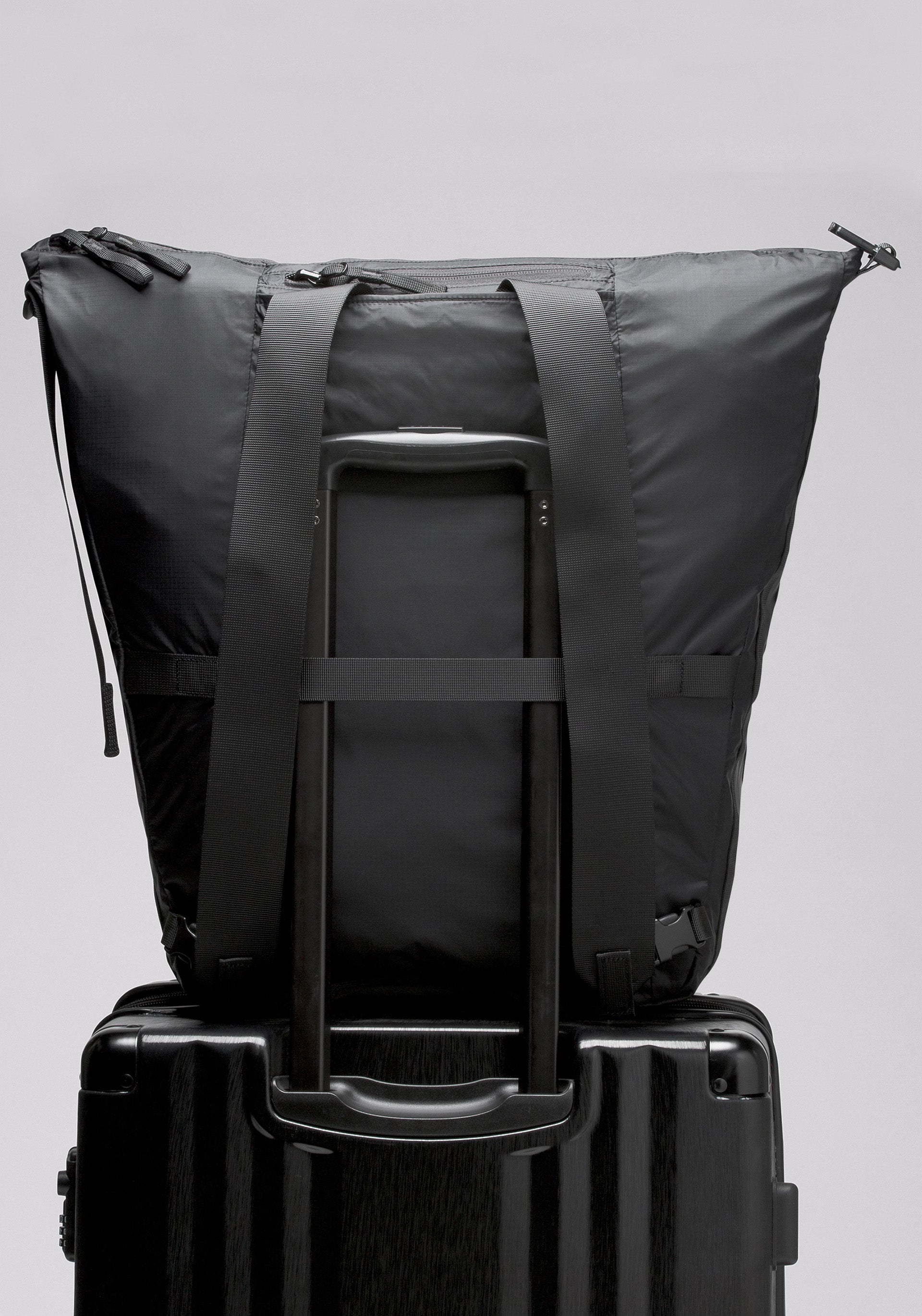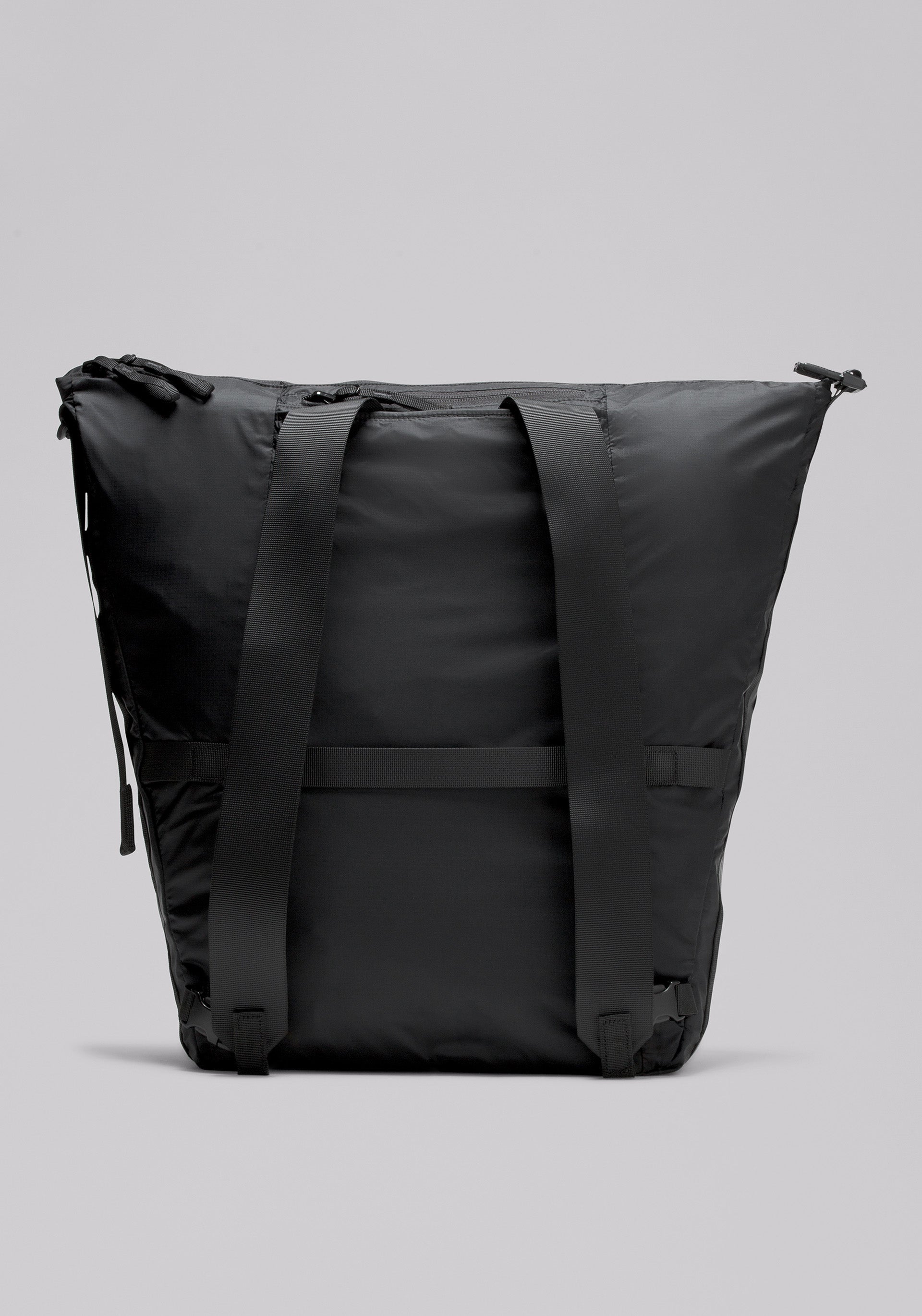 • Convertible bag doubling as a tote or backpack with zippered main compartment, exterior zippered pocket, and packable into smaller pouch with buckle closure