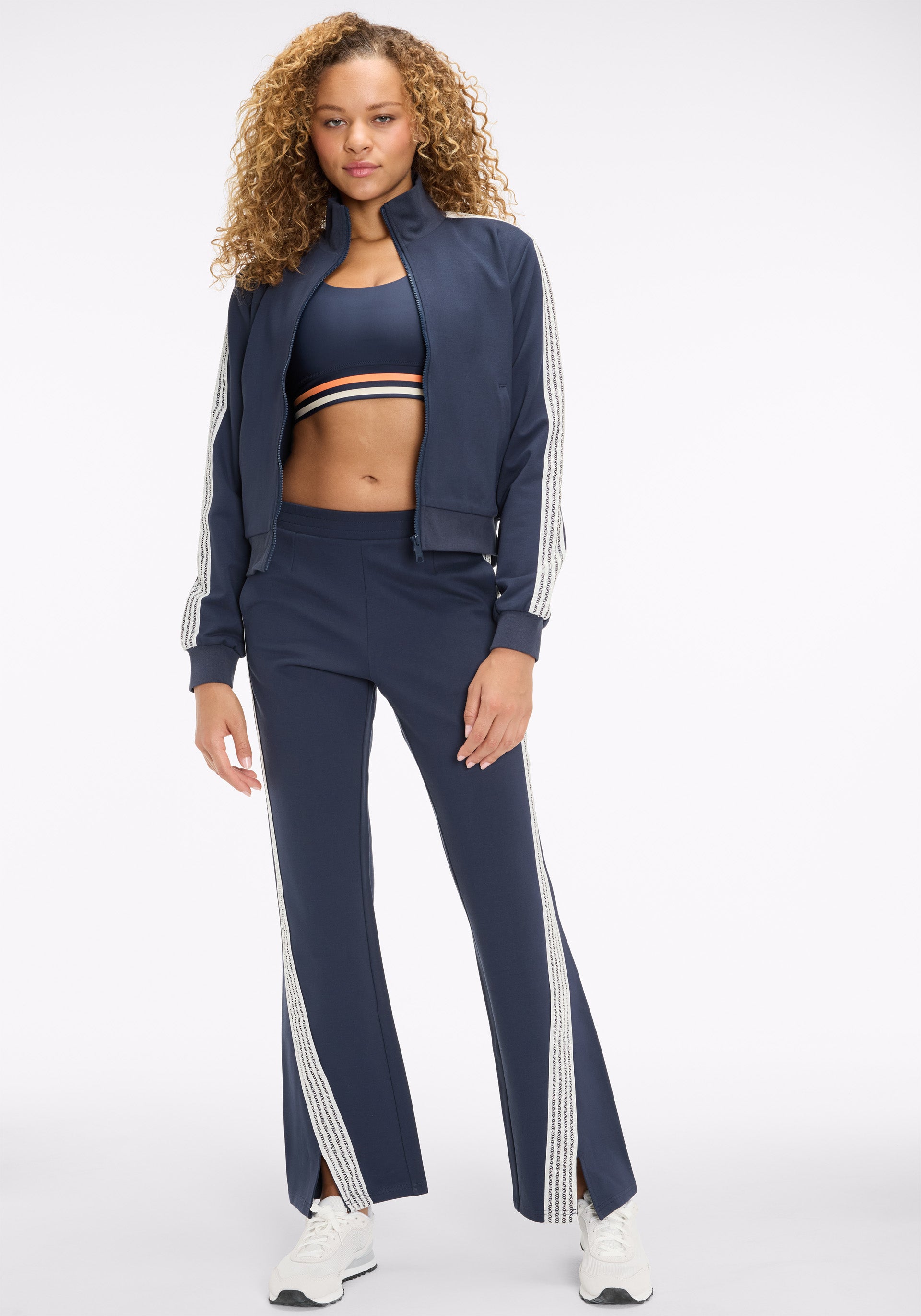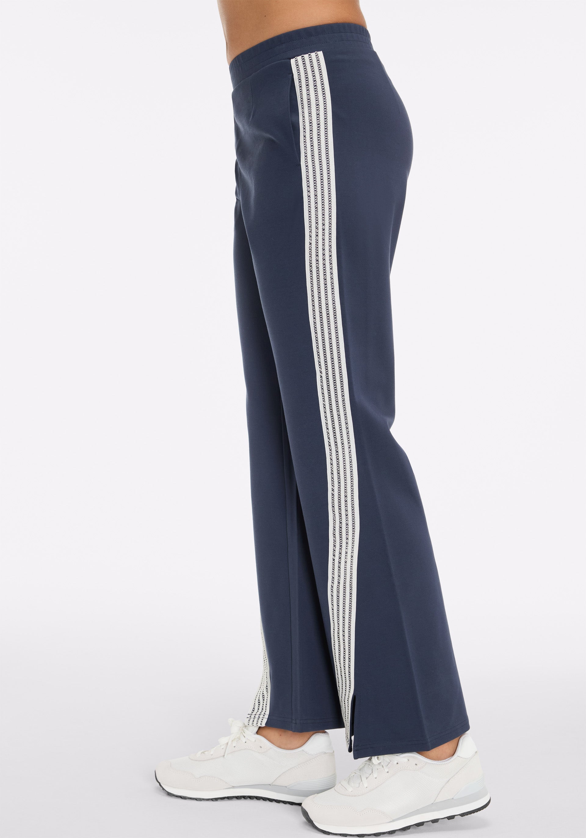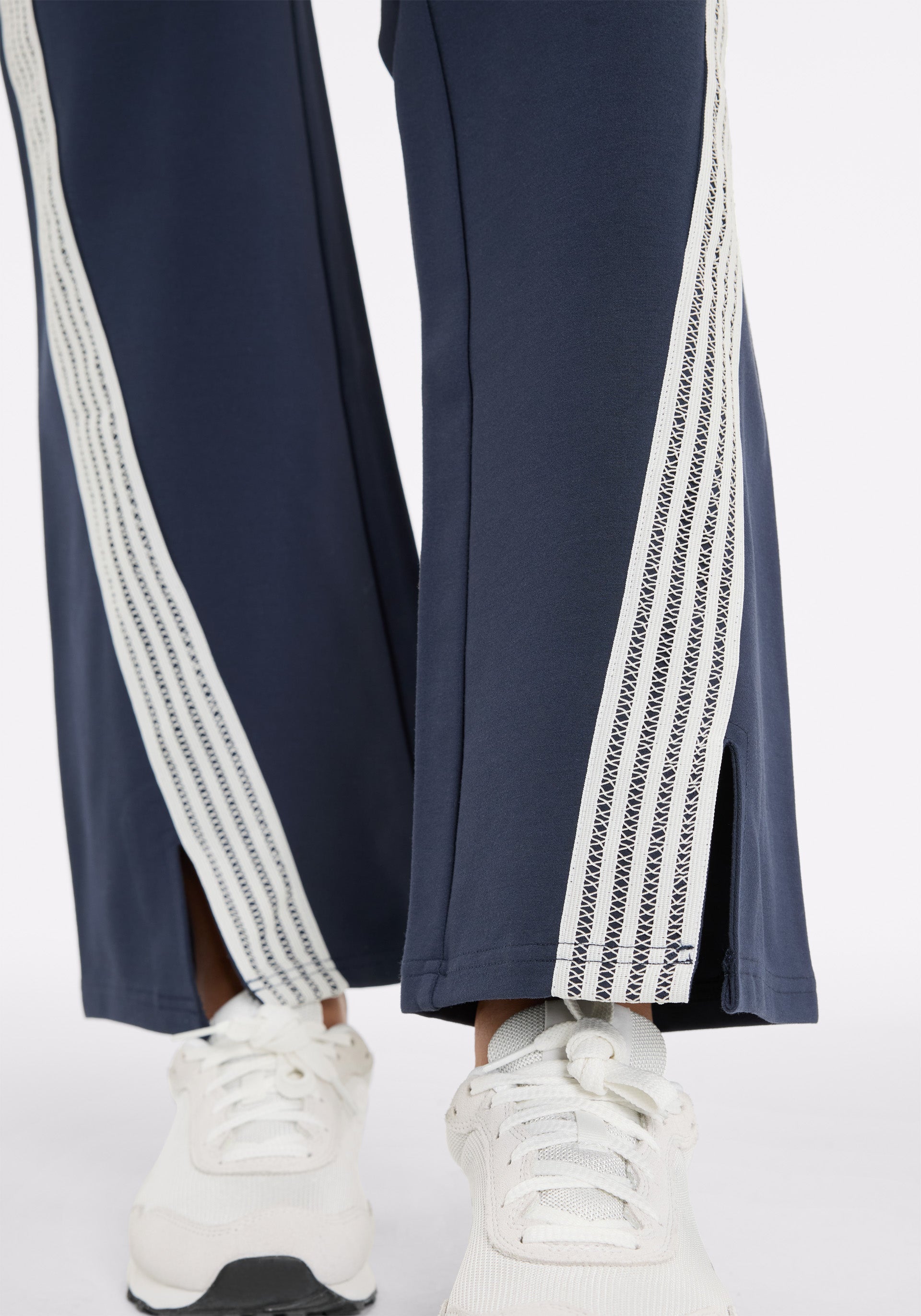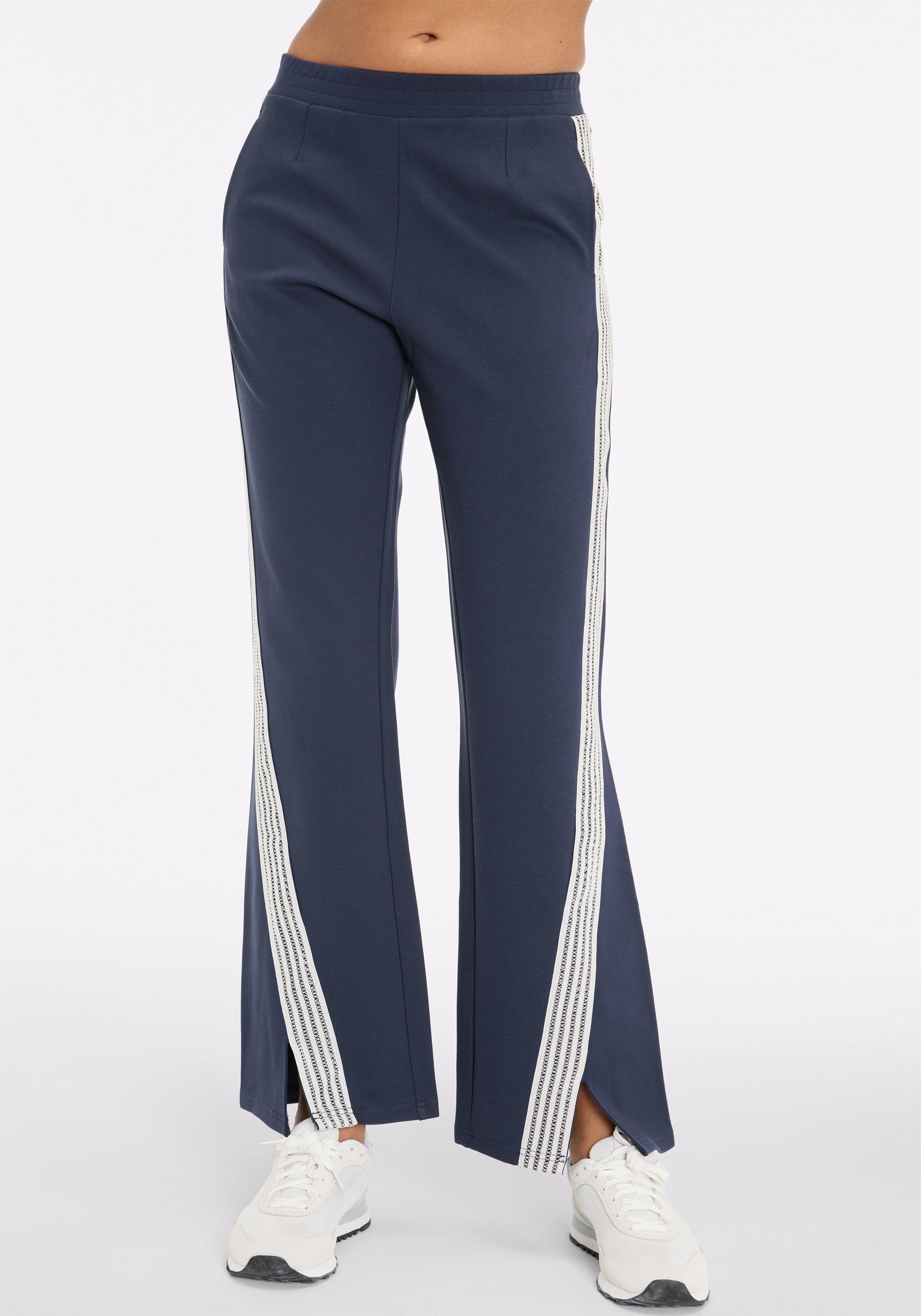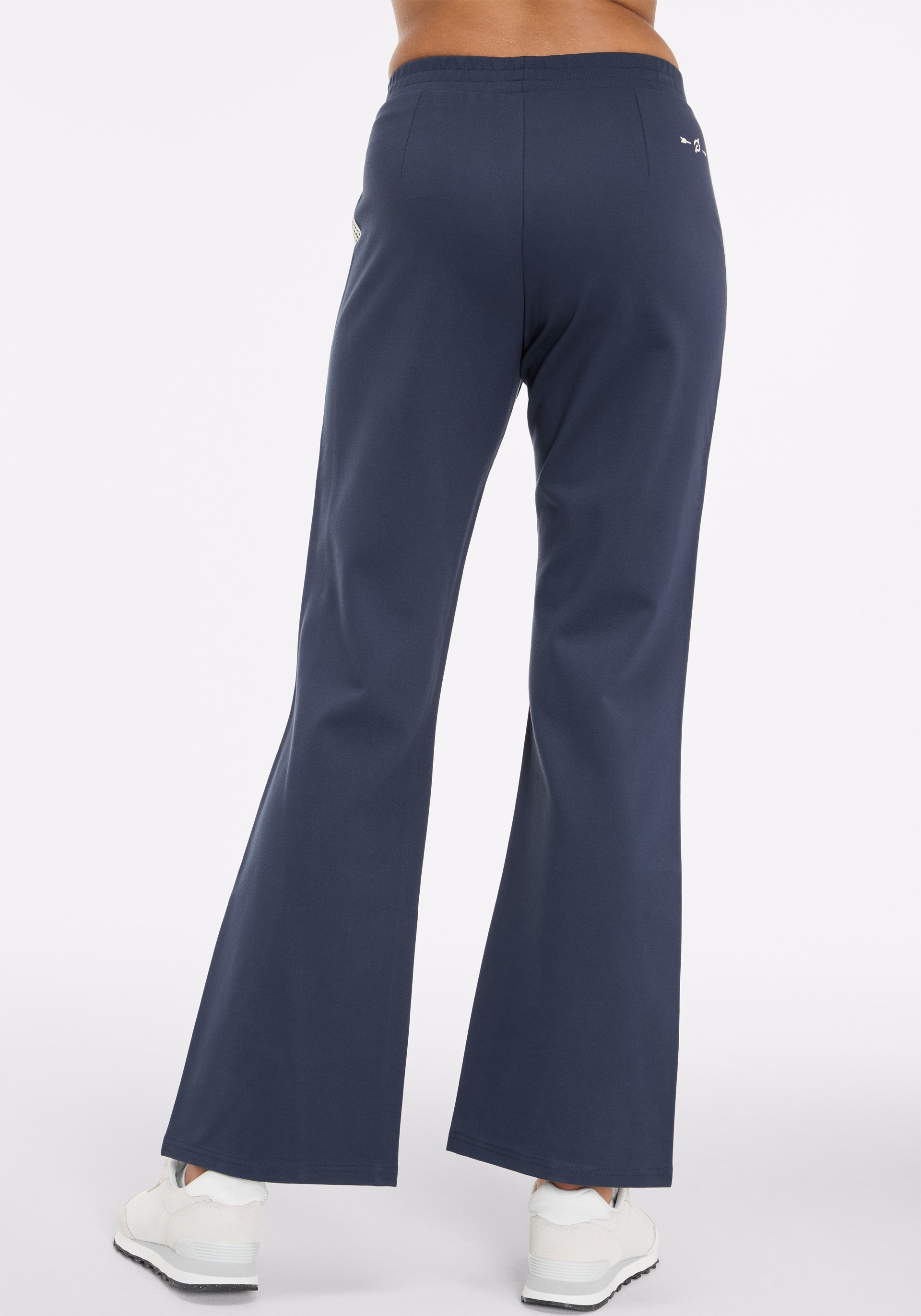 • Soft tailored flare pant with elasticated waistband, side seam pockets, and lattice tape at outer leg