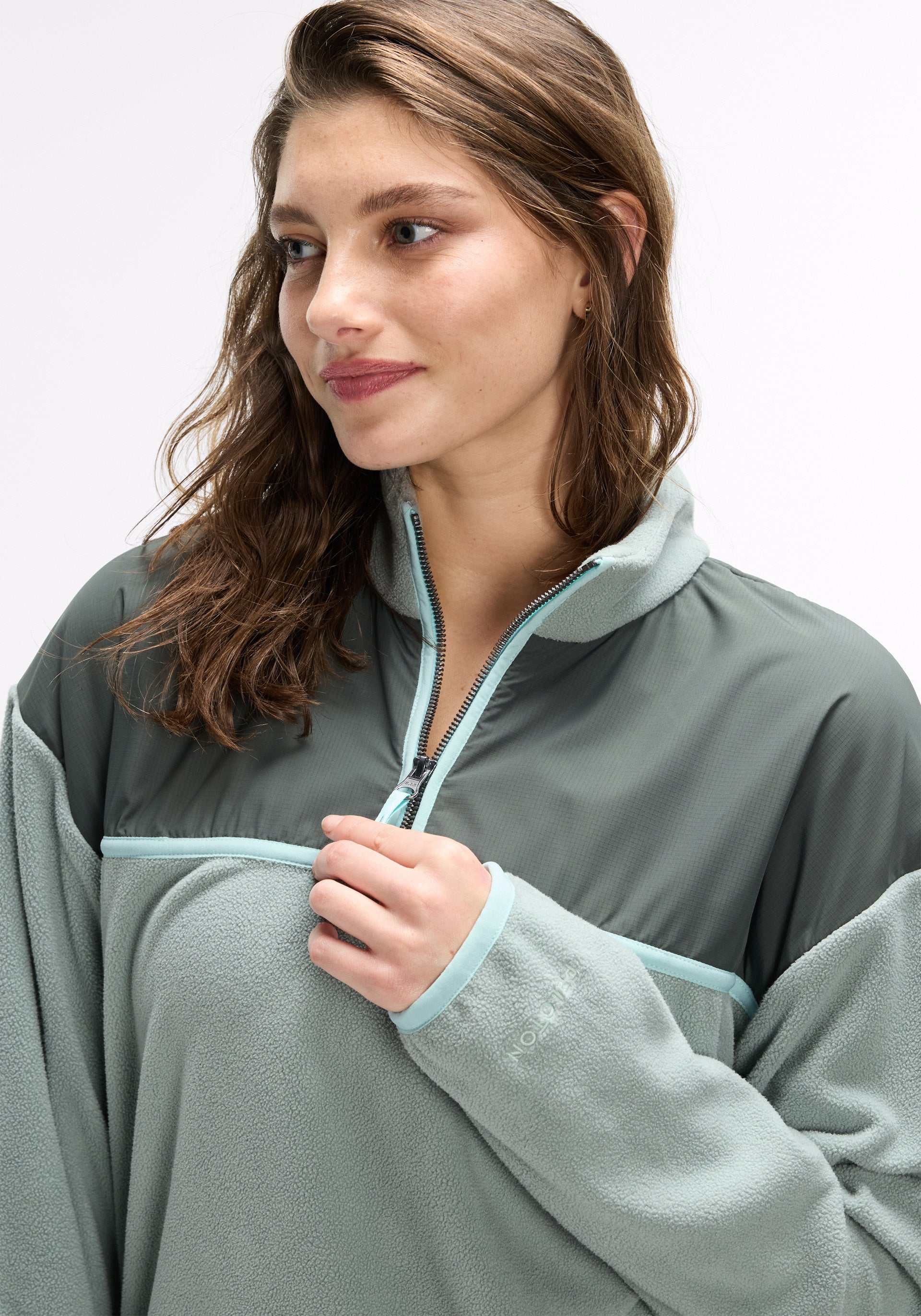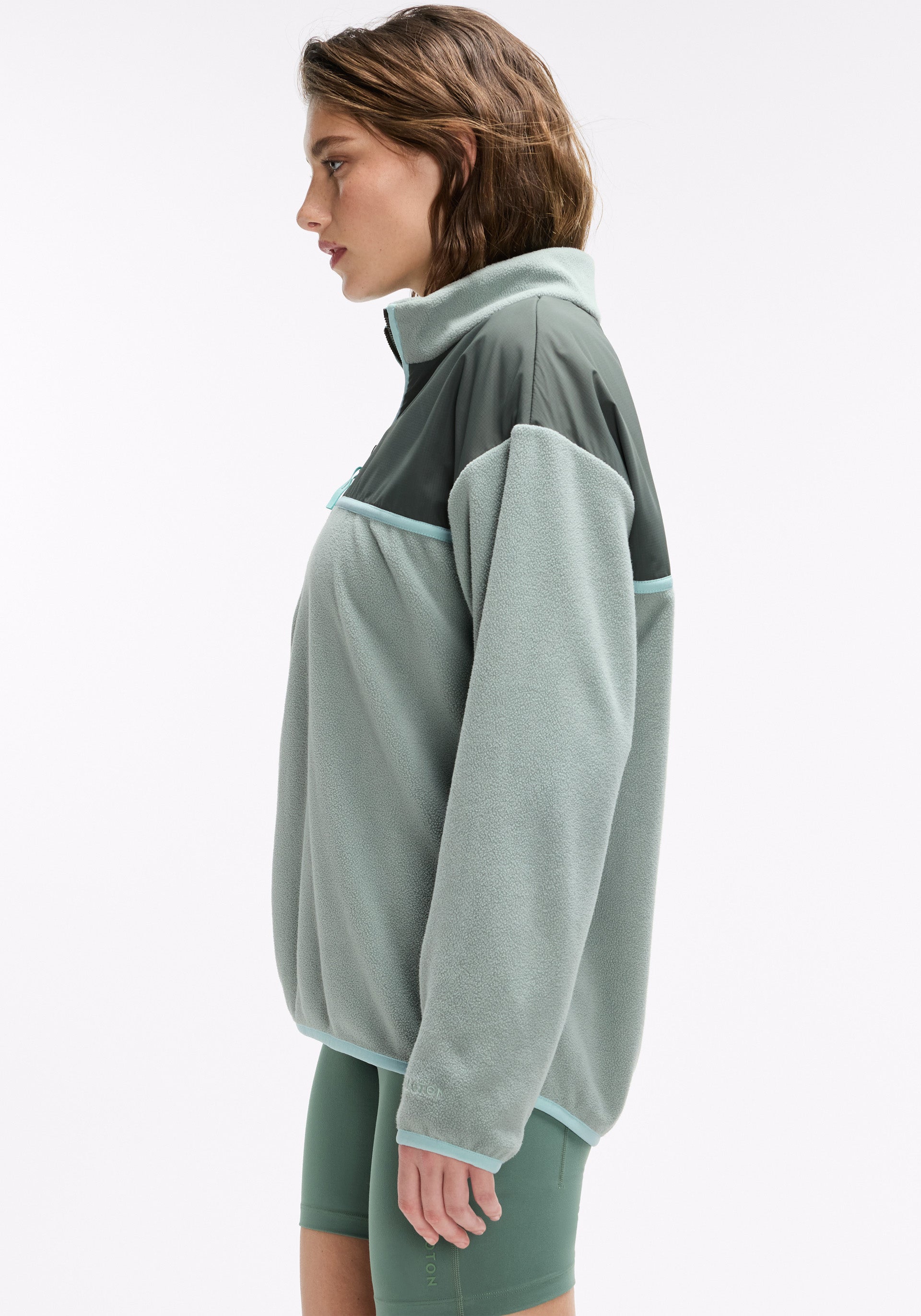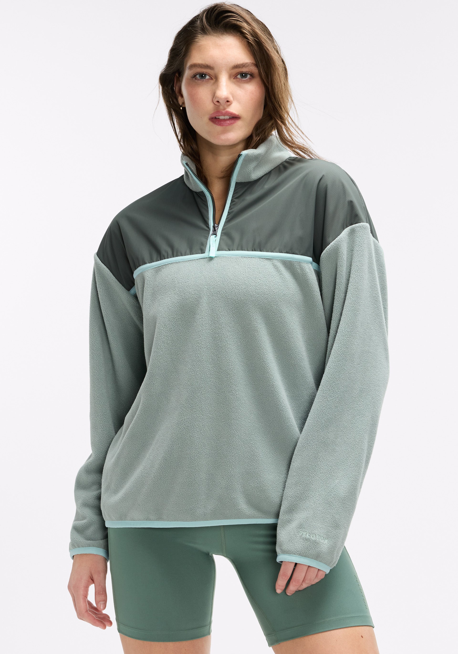 • Fleece ¼ zip with contrast hiking ripstop, elastic binding at hem and cuff, and zipper pull