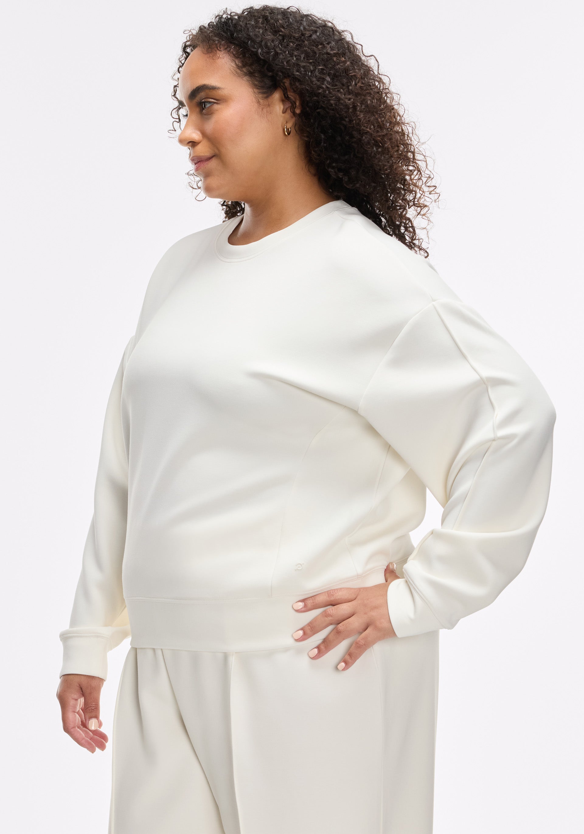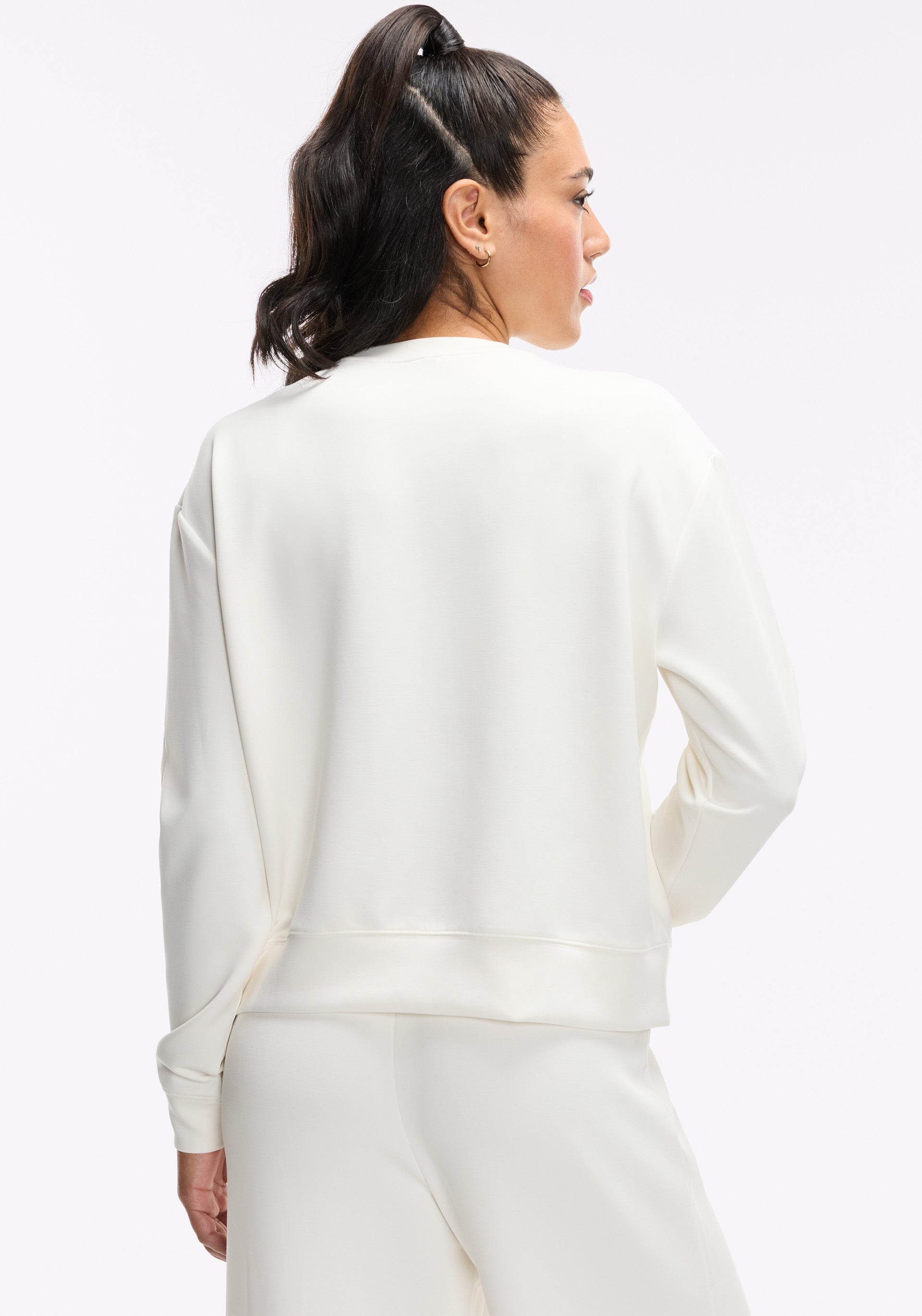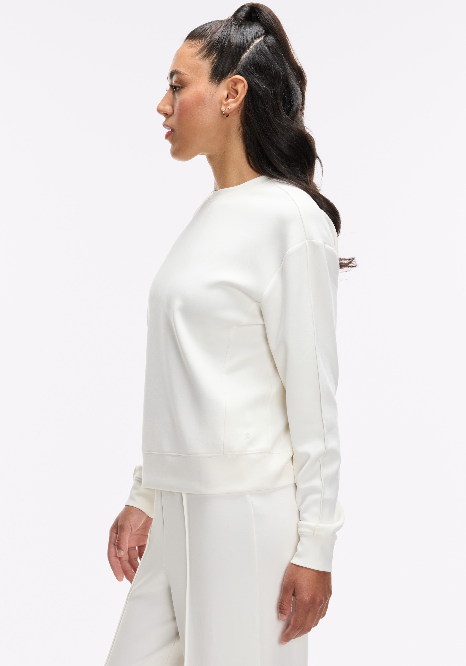 • Crewneck with forward side seams, self cuffs and bottom band, and pintuck detail at sleeves