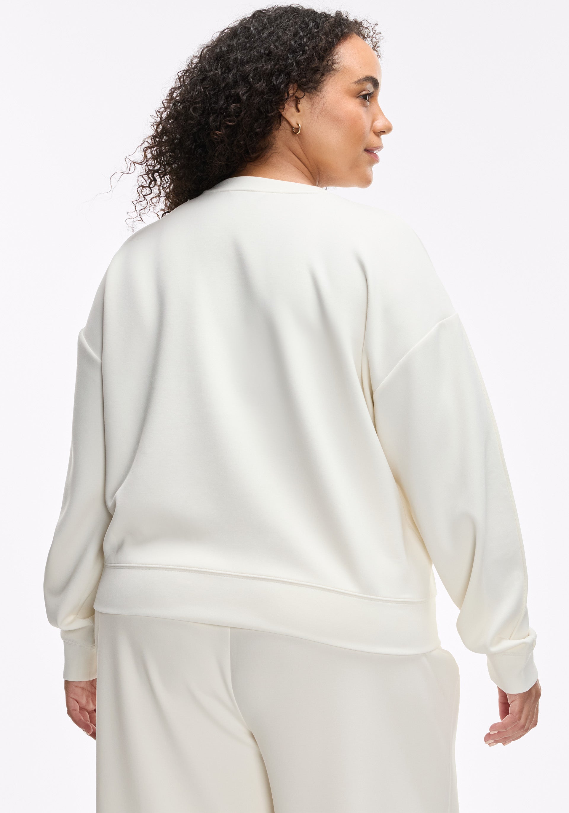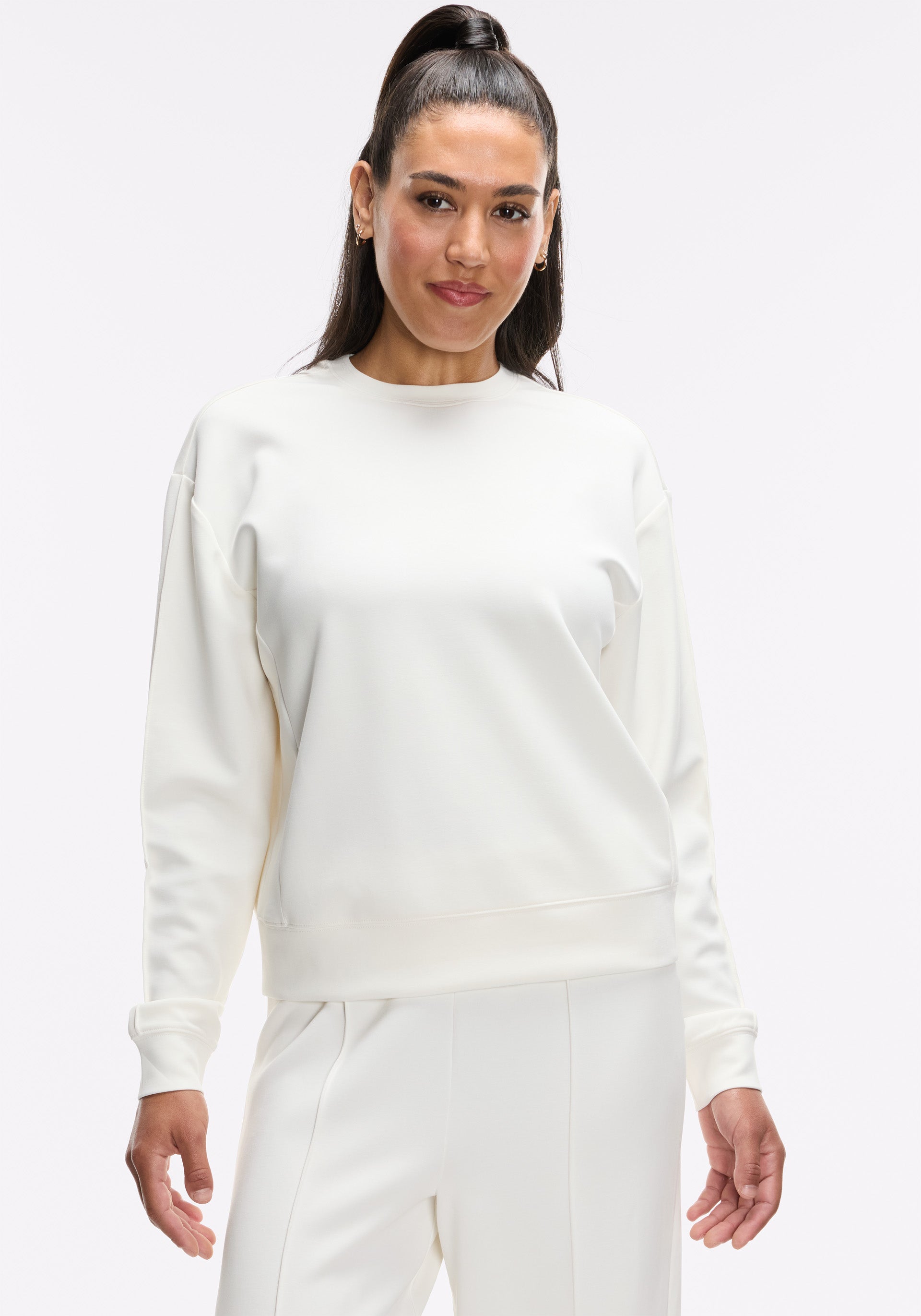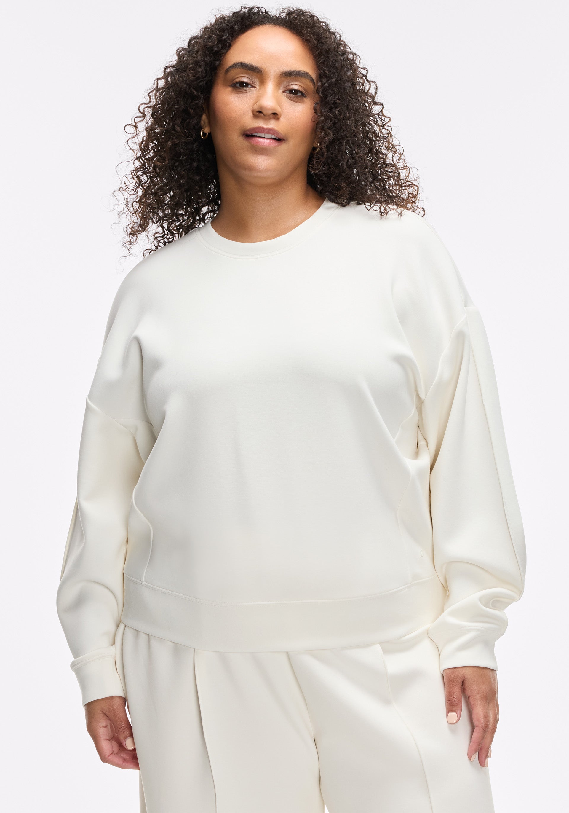 • Crewneck with forward side seams, self cuffs and bottom band, and pintuck detail at sleeves