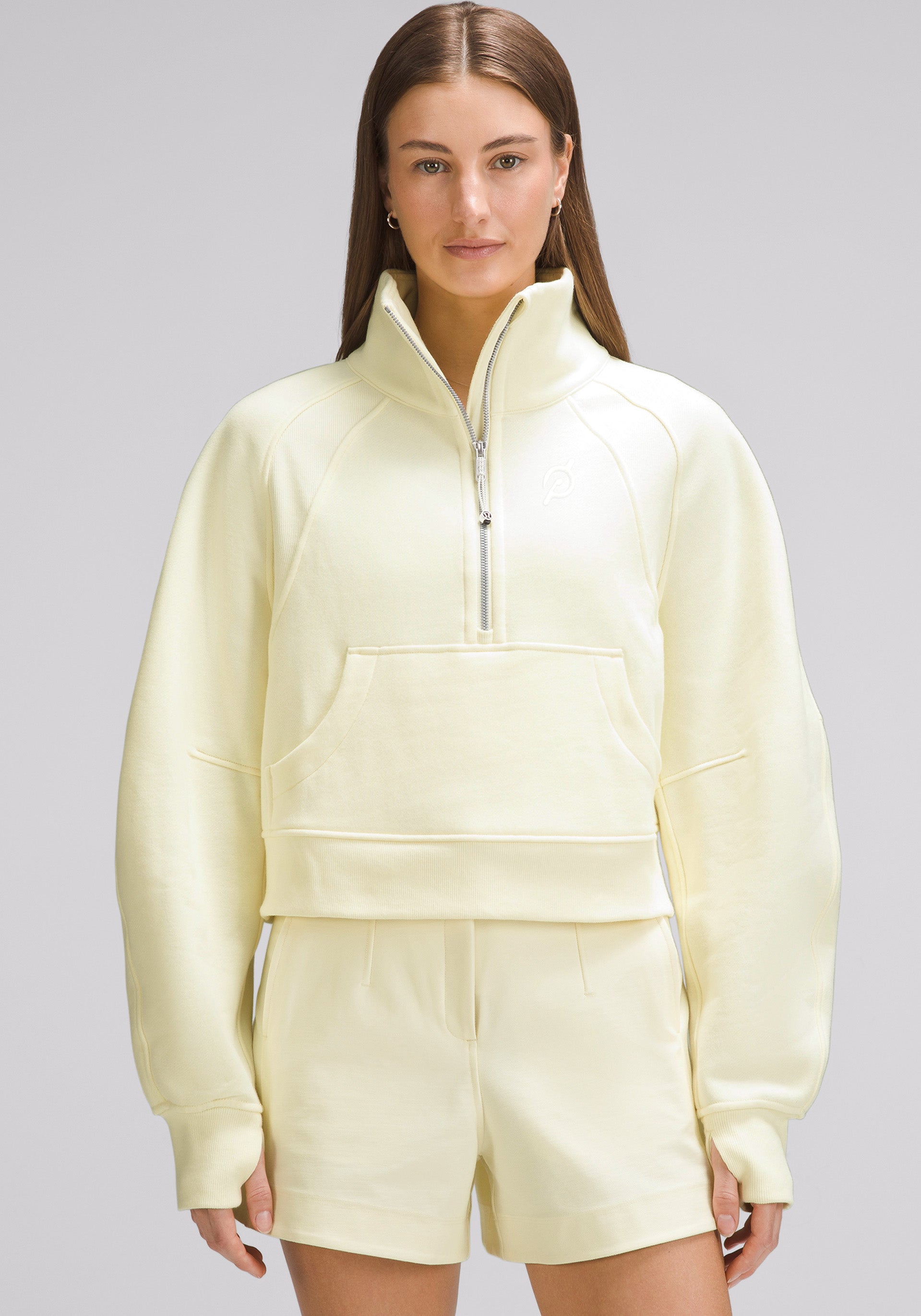 • High neck, half-zip pullover with elastic zipper pull that doubles as an emergency hair tie, kangaroo pocket with hidden phone sleeve, zipper garage, and thumbholes