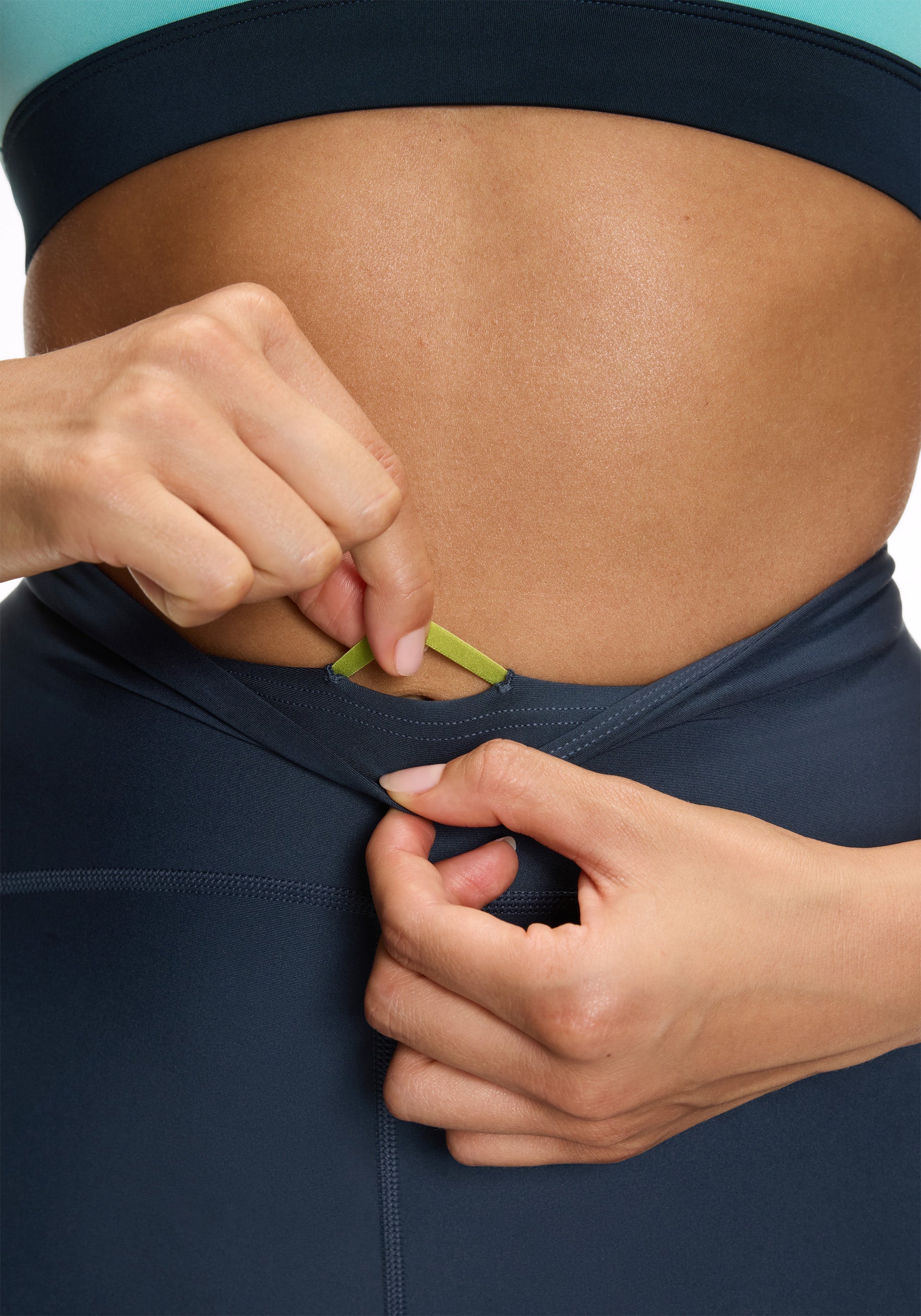 • High rise, 25" inseam legging with pop-stitch detailing, curved waistband, and a contrast interior drawcord