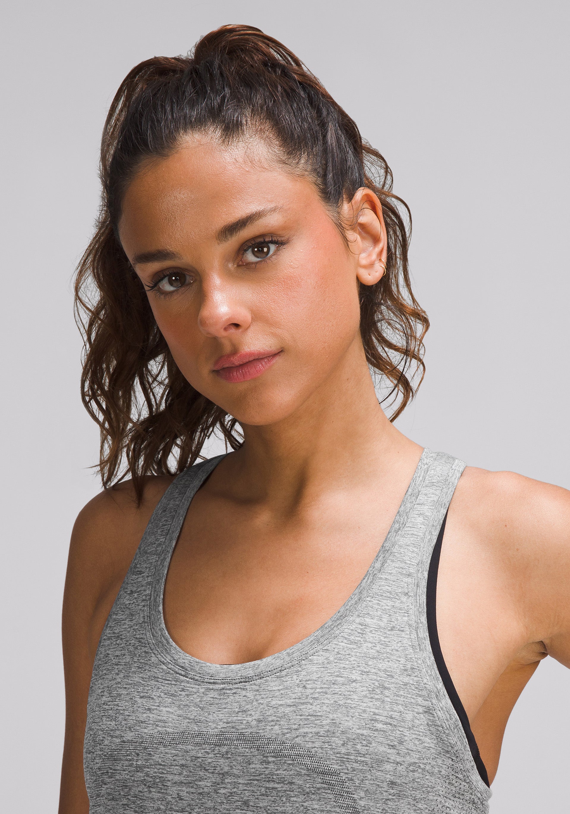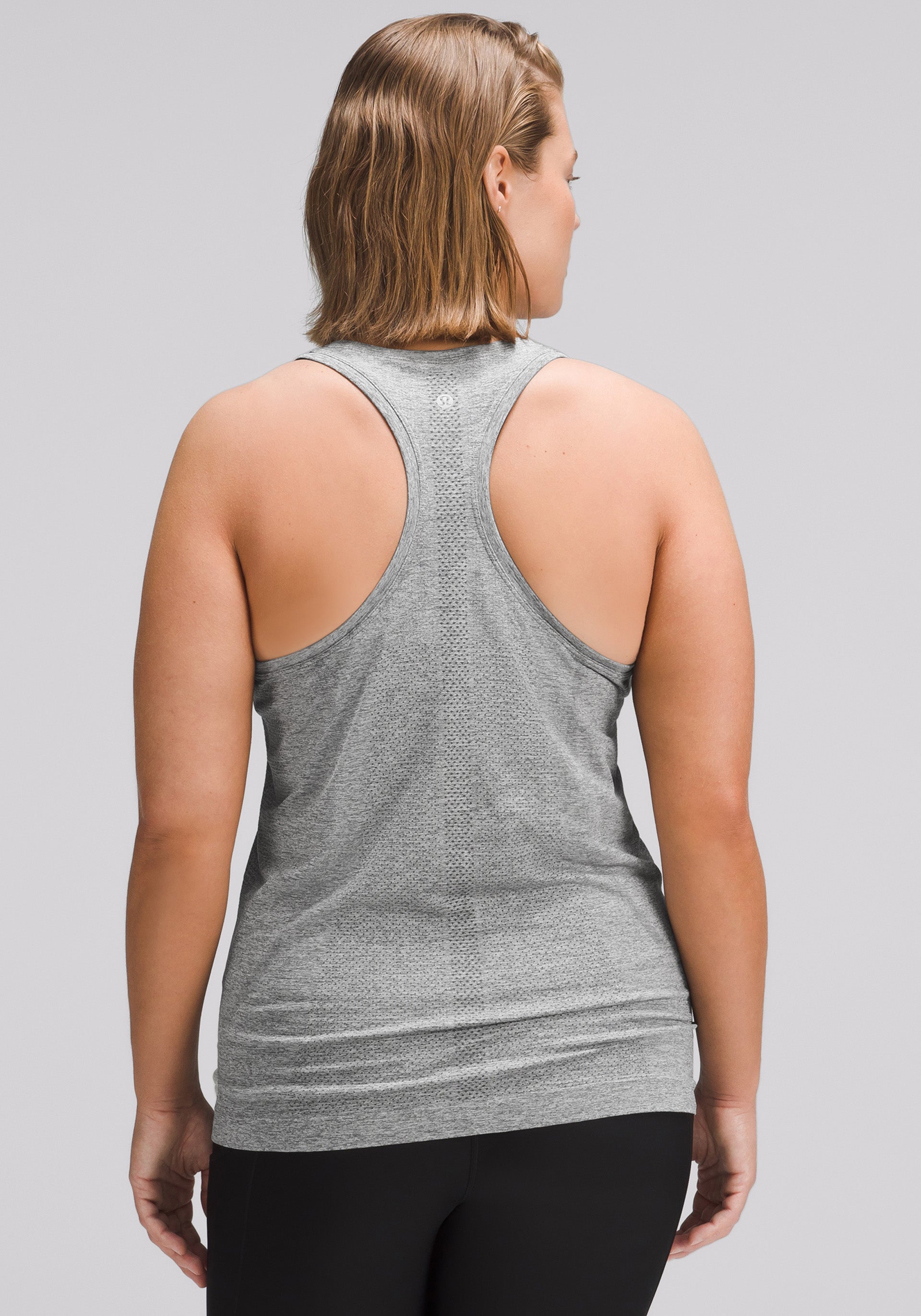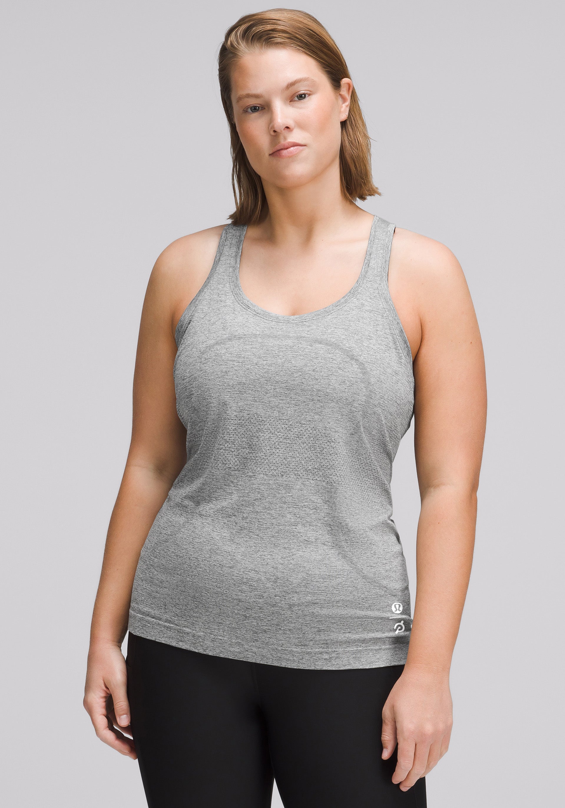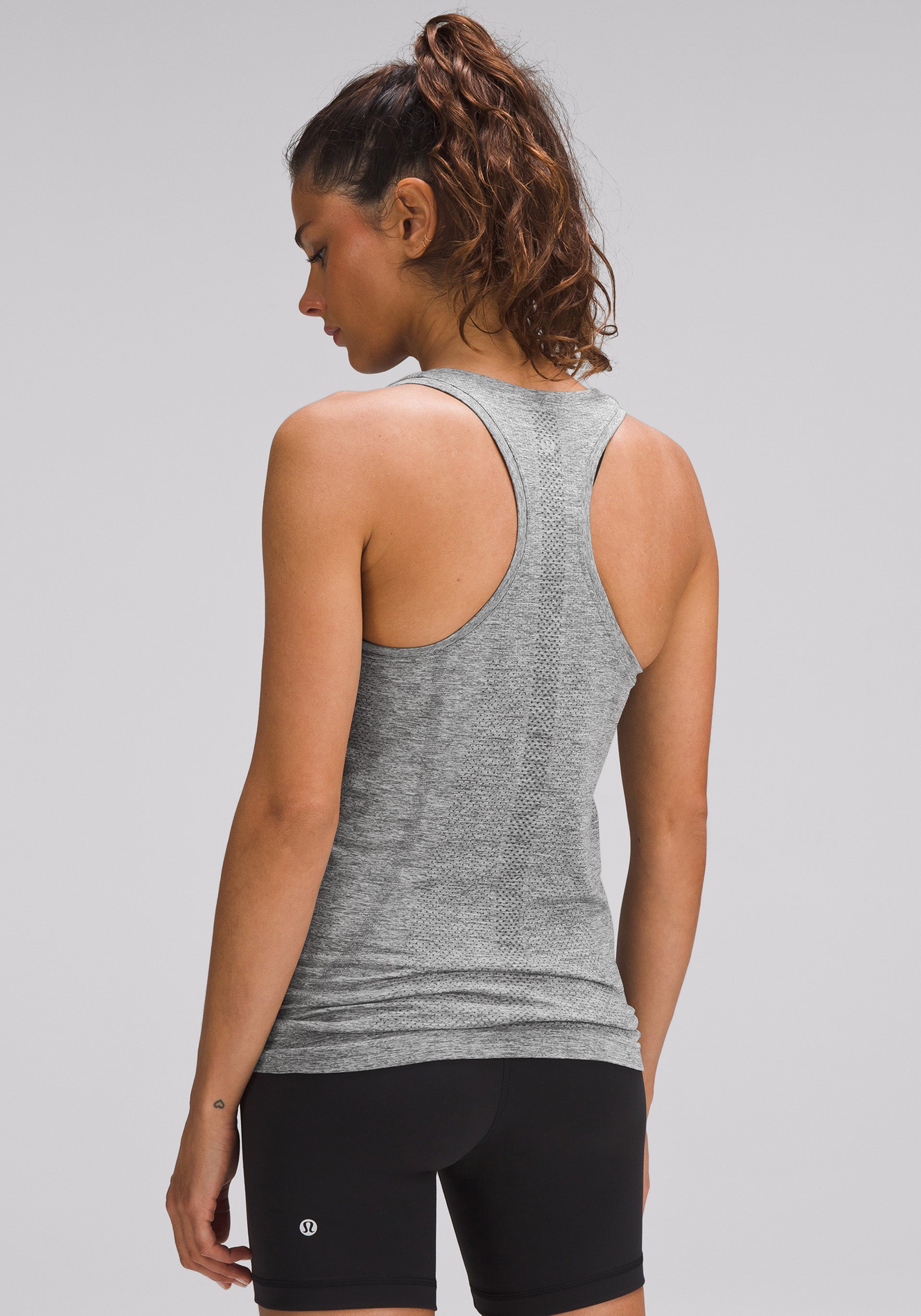 Slim fit, seamless racerback tank that sits below the waistband for moderate, everyday coverage