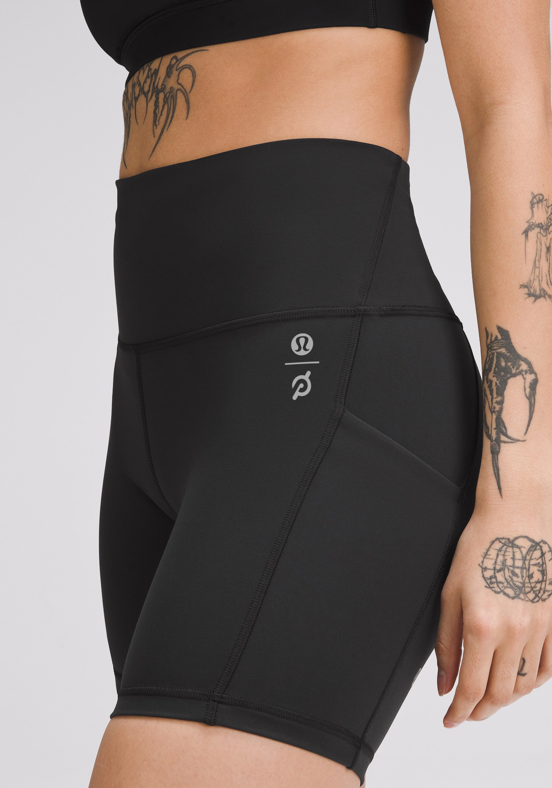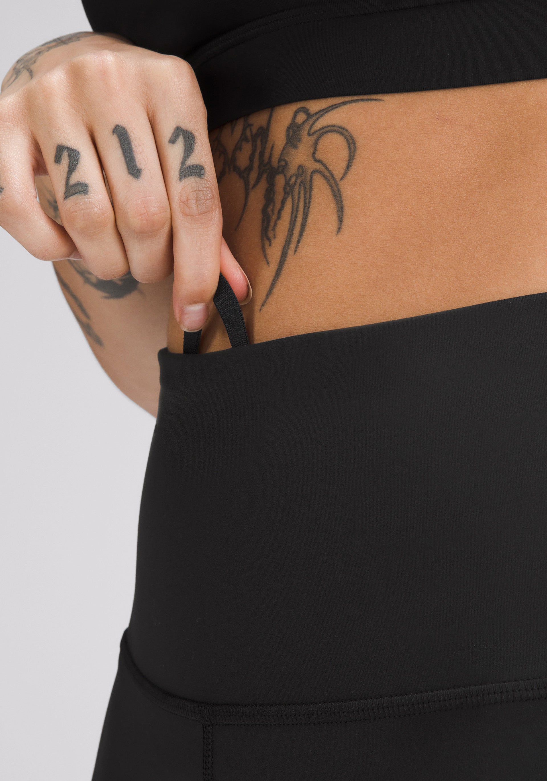 High Rise, 6” inseam short with side drop-in pockets, waistband drawcord to keeps the waistband where you want it and a hidden pocket in the waistband for your card and keys