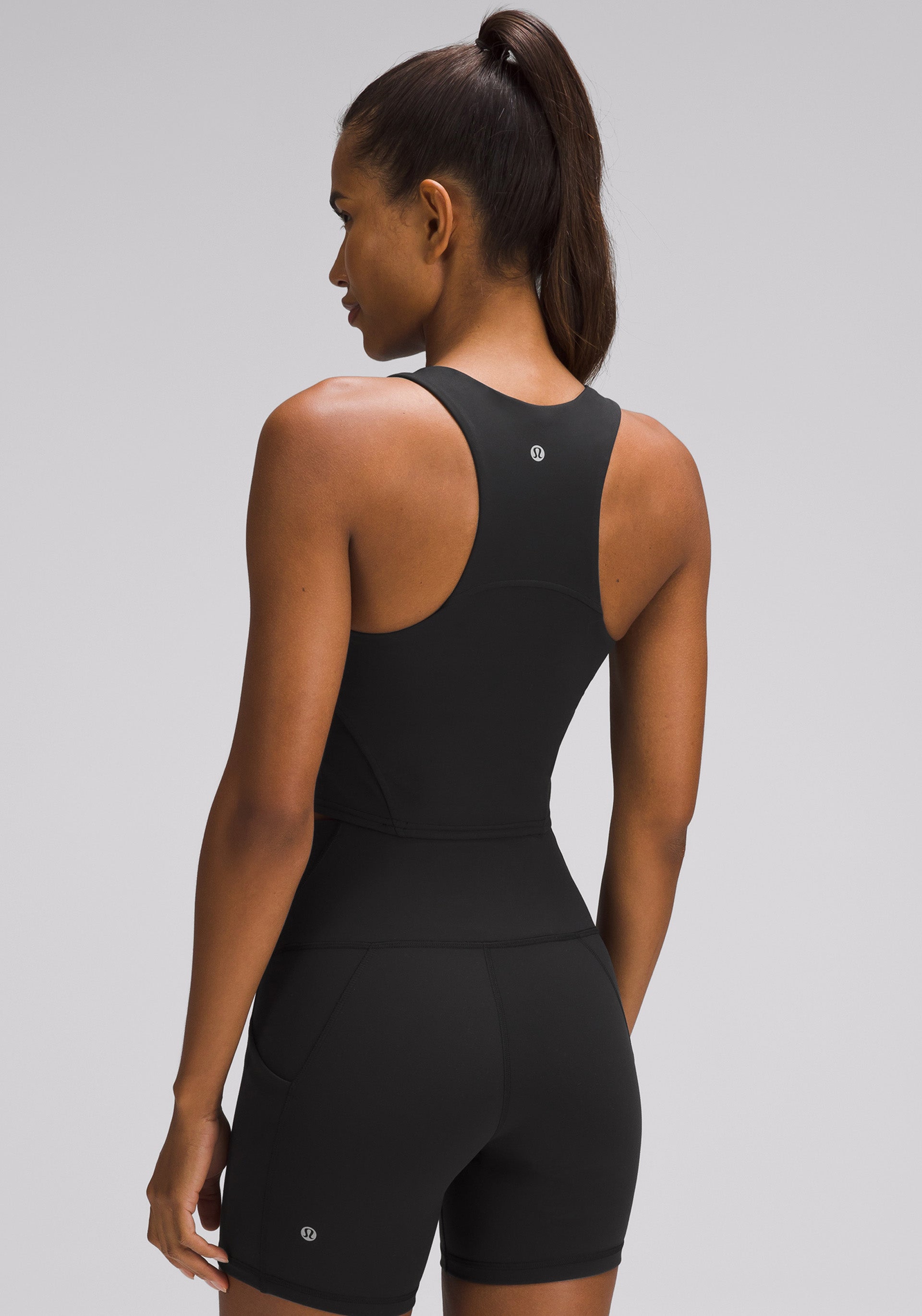 Medium support, racerback tank with built-in shelf bra for added support and pockets for removable cups